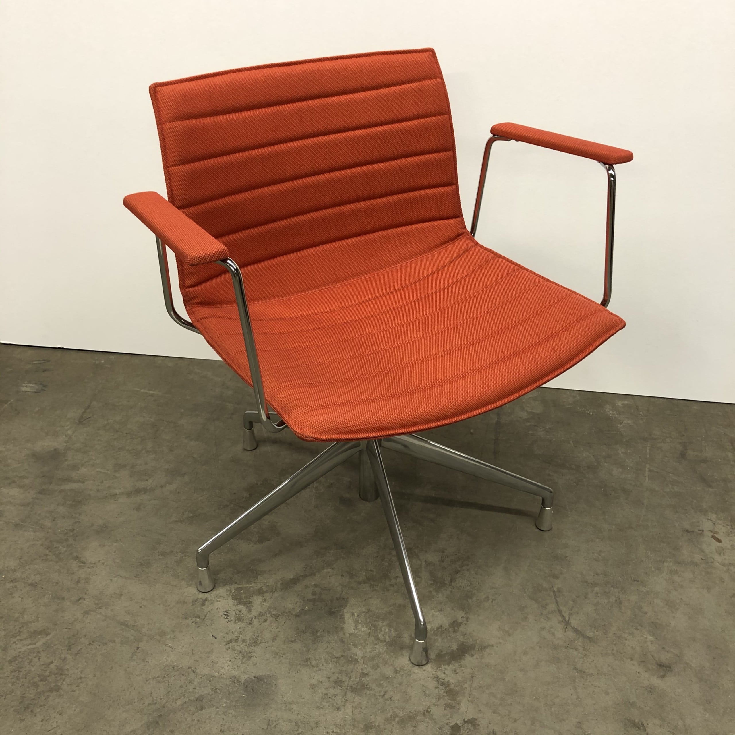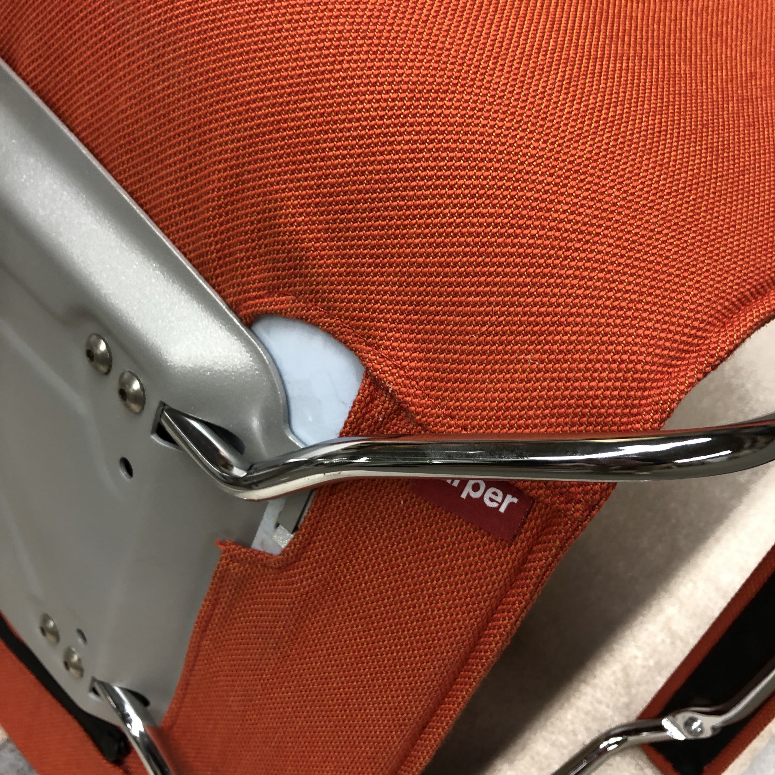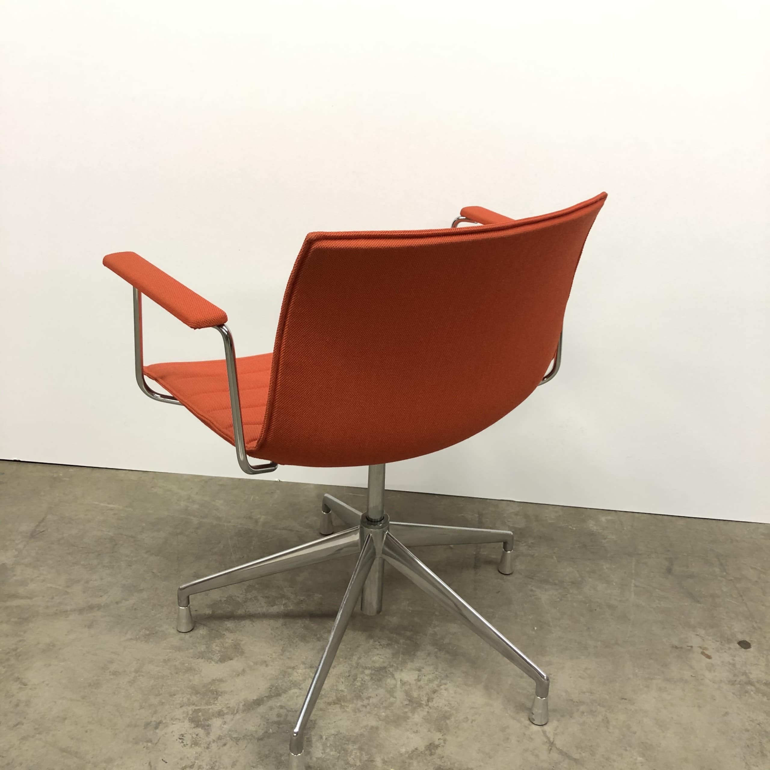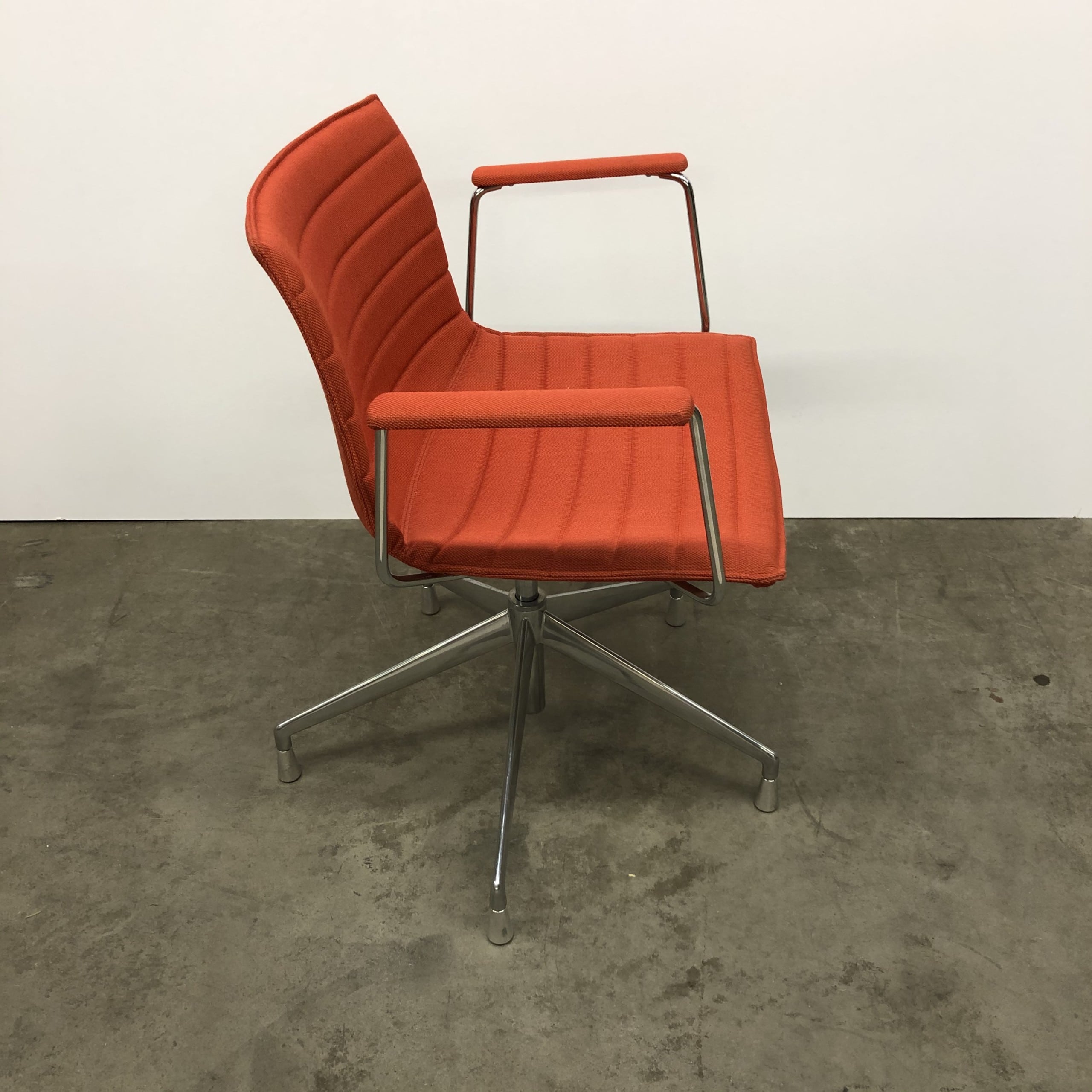Sete og rygg i stoff (oransje). Kryssfot i metall (aluminium).