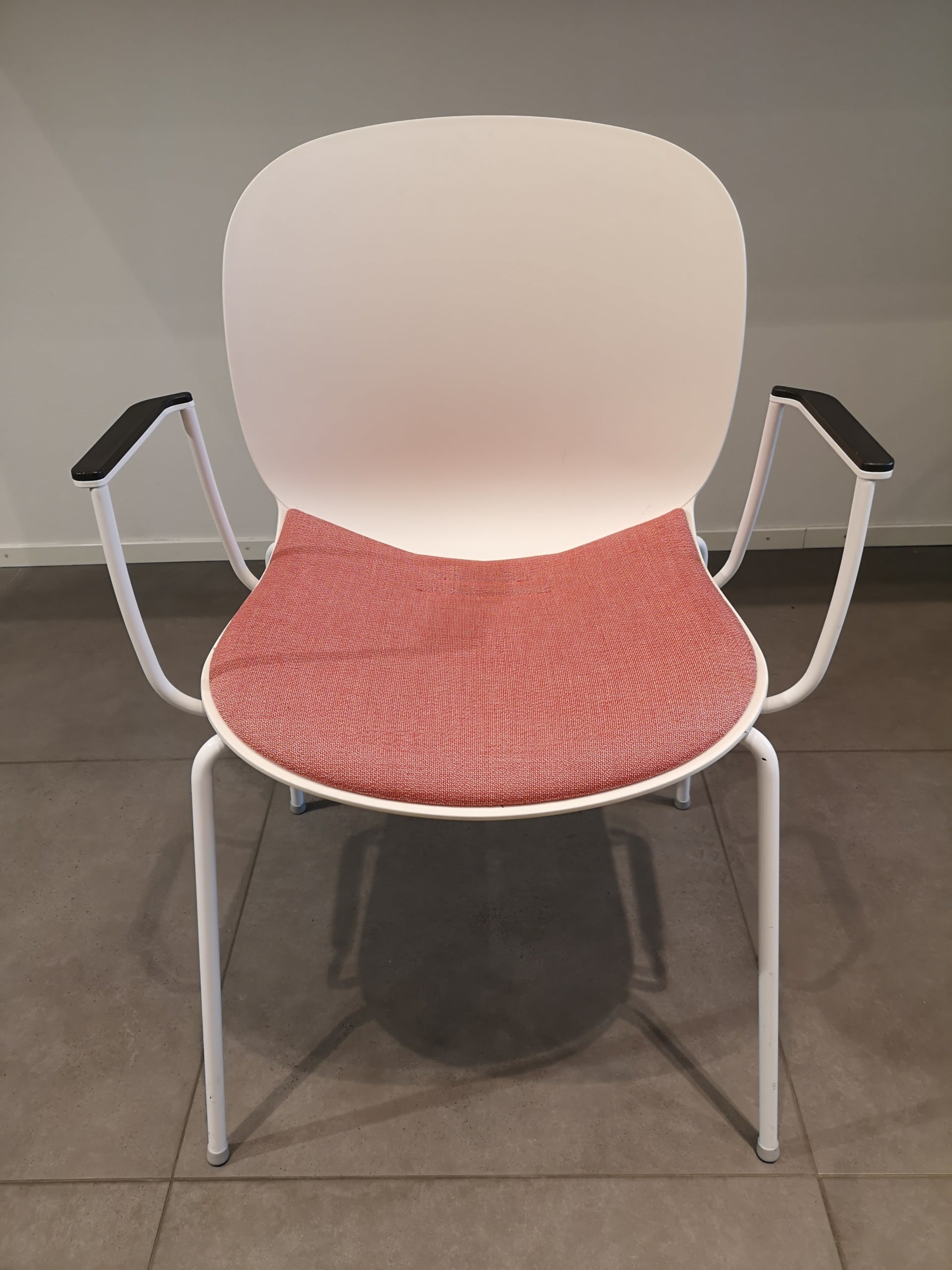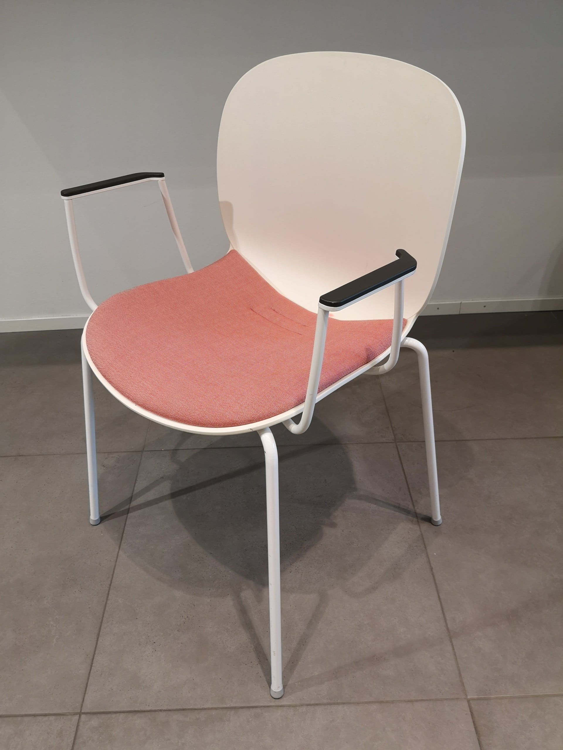 Sete i stoff (rosa). Rygg i plast (hvit). Ben i metall (hvit).