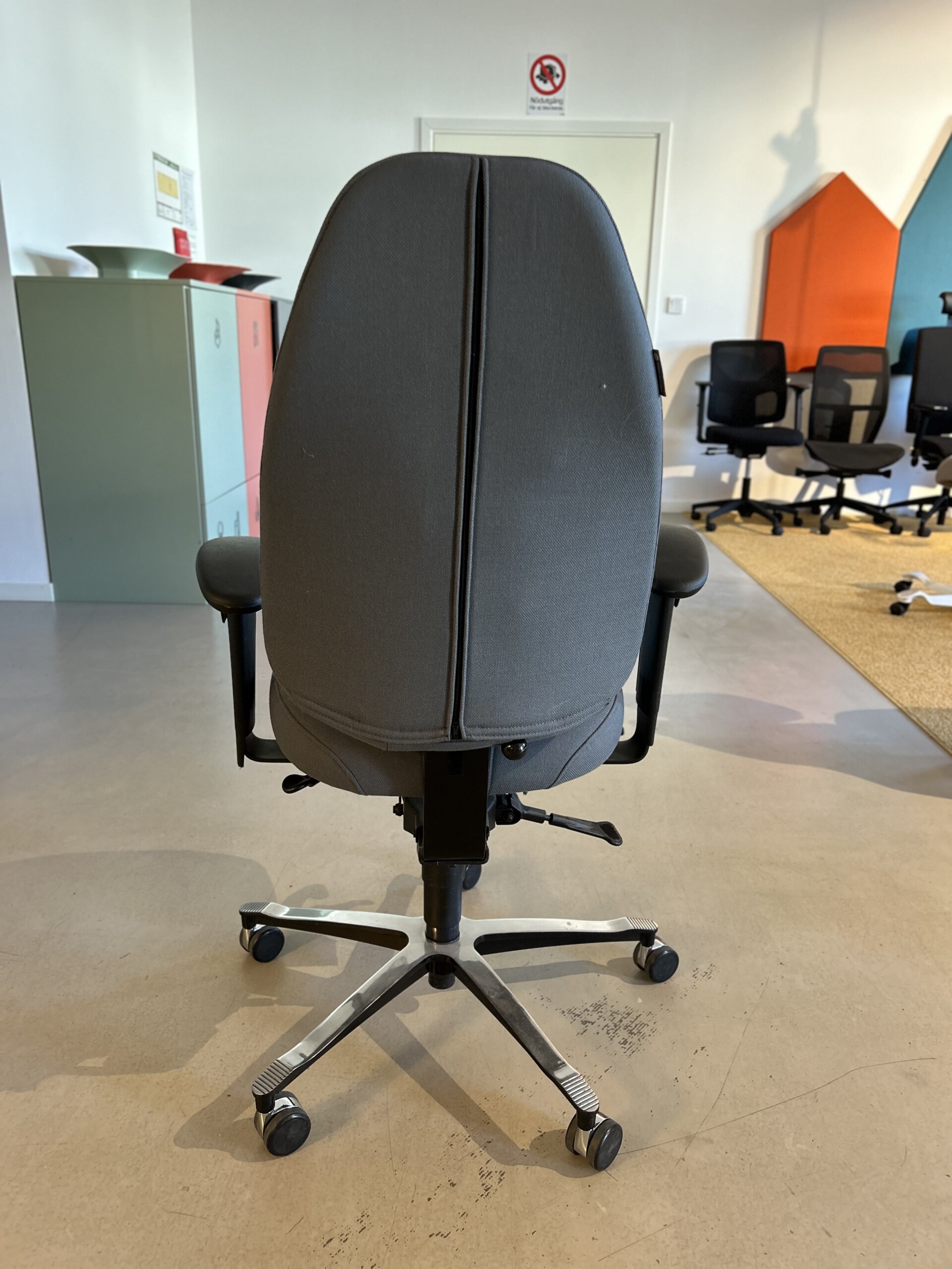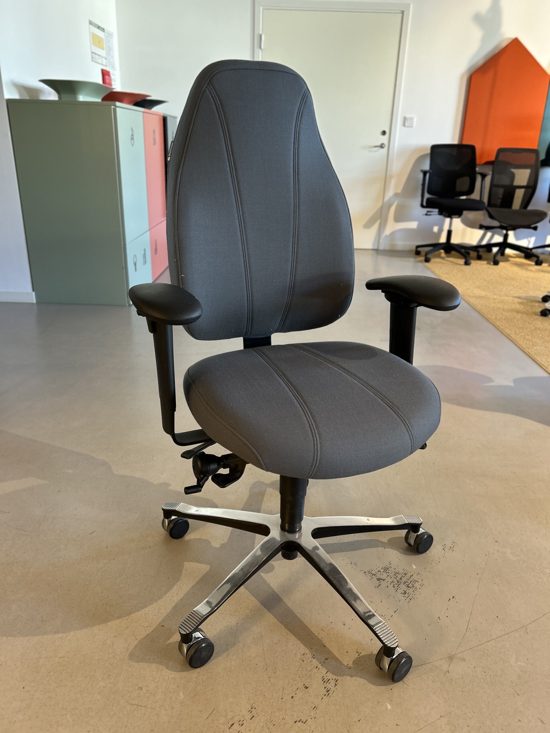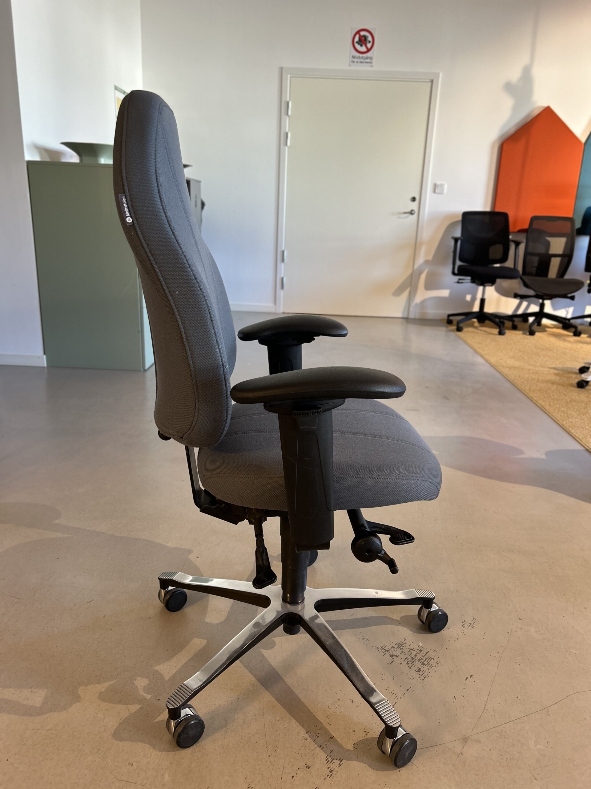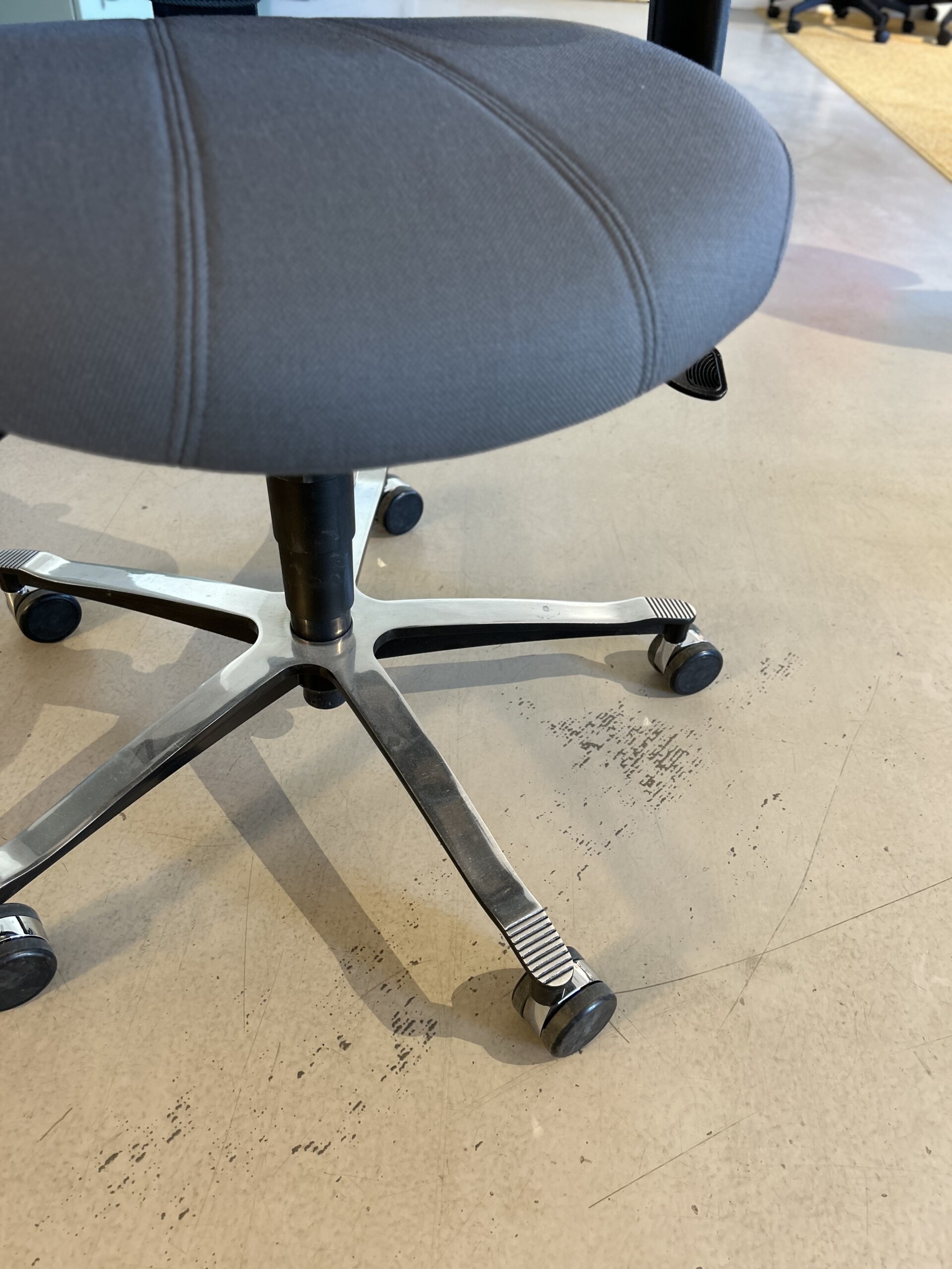 Sete og rygg i stoff (grå). Kryssfot i metall (aluminium). Høydejusterbar