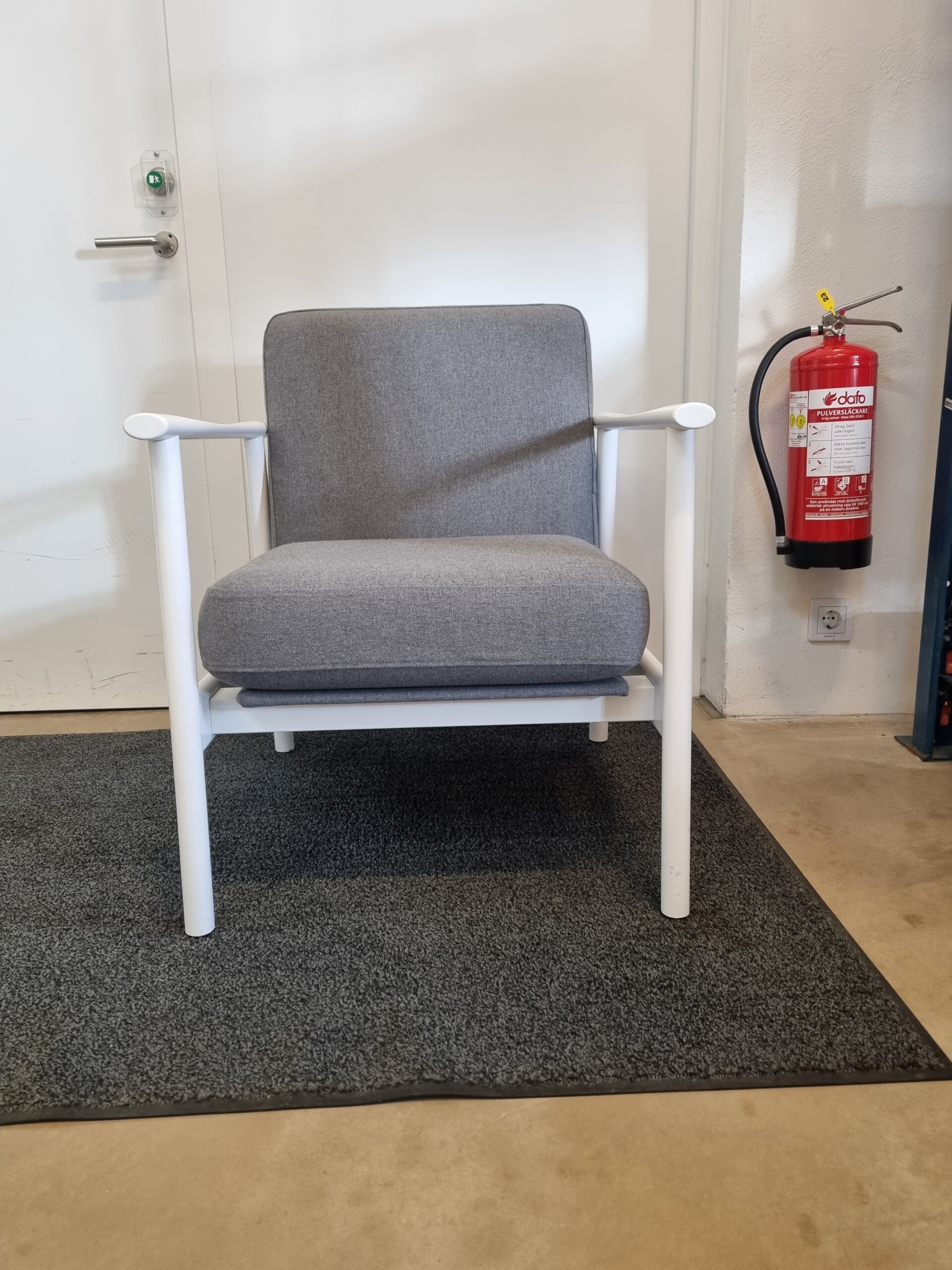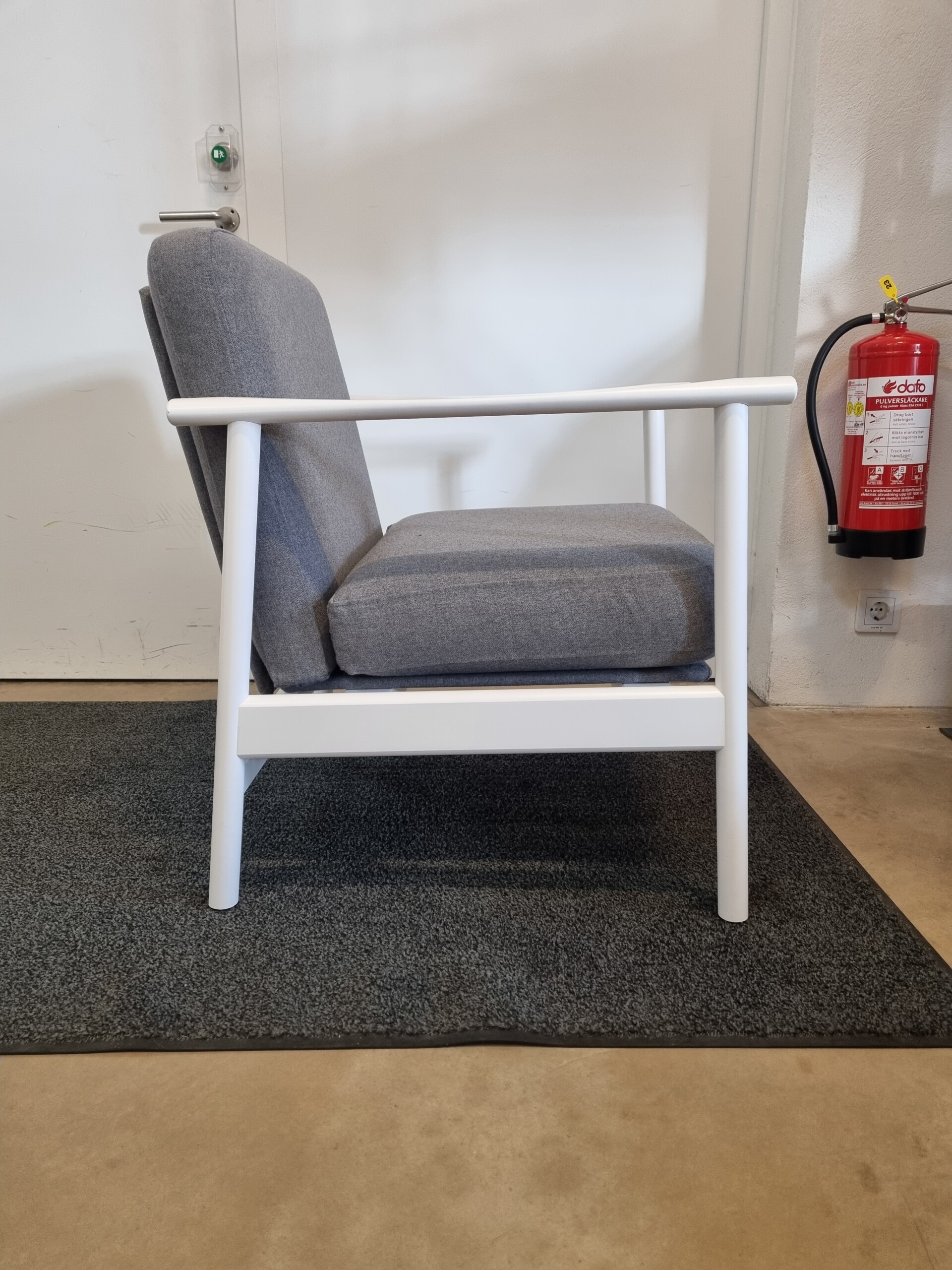 Sete og rygg i stoff (grå). Ben i tre (hvit).