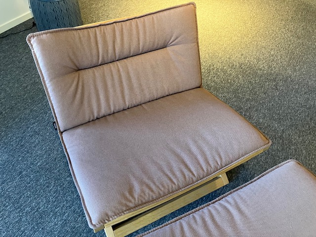 Sete og rygg i stoff (rosa). Meiestativ i tre (eik).