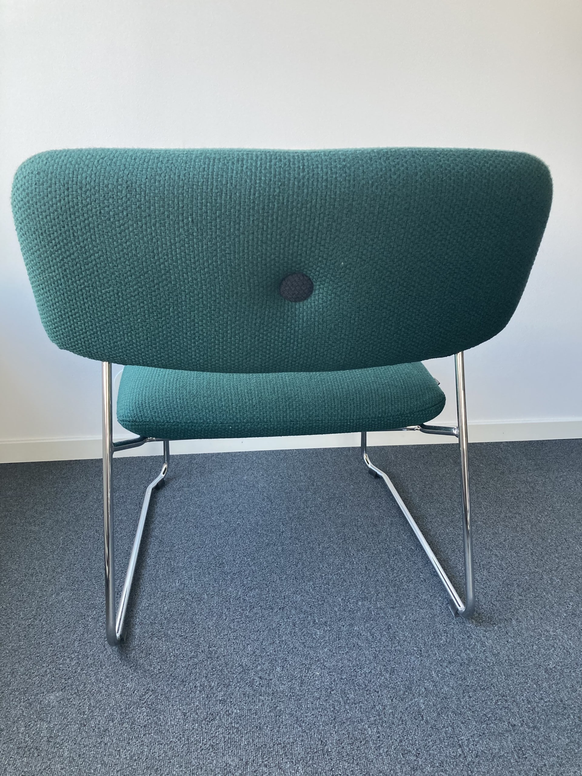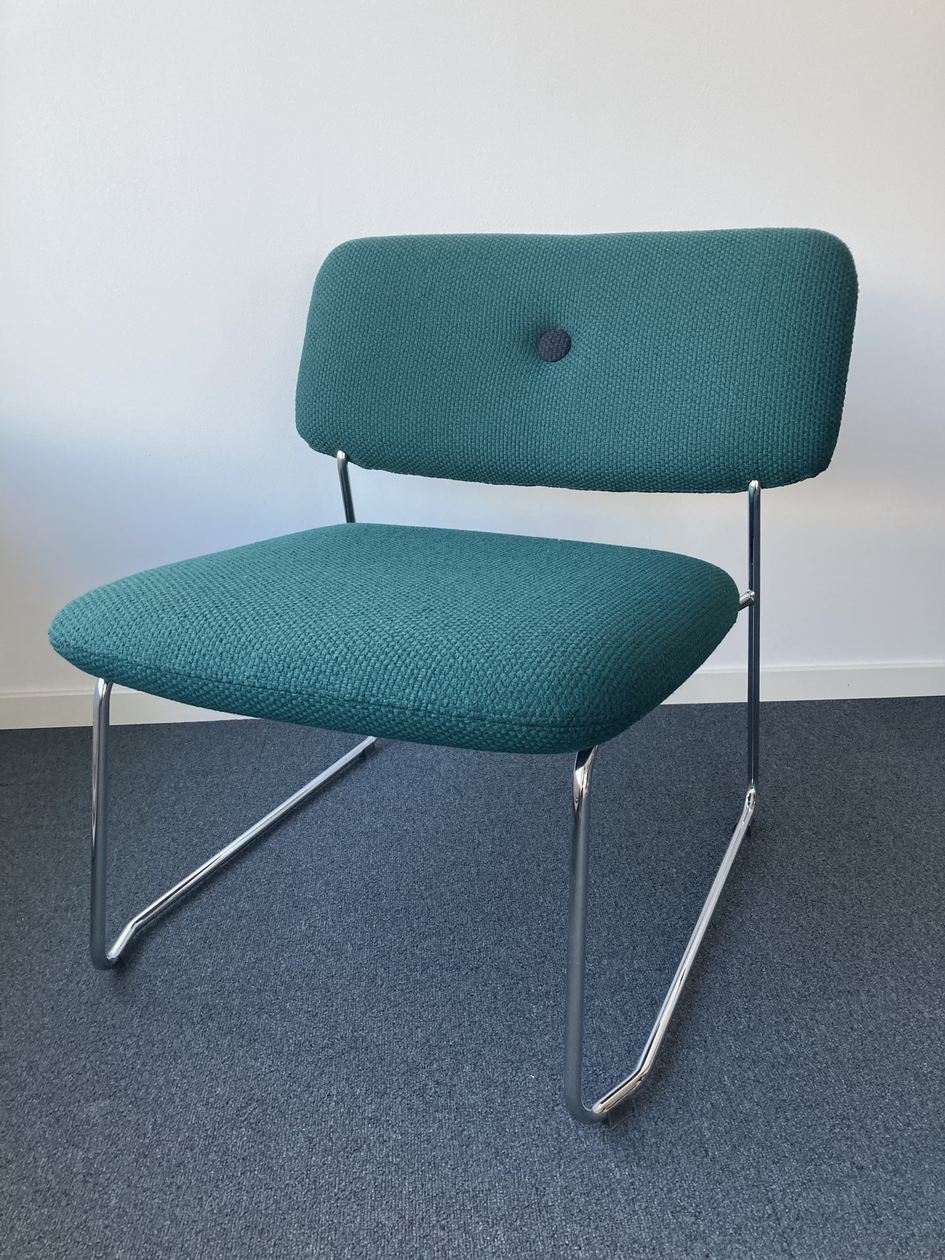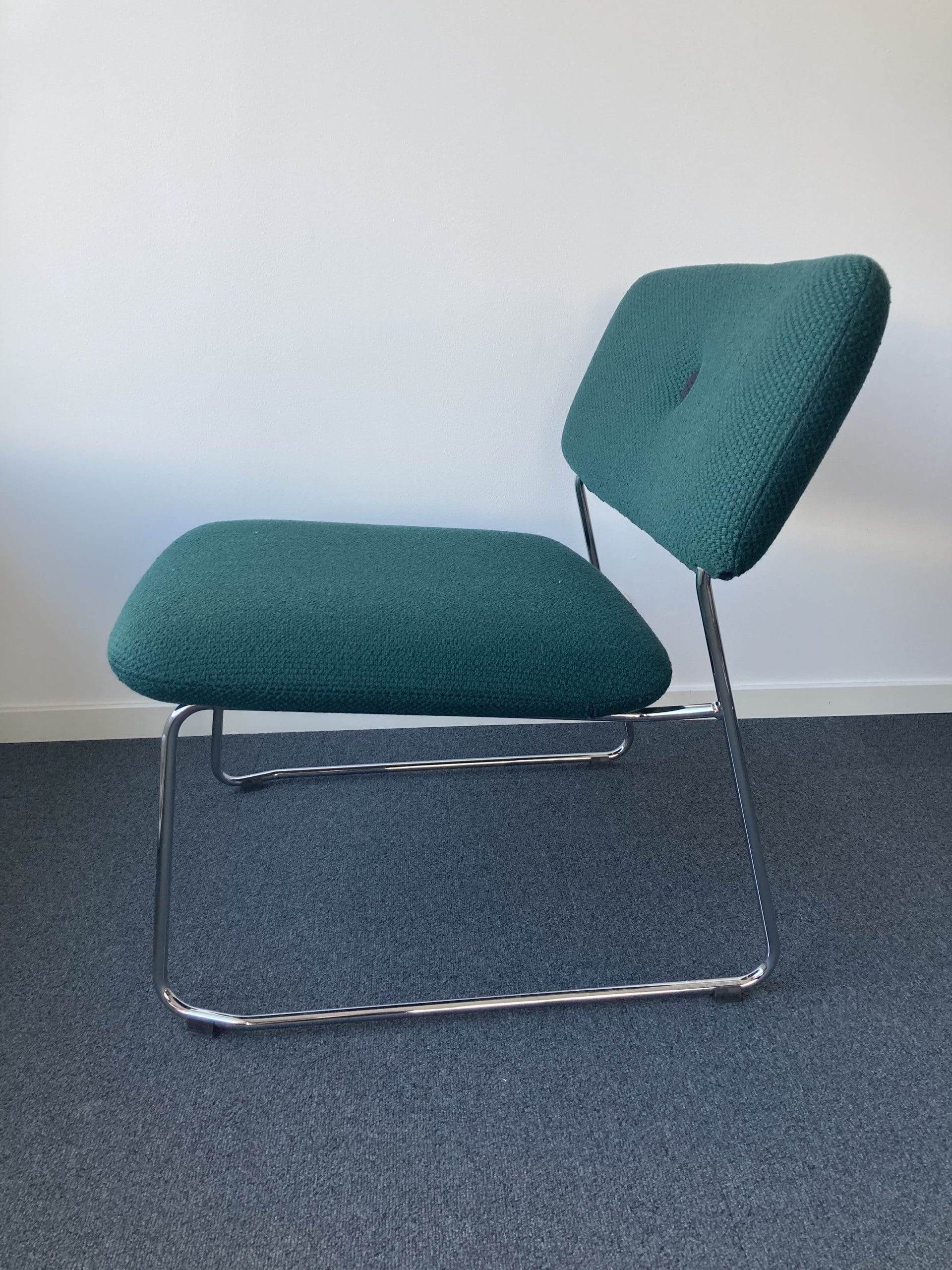 Sete og rygg i stoff (grønn). Meiestativ i metall (krom).
