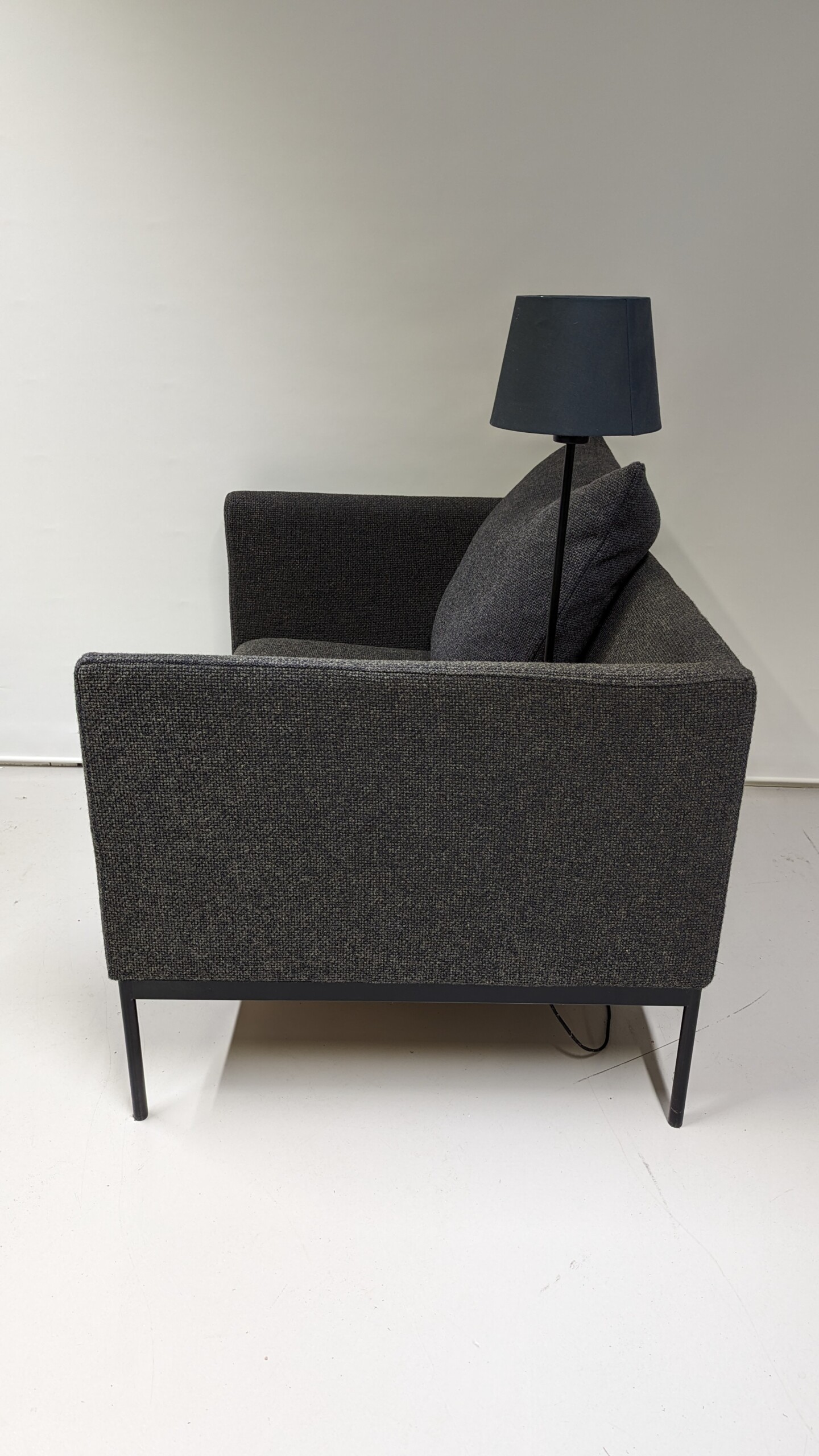 Sete og rygg i stoff (grå). Ben i metall (svart).
