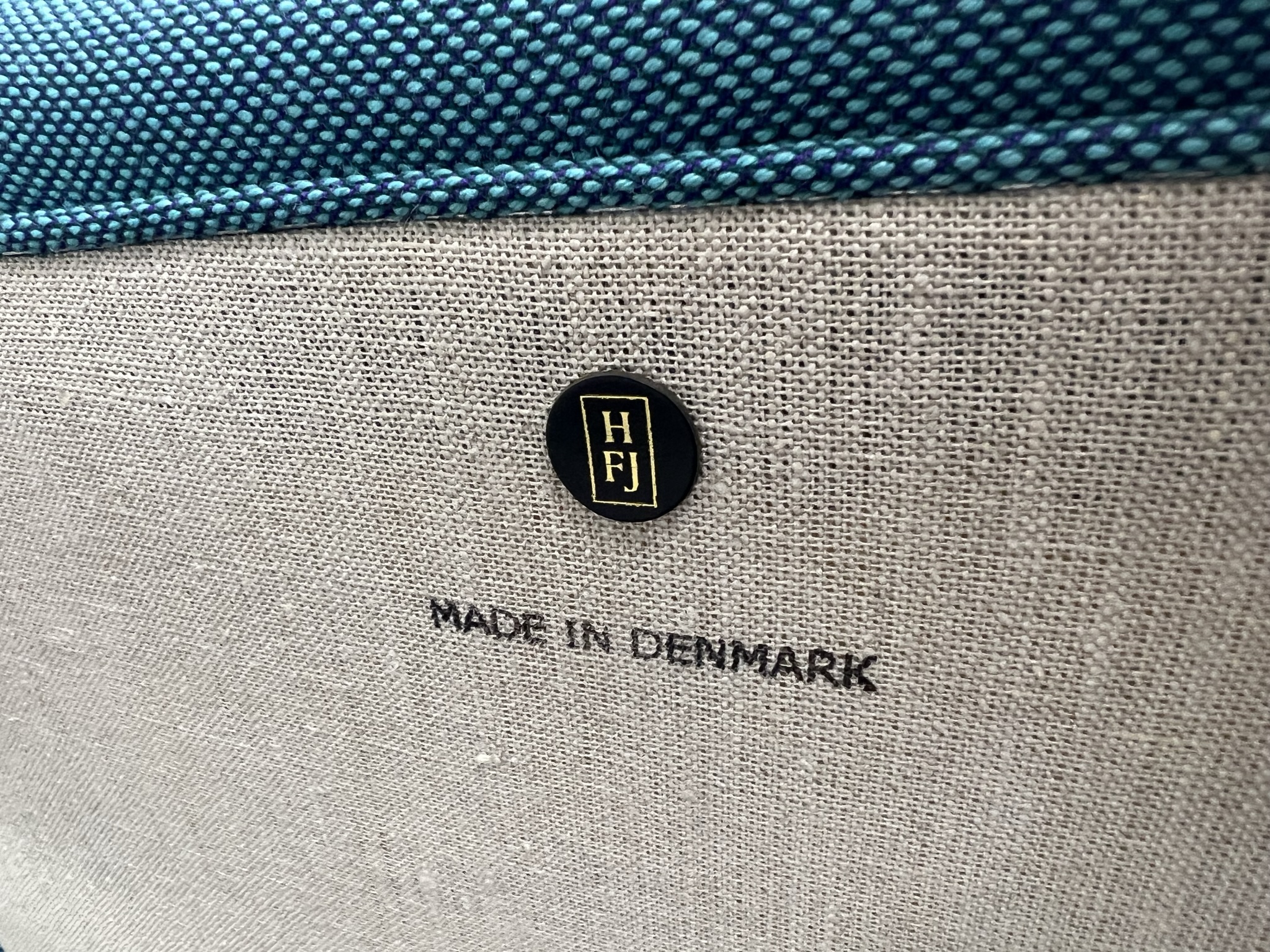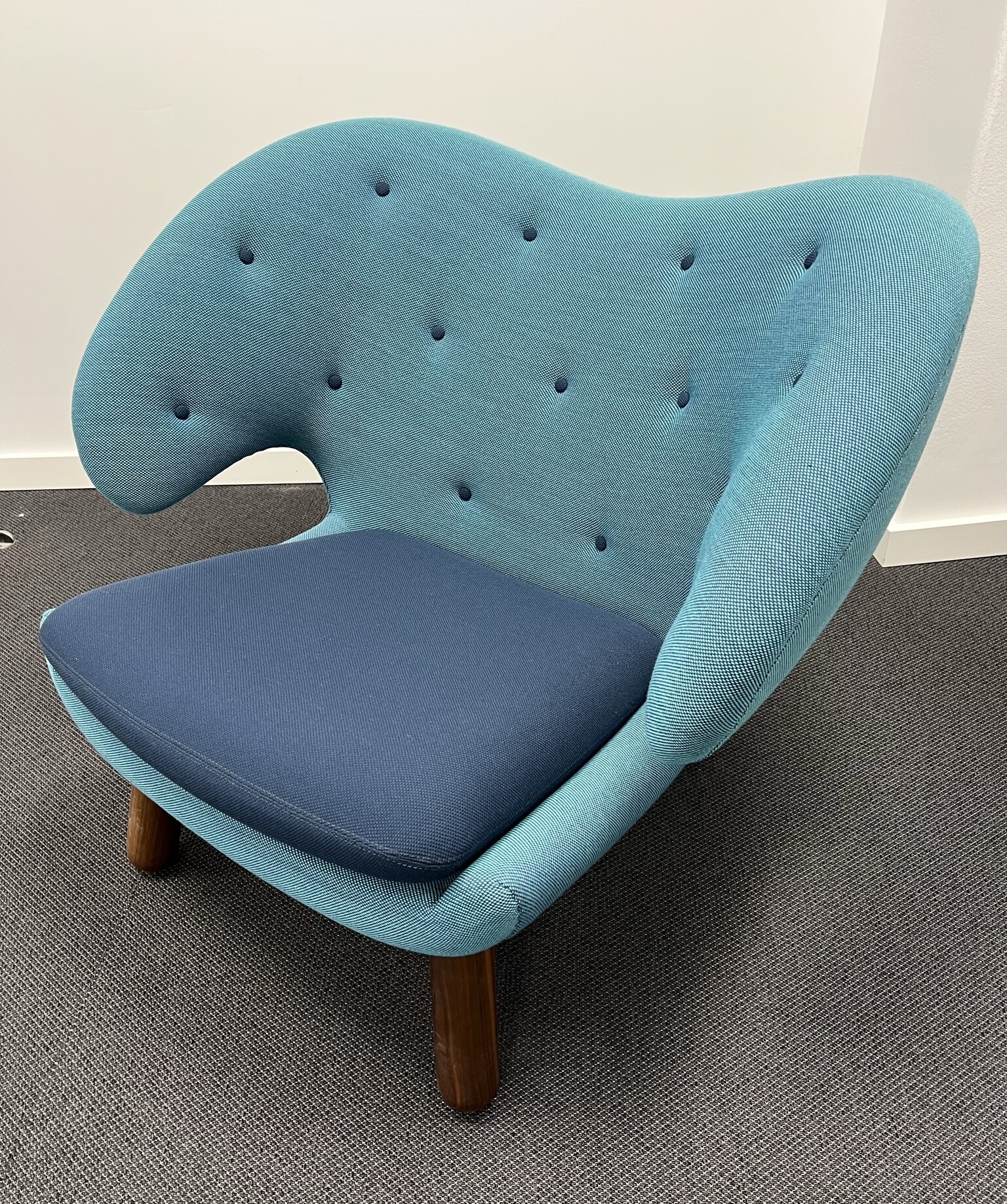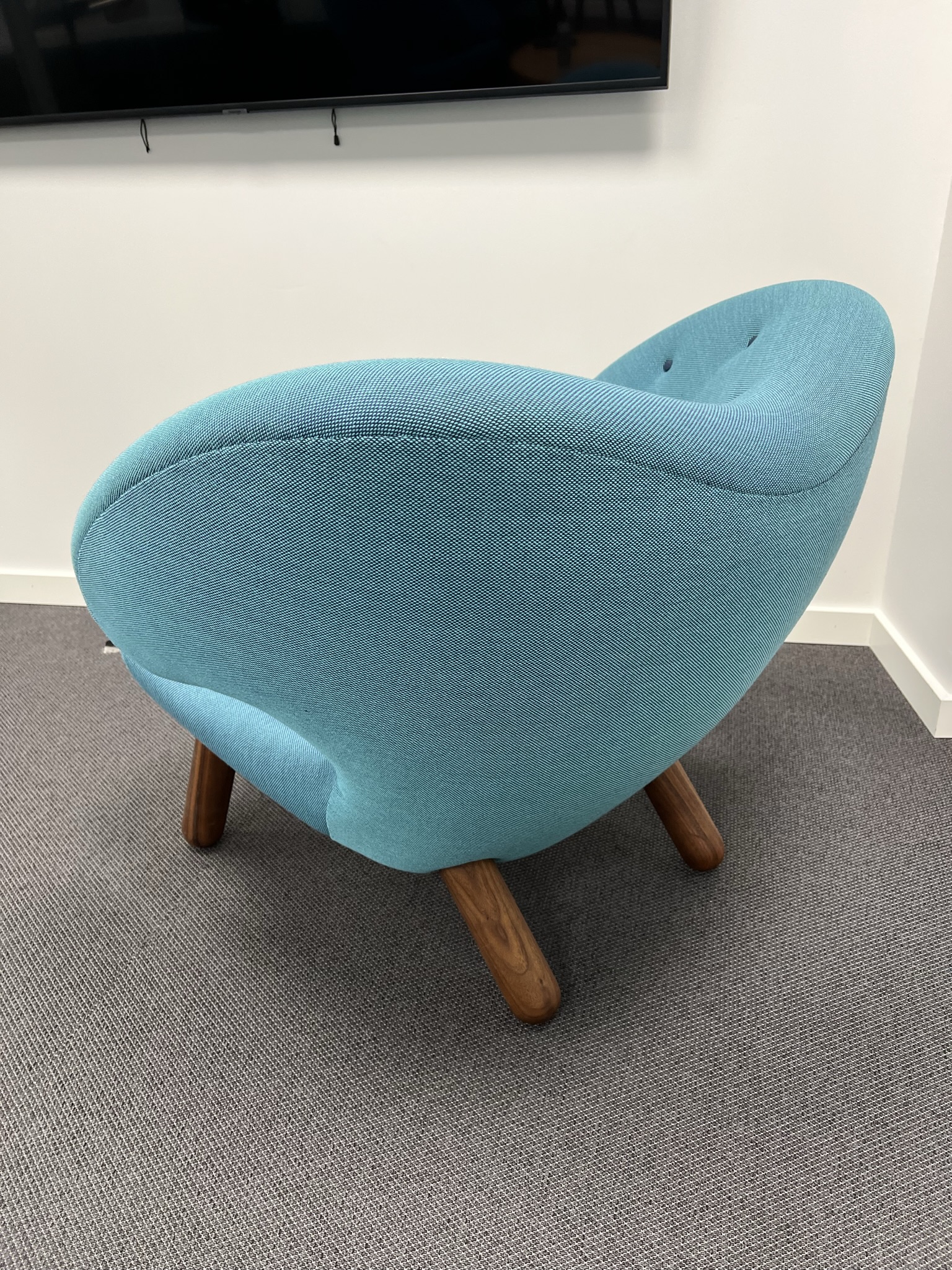 Sete i stoff (blå). Rygg i stoff (turkis). Ben i tre (valnøtt).