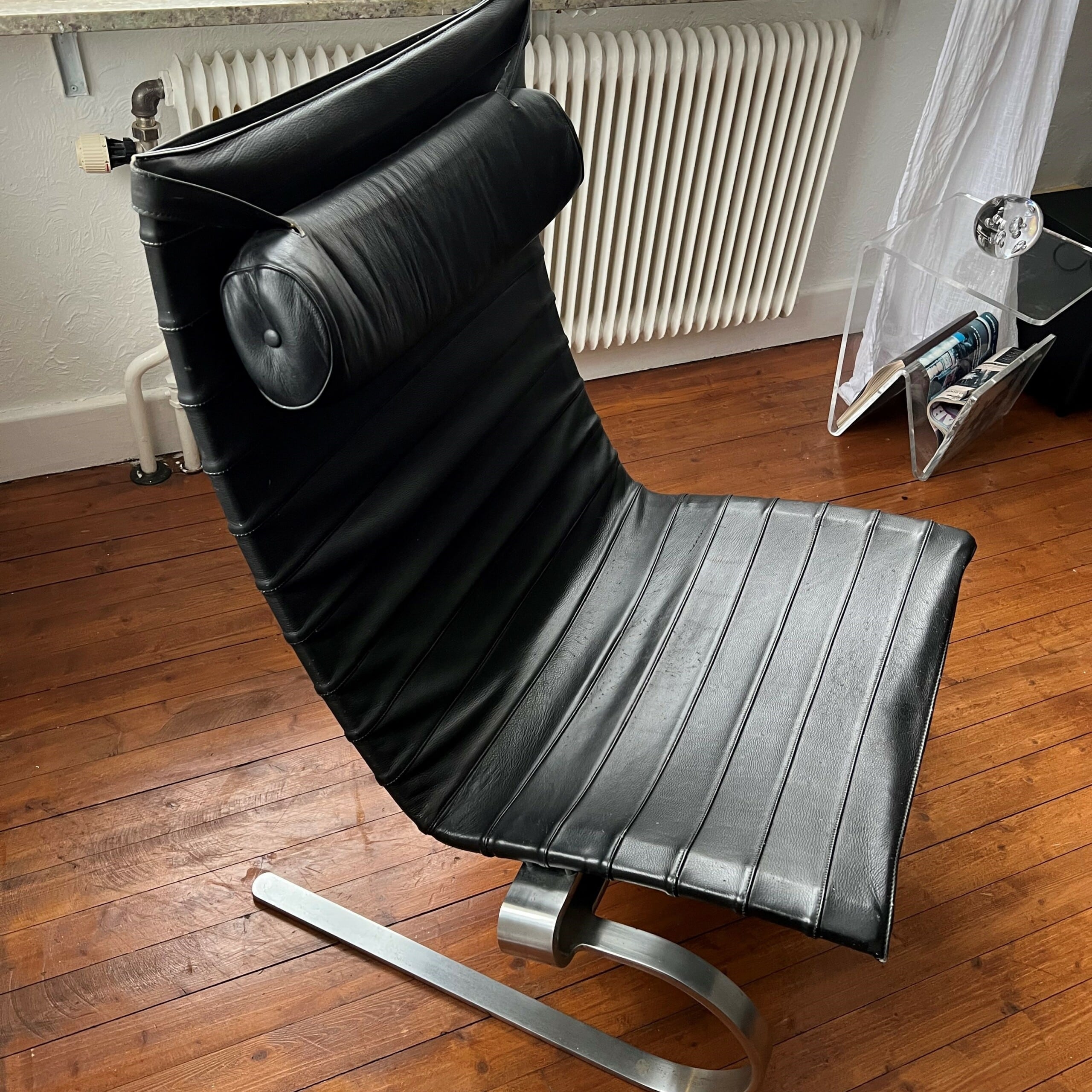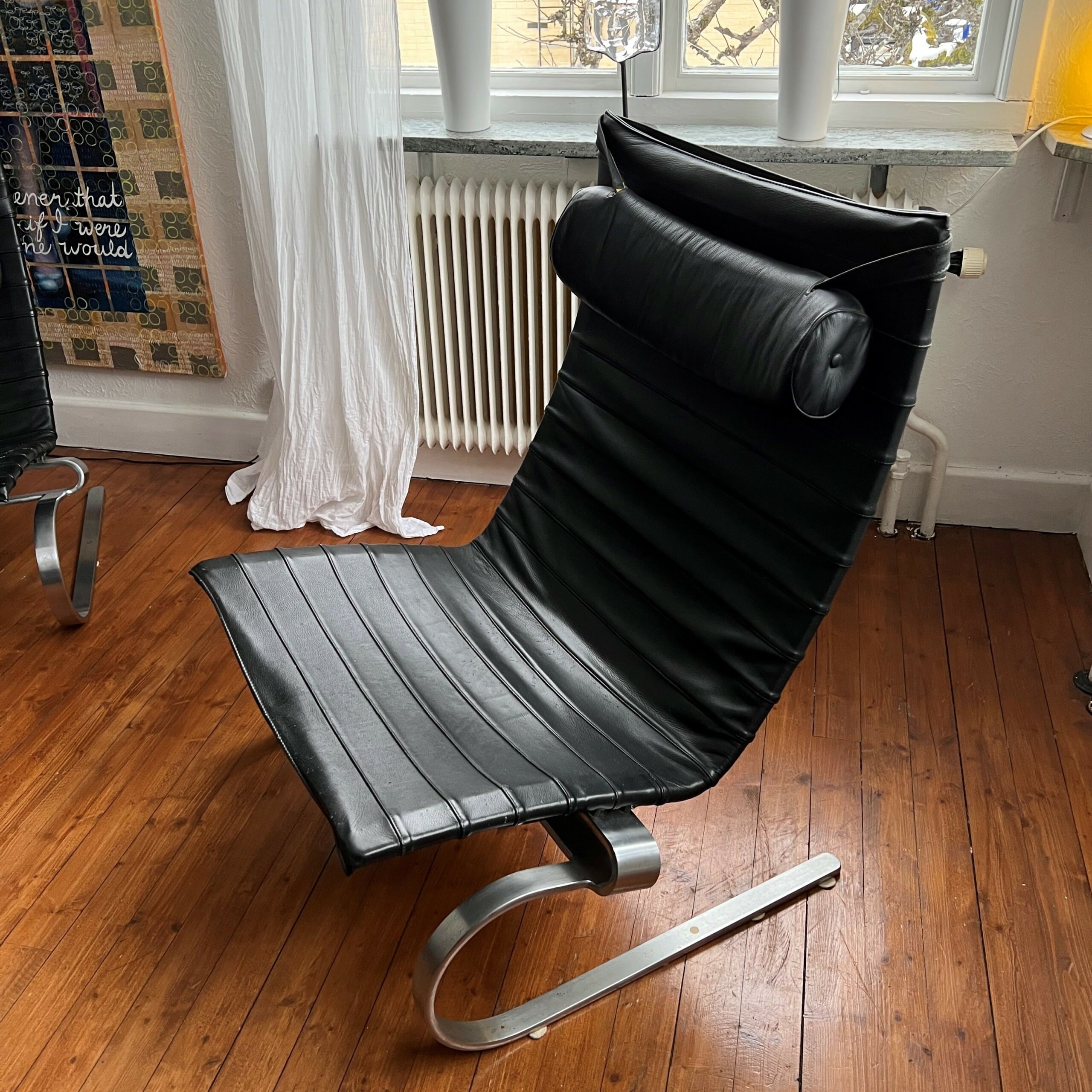 Sete og rygg i skinn (svart). Meiestativ i metall.