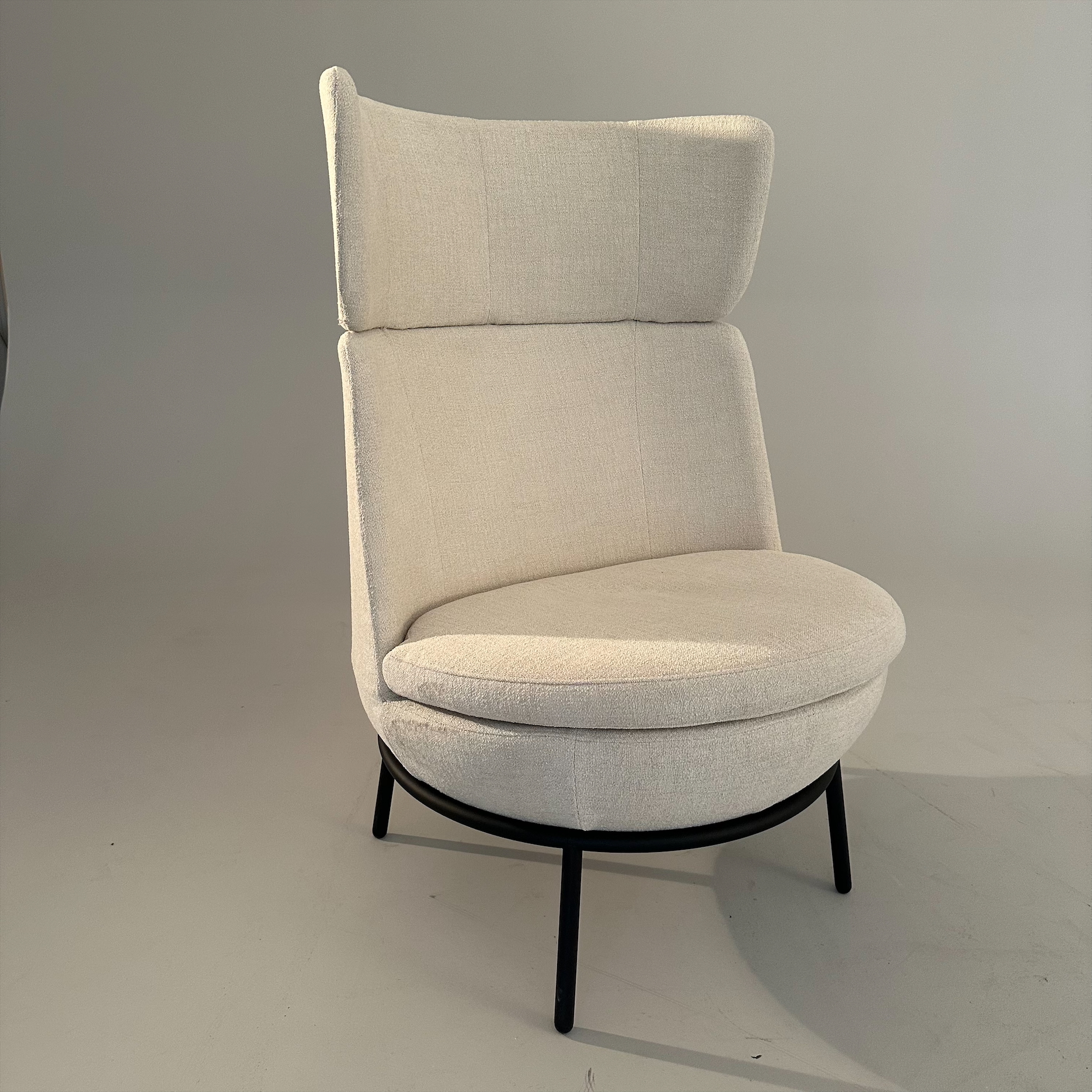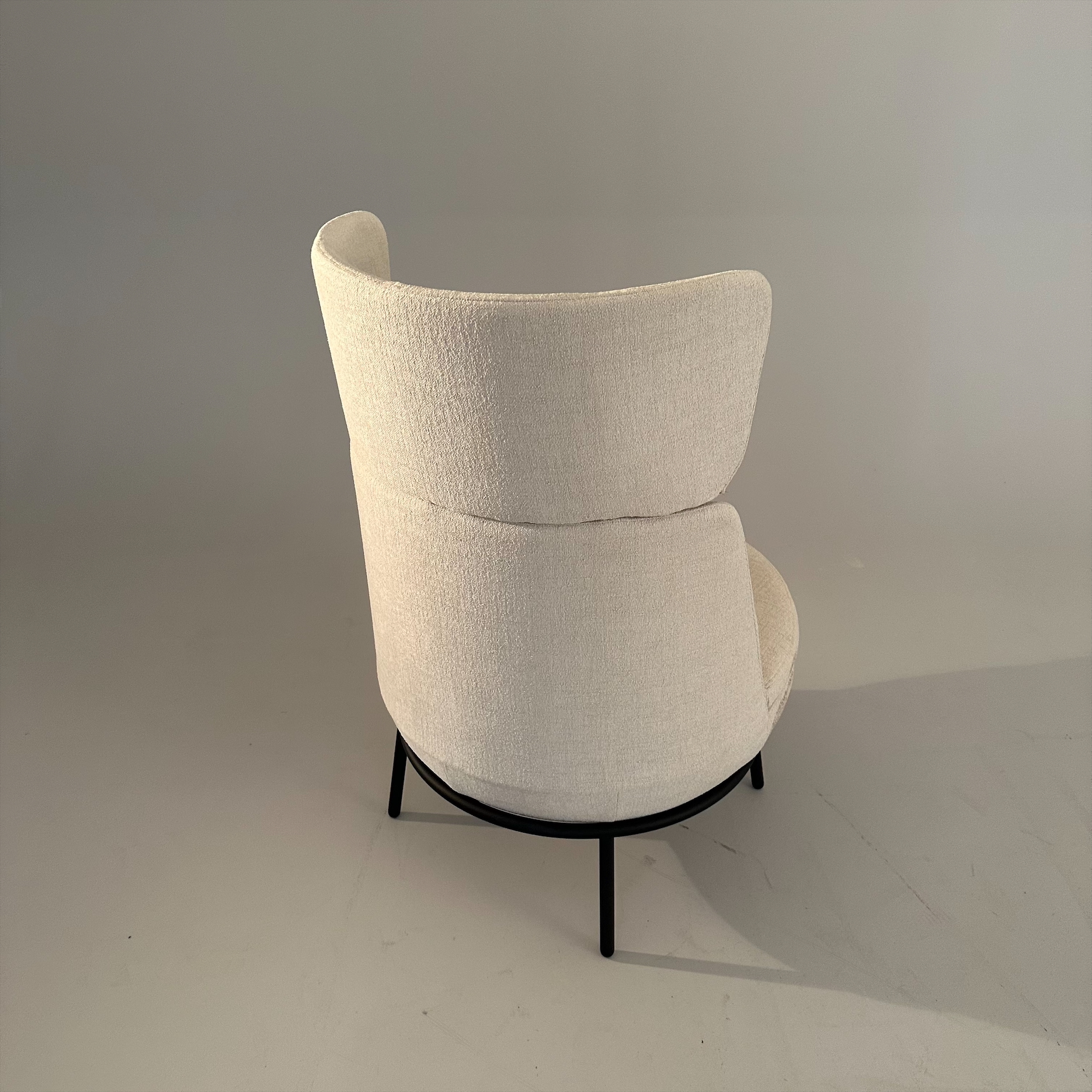 Sete og rygg i stoff (hvit). Ben i metall (svart).