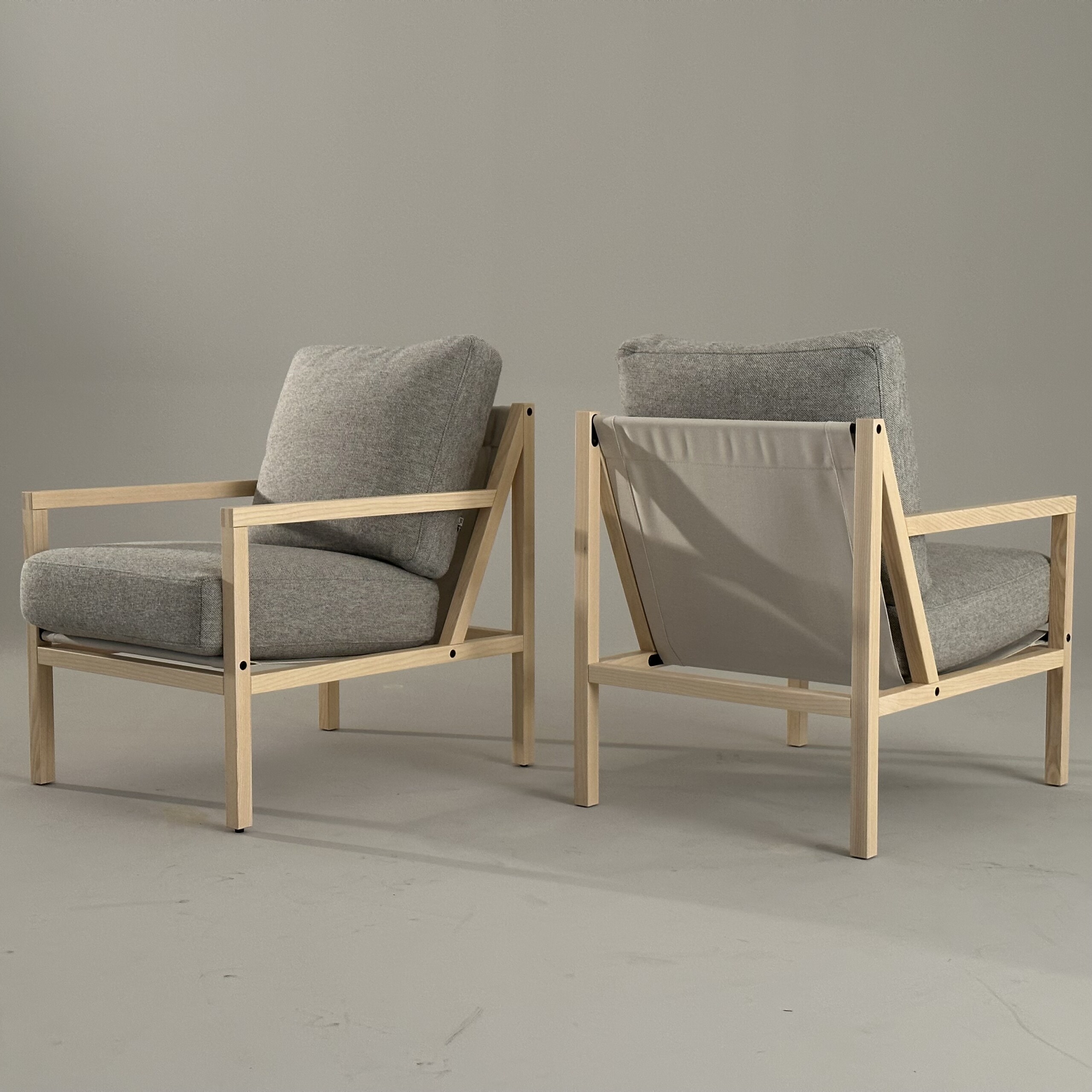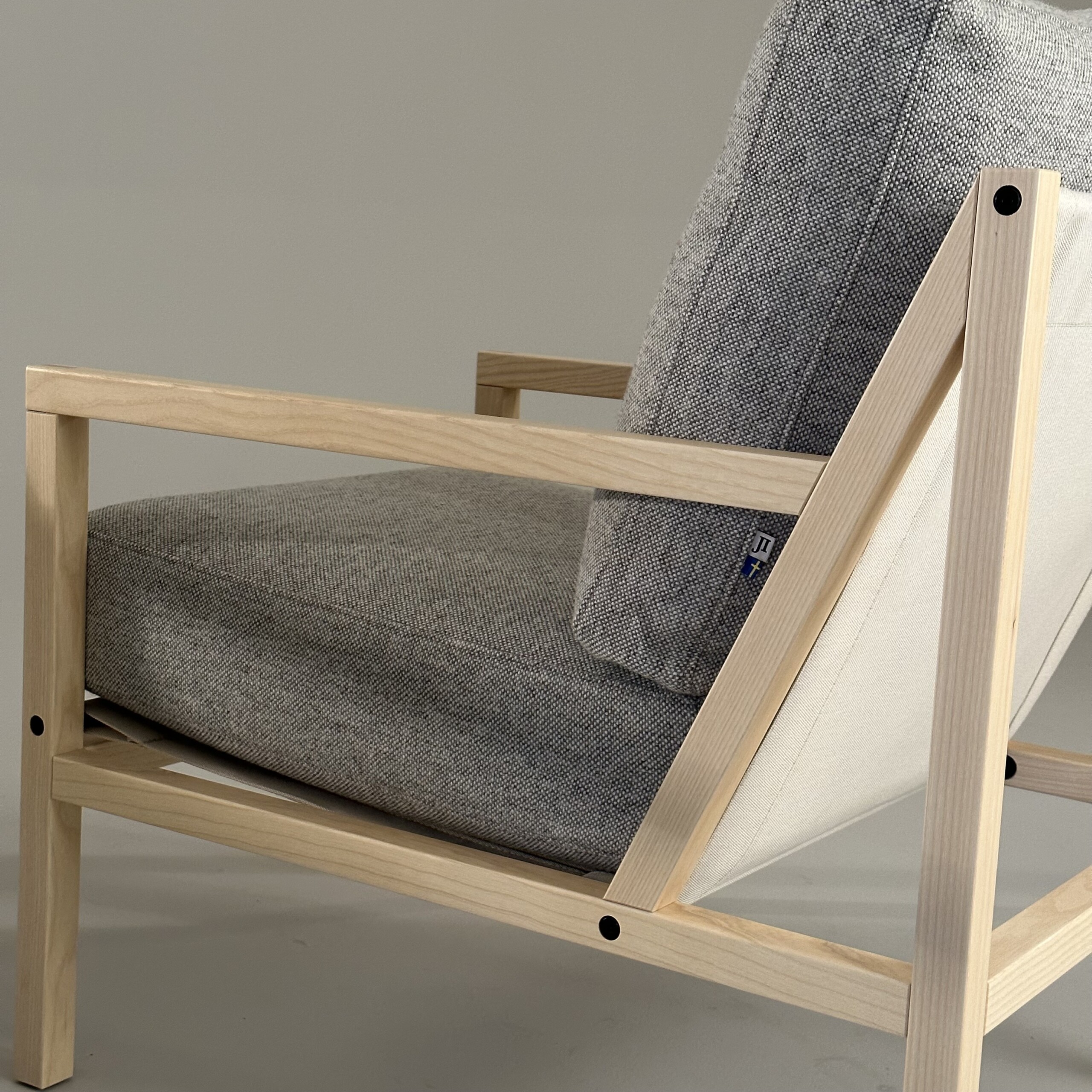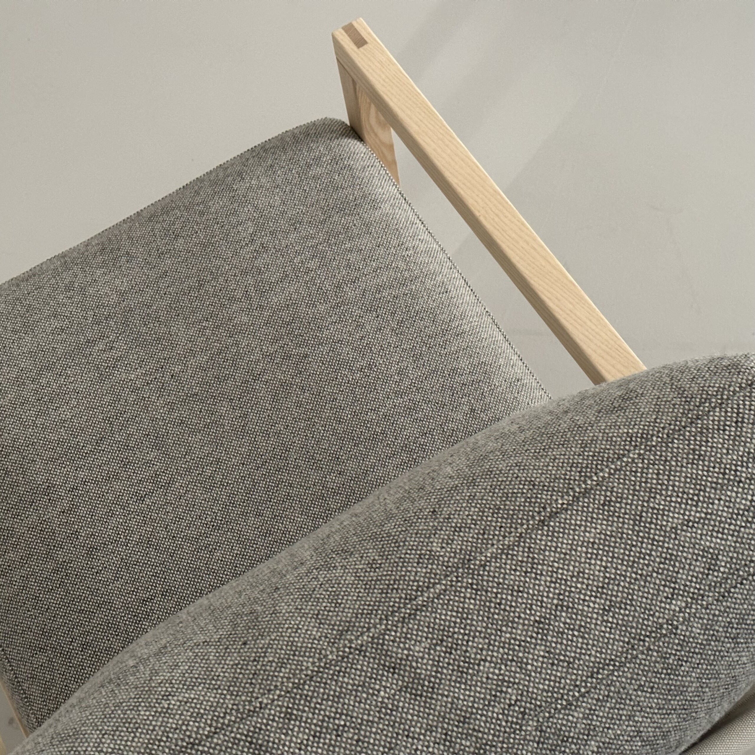 Sete og rygg i stoff (grå). Ben i tre (ask).