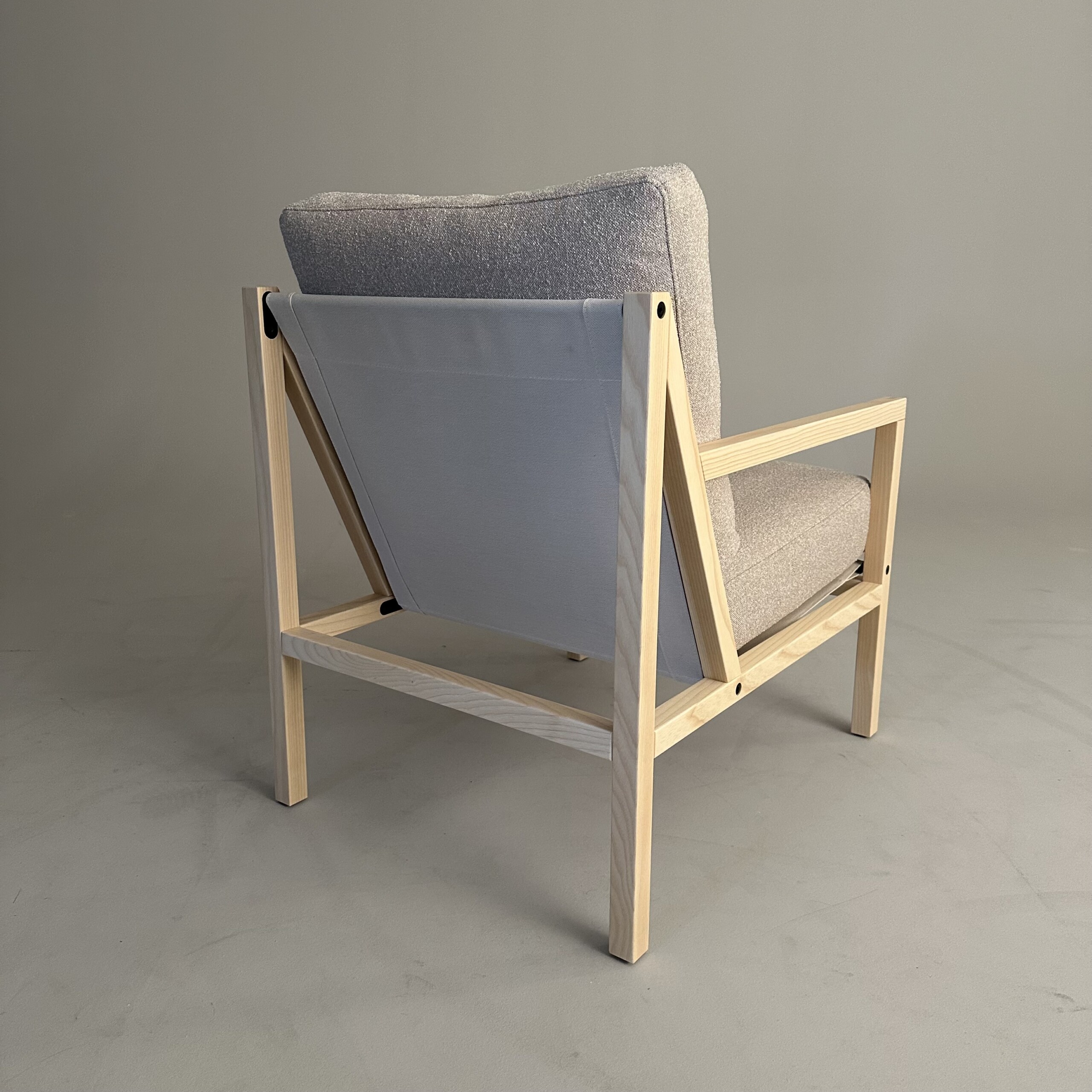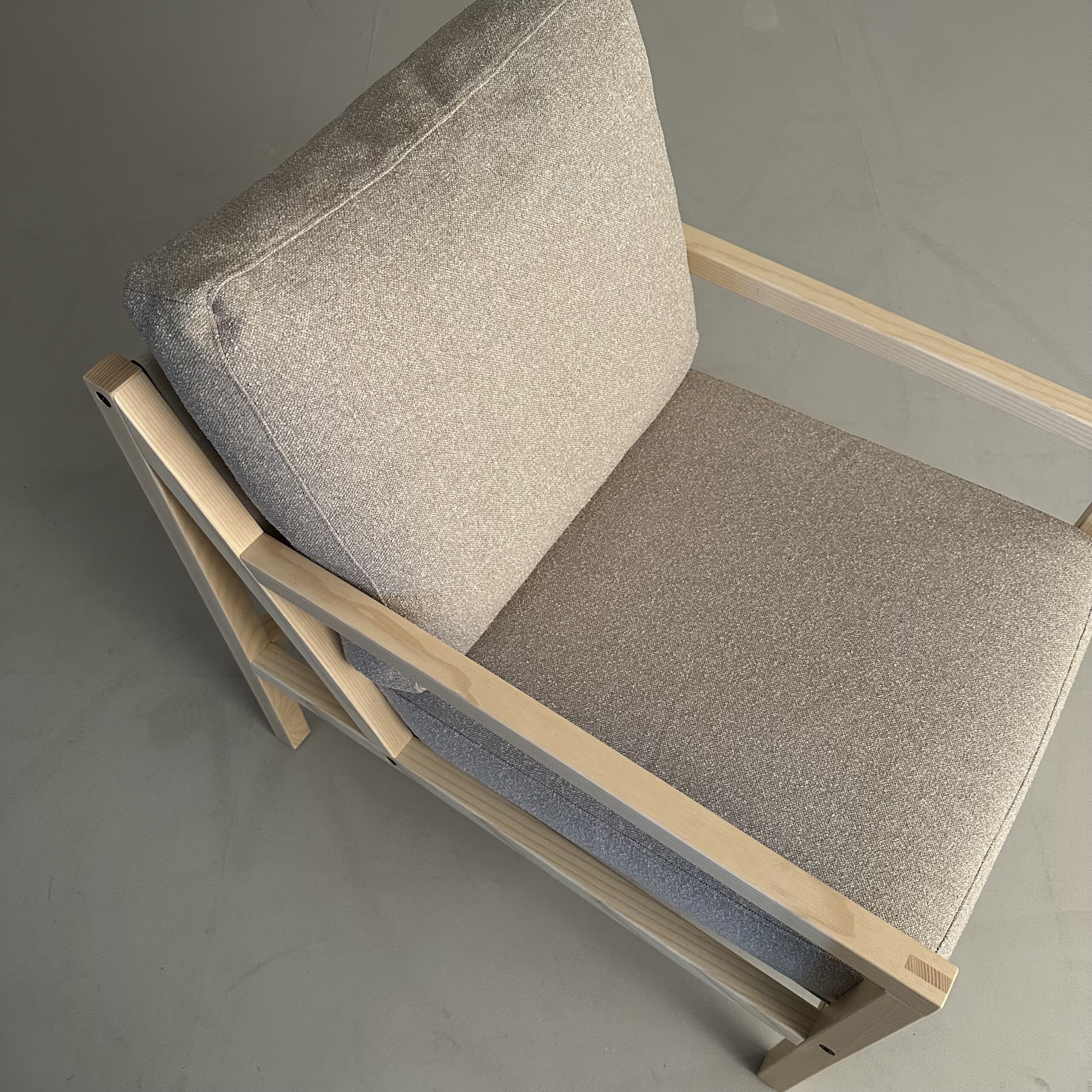 Sete og rygg i stoff (beige). Ben i tre (ask).