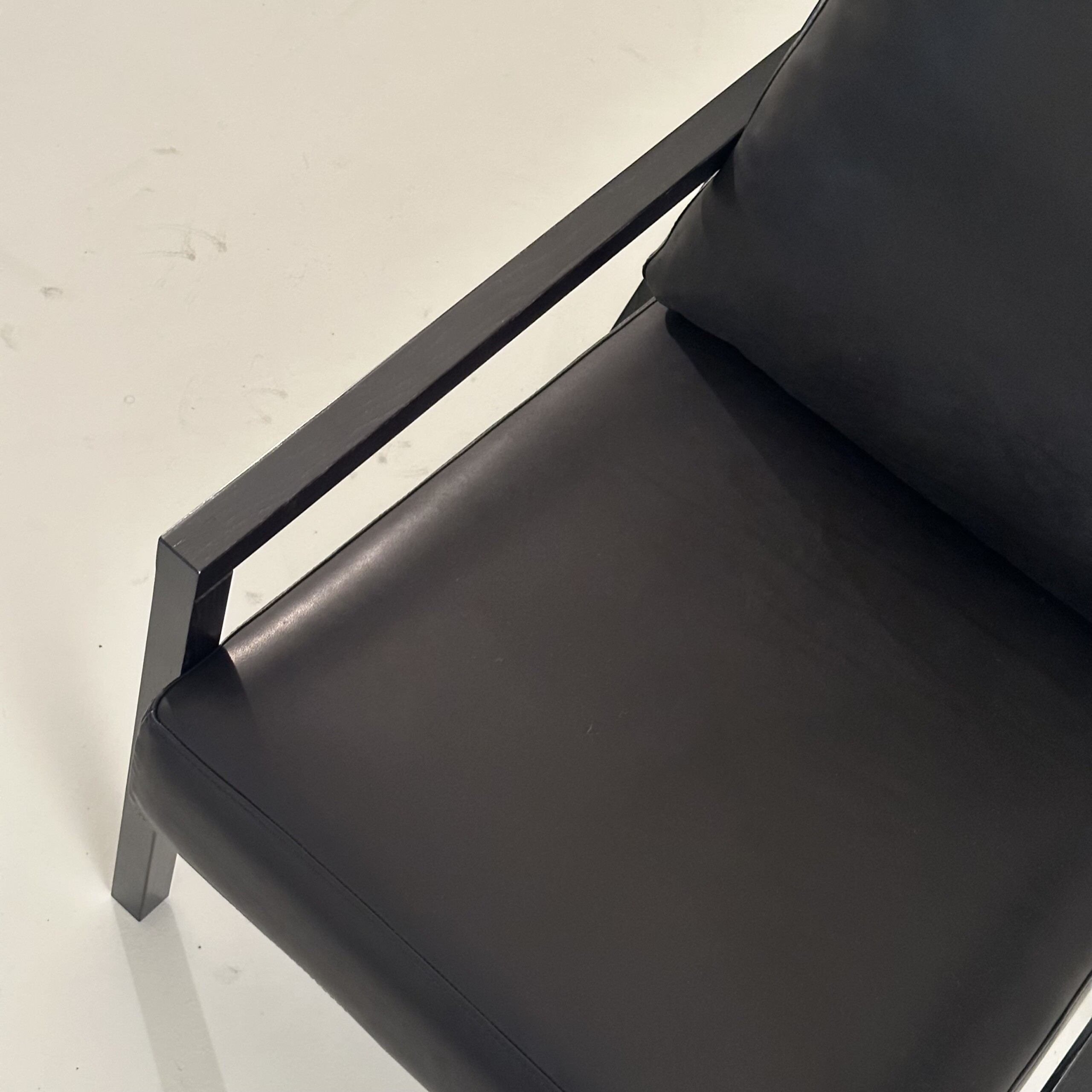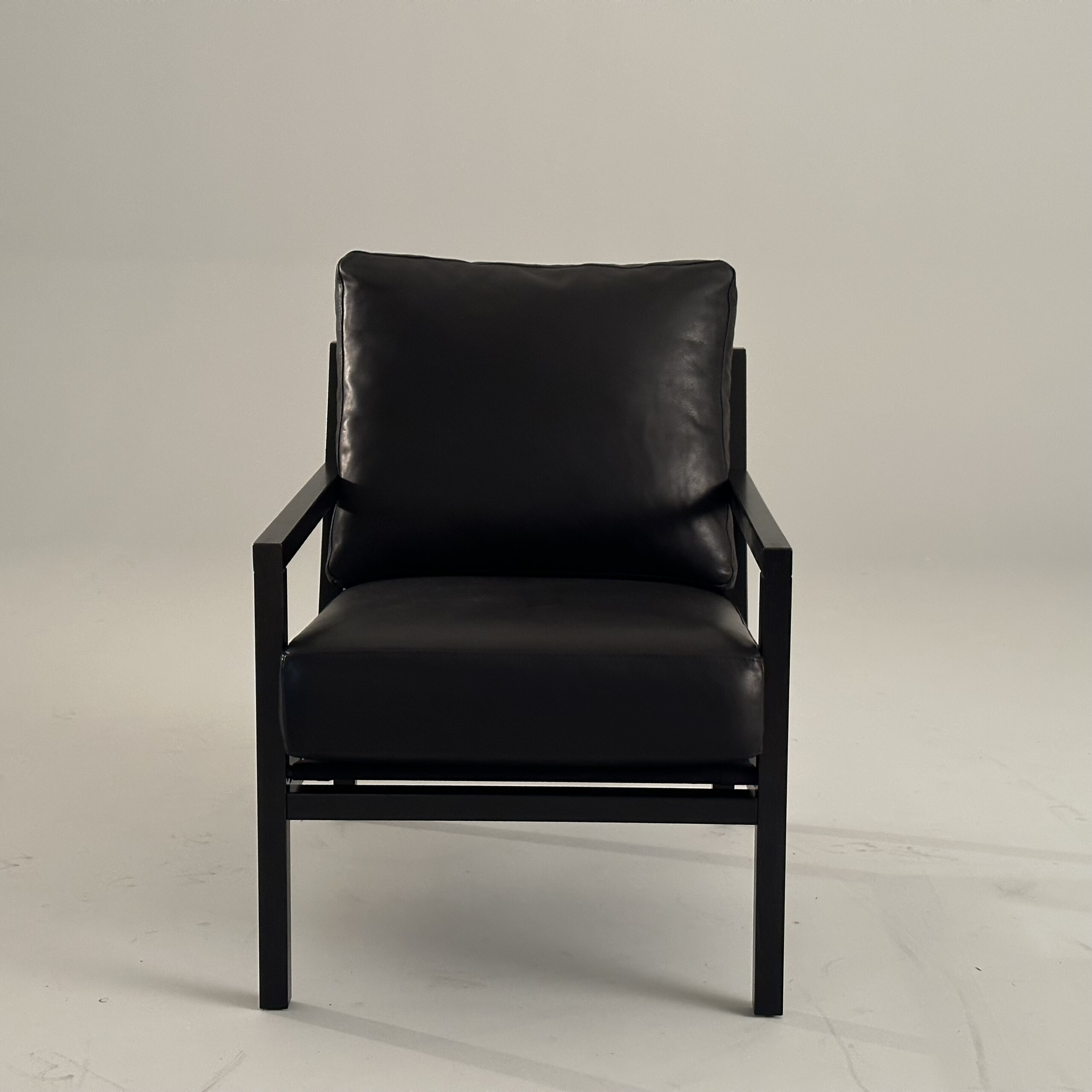 Sete og rygg i skinn (svart). Ben i tre (svart).