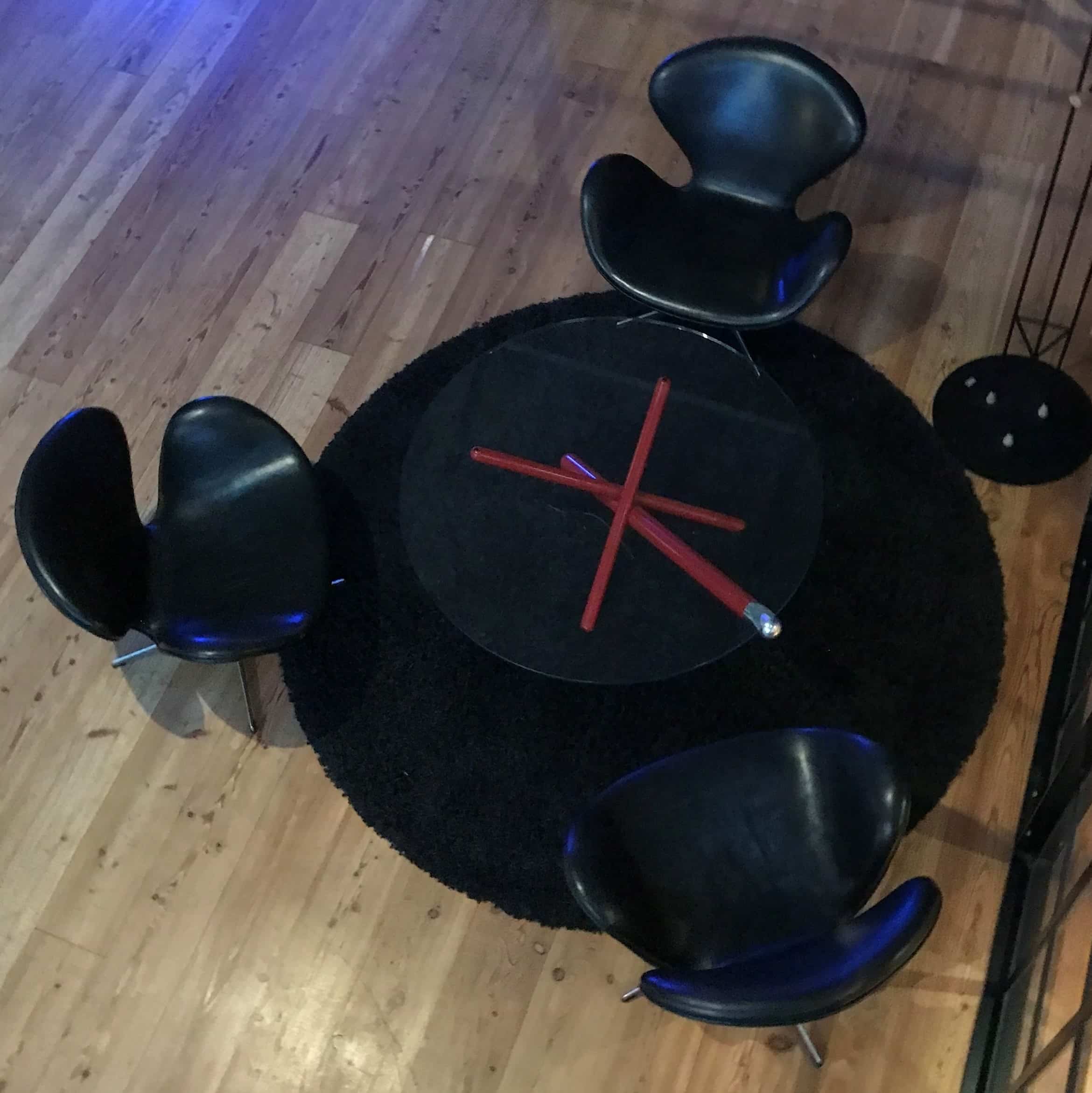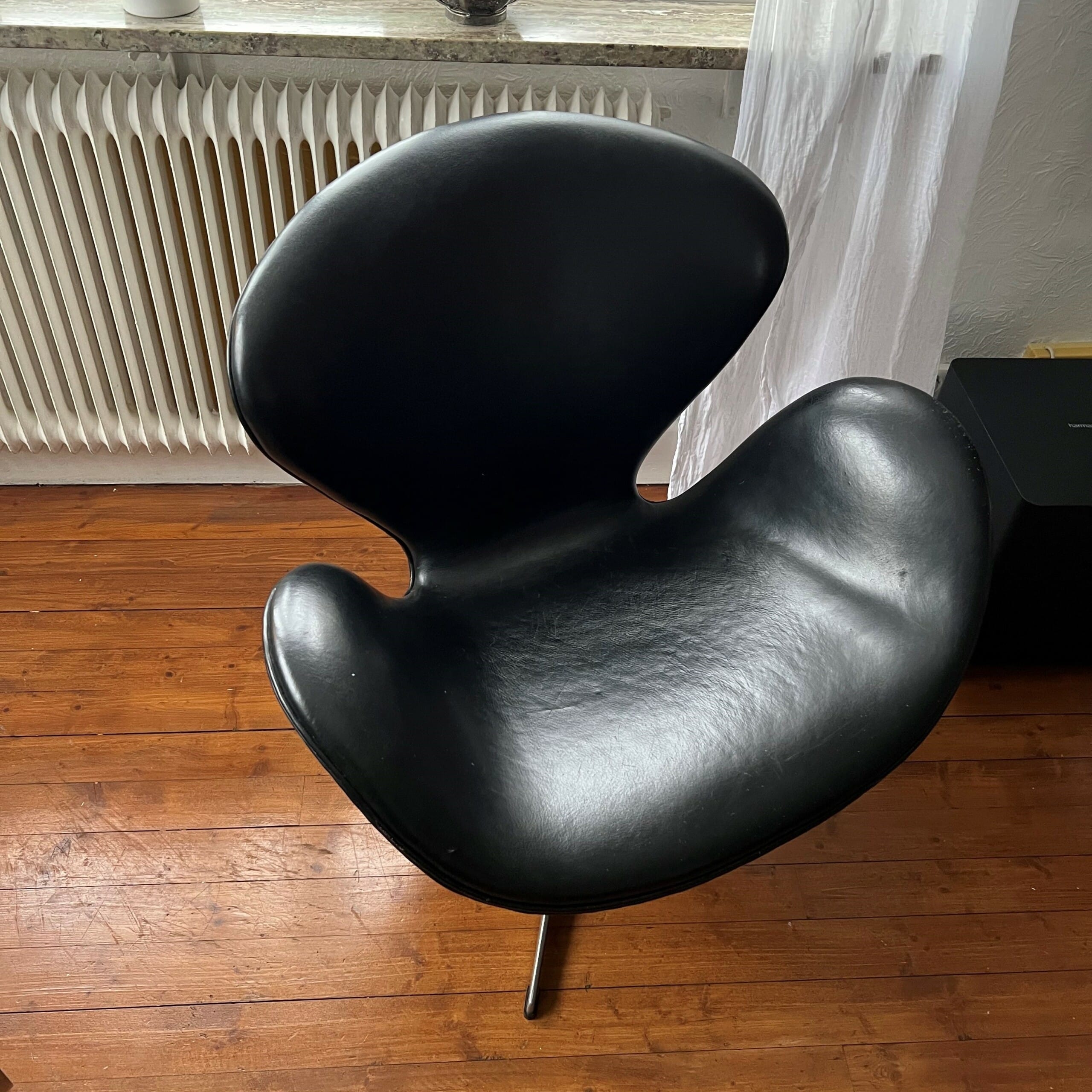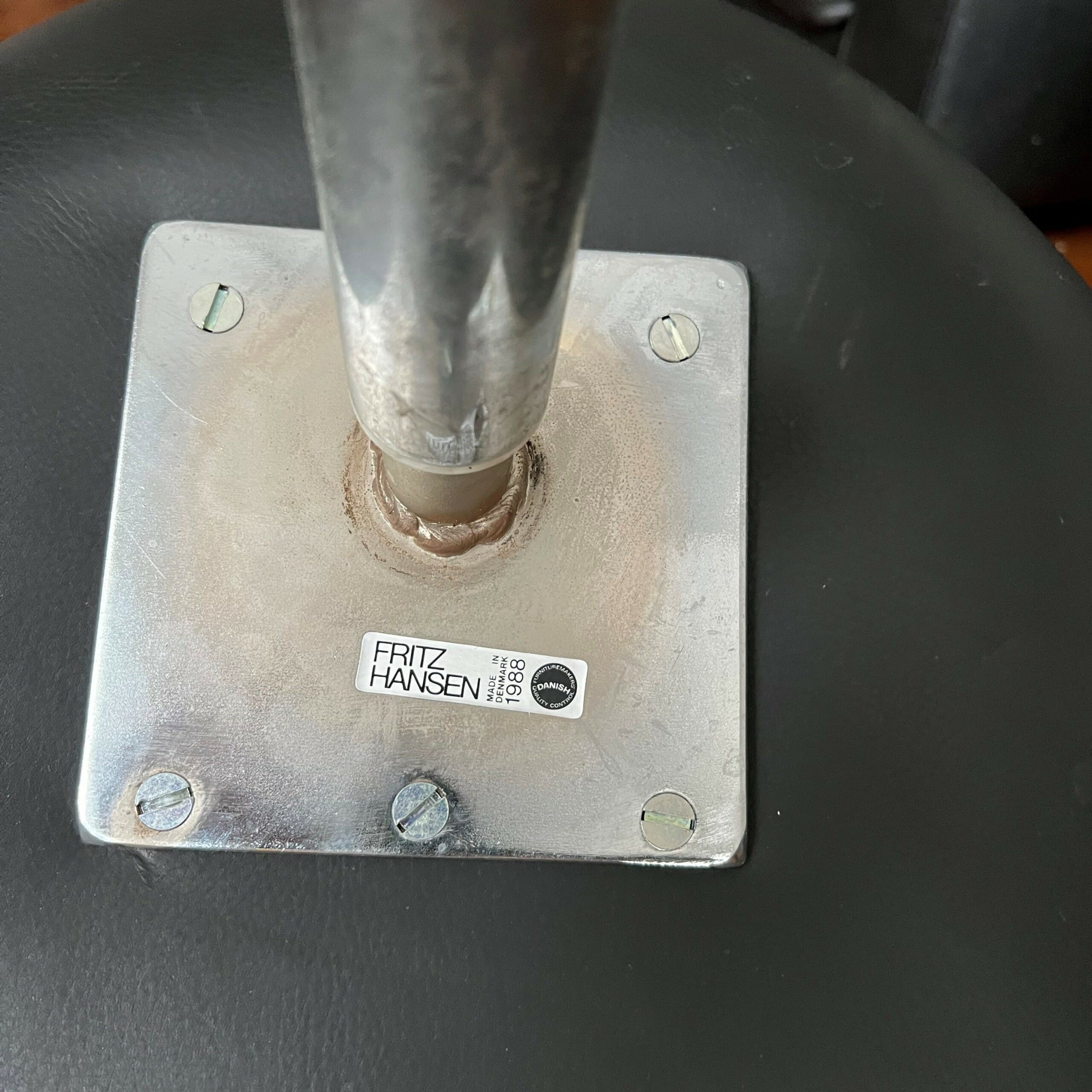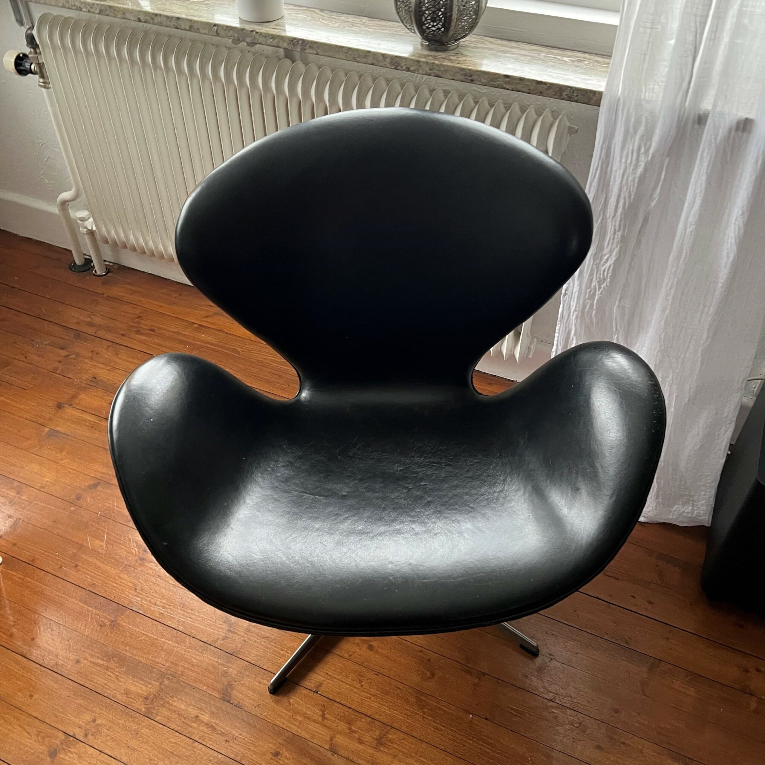 Sete og rygg i skinn (svart). Kryssfot i metall (rustfritt).