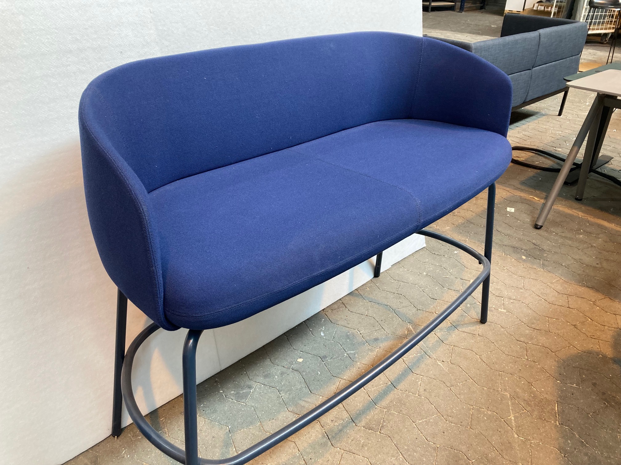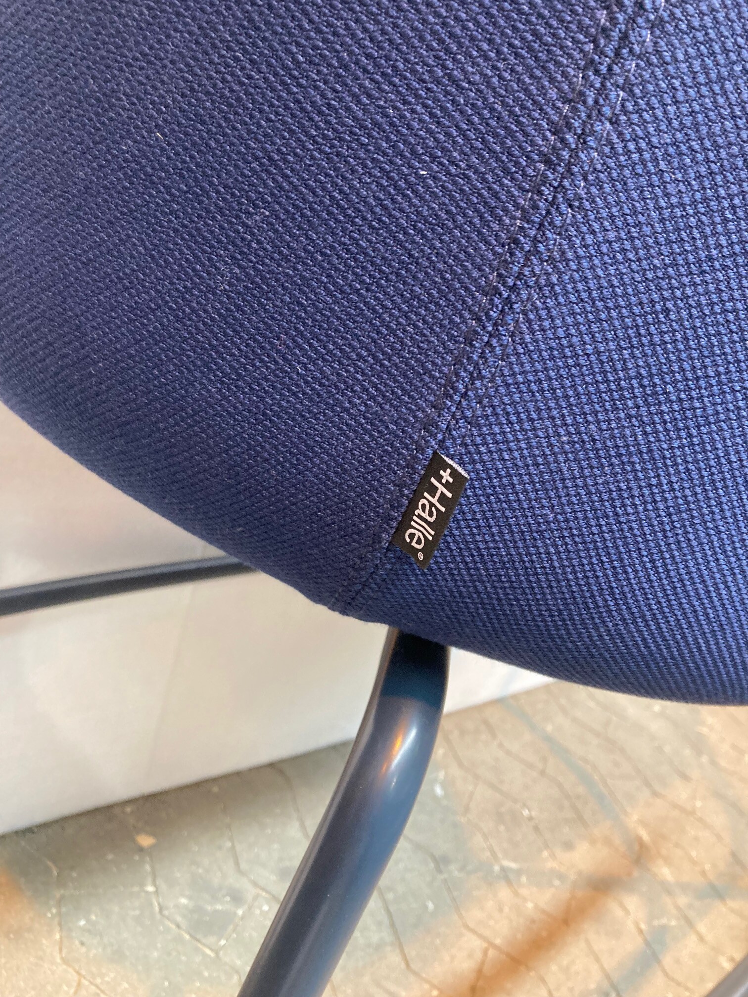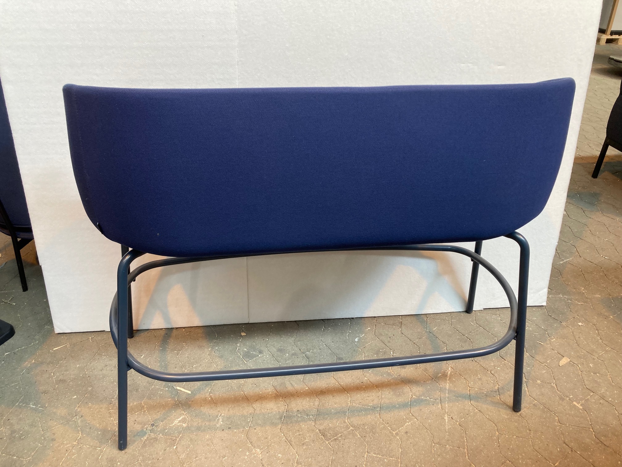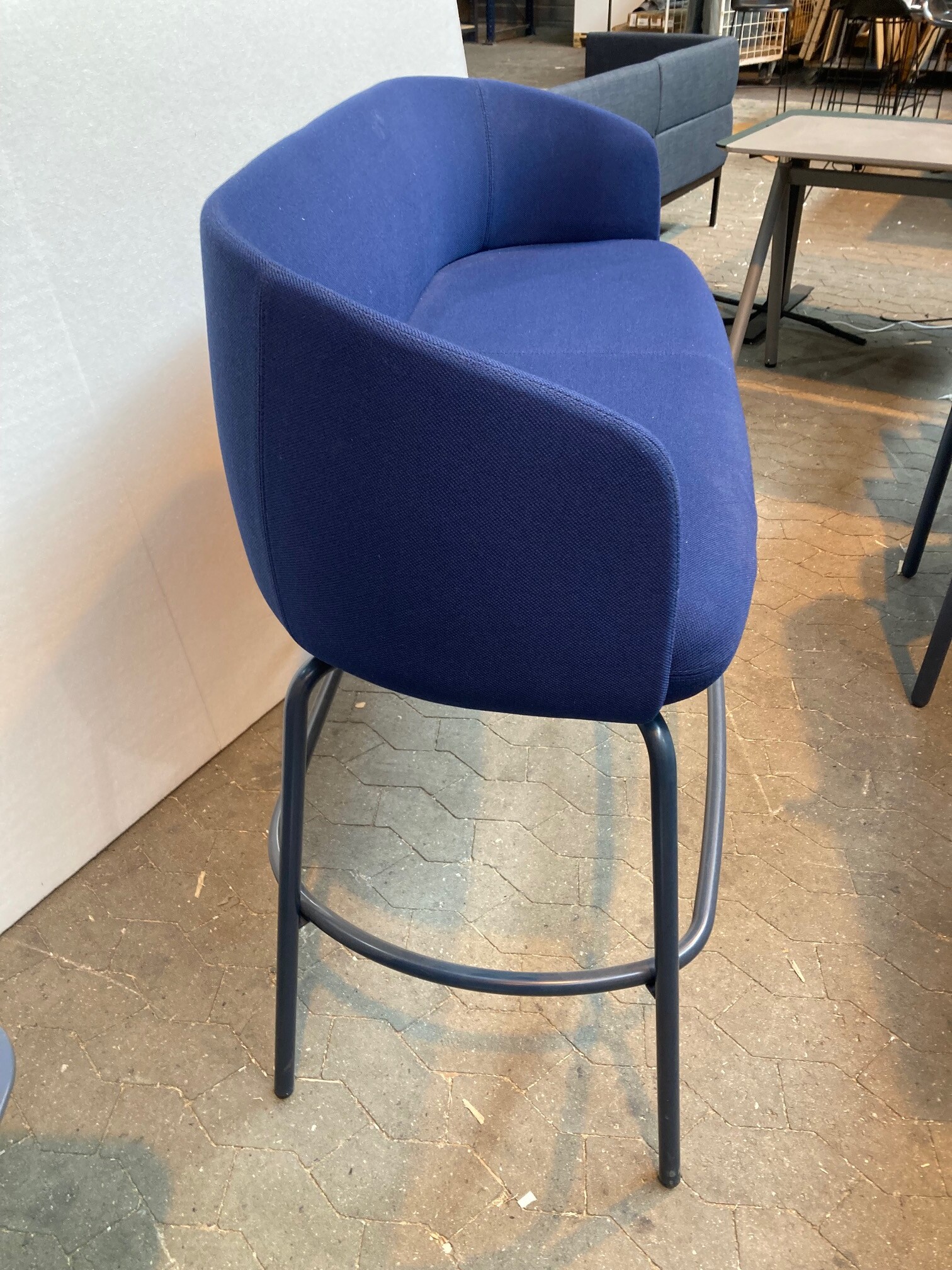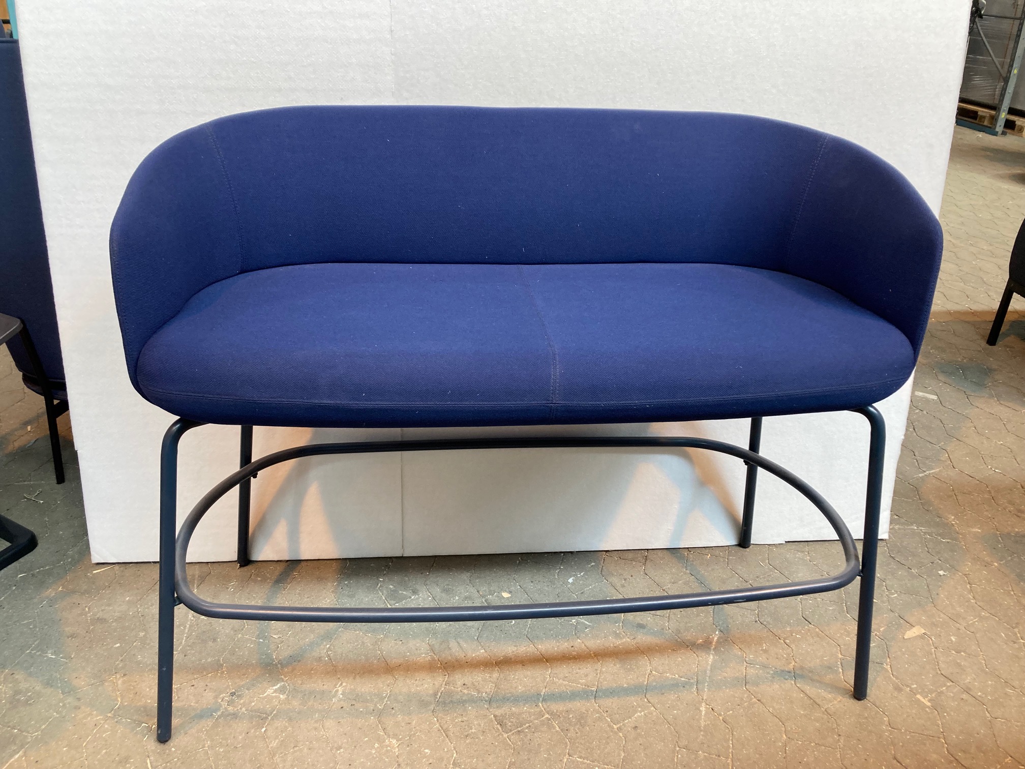 Sete og rygg i stoff (blå). Ben i metall (blå).