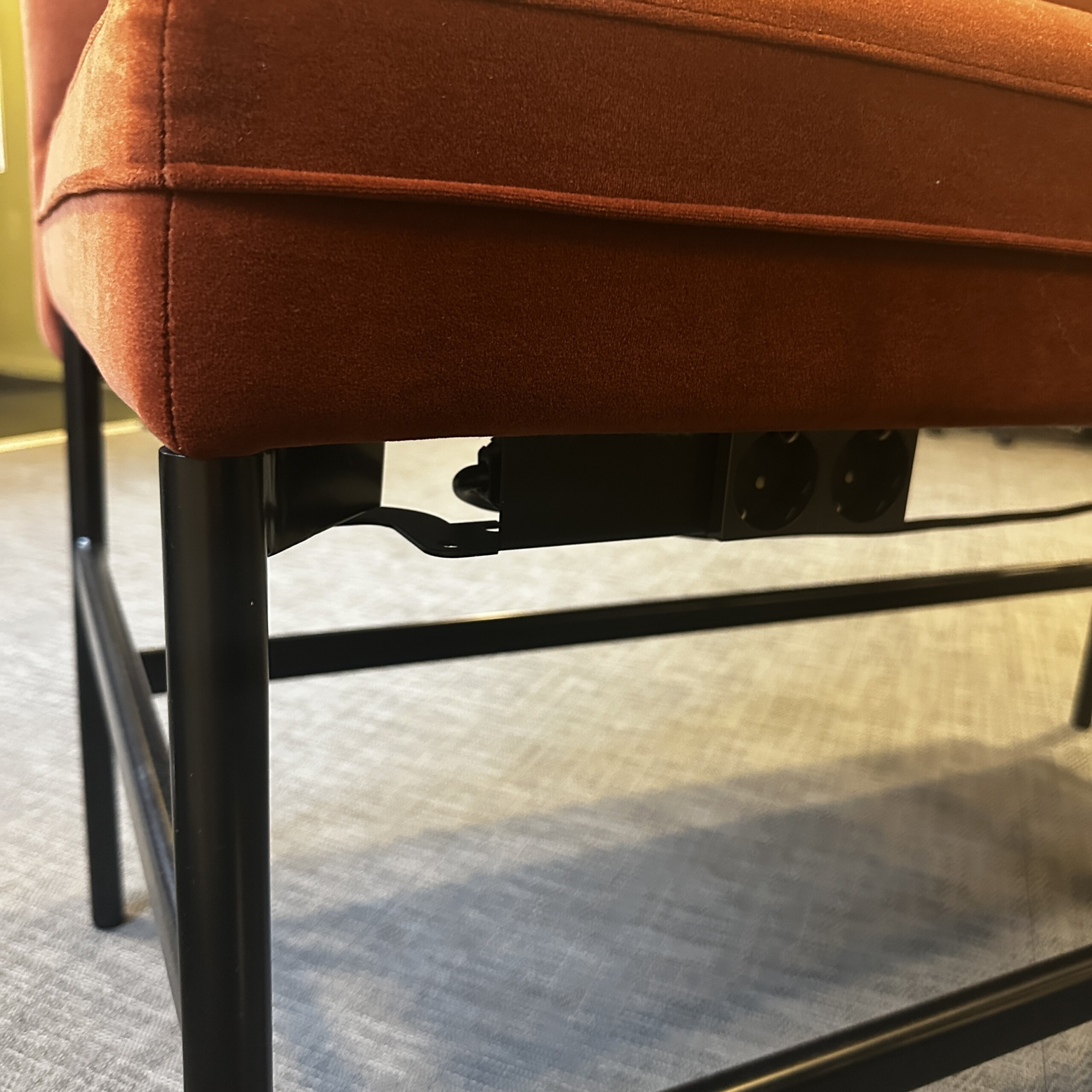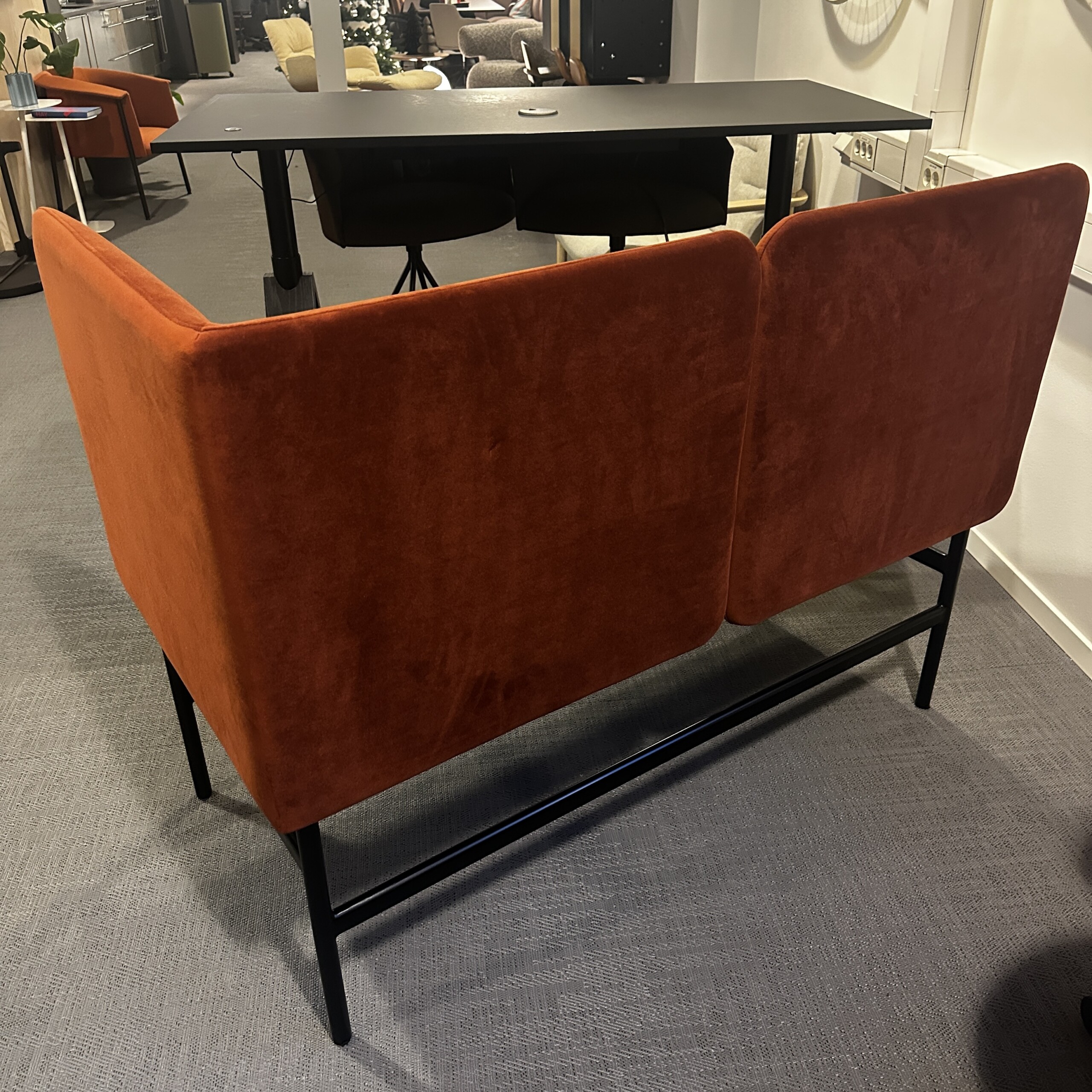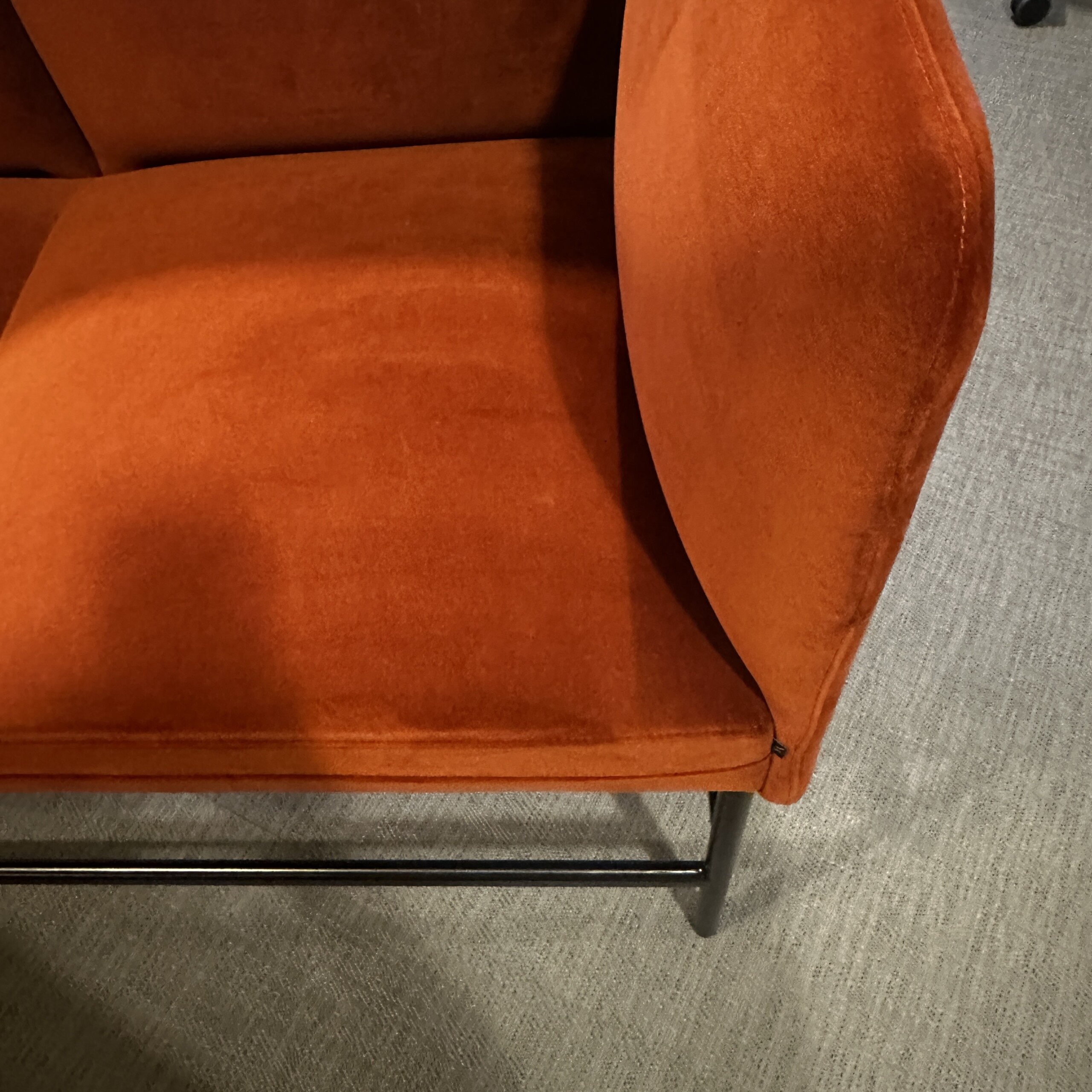 Sete og rygg i stoff (oransje). Ben i metall (svart).