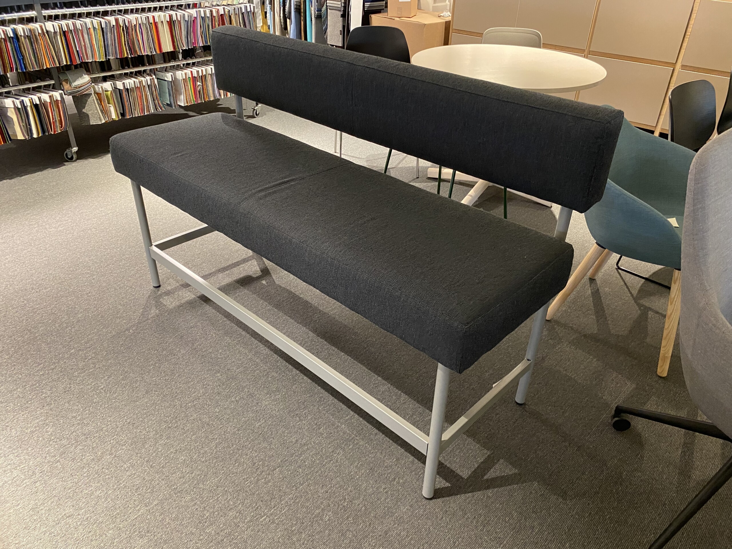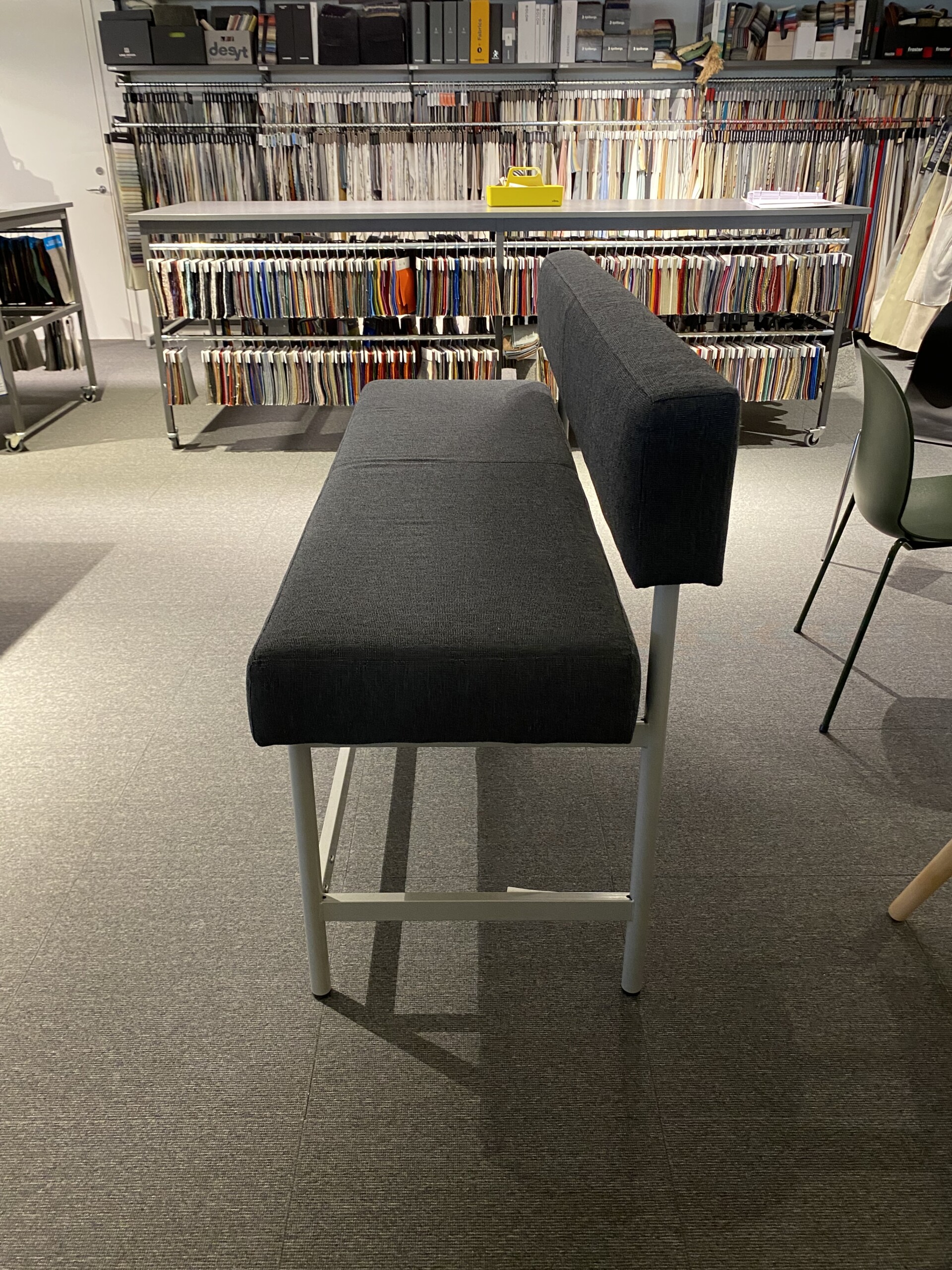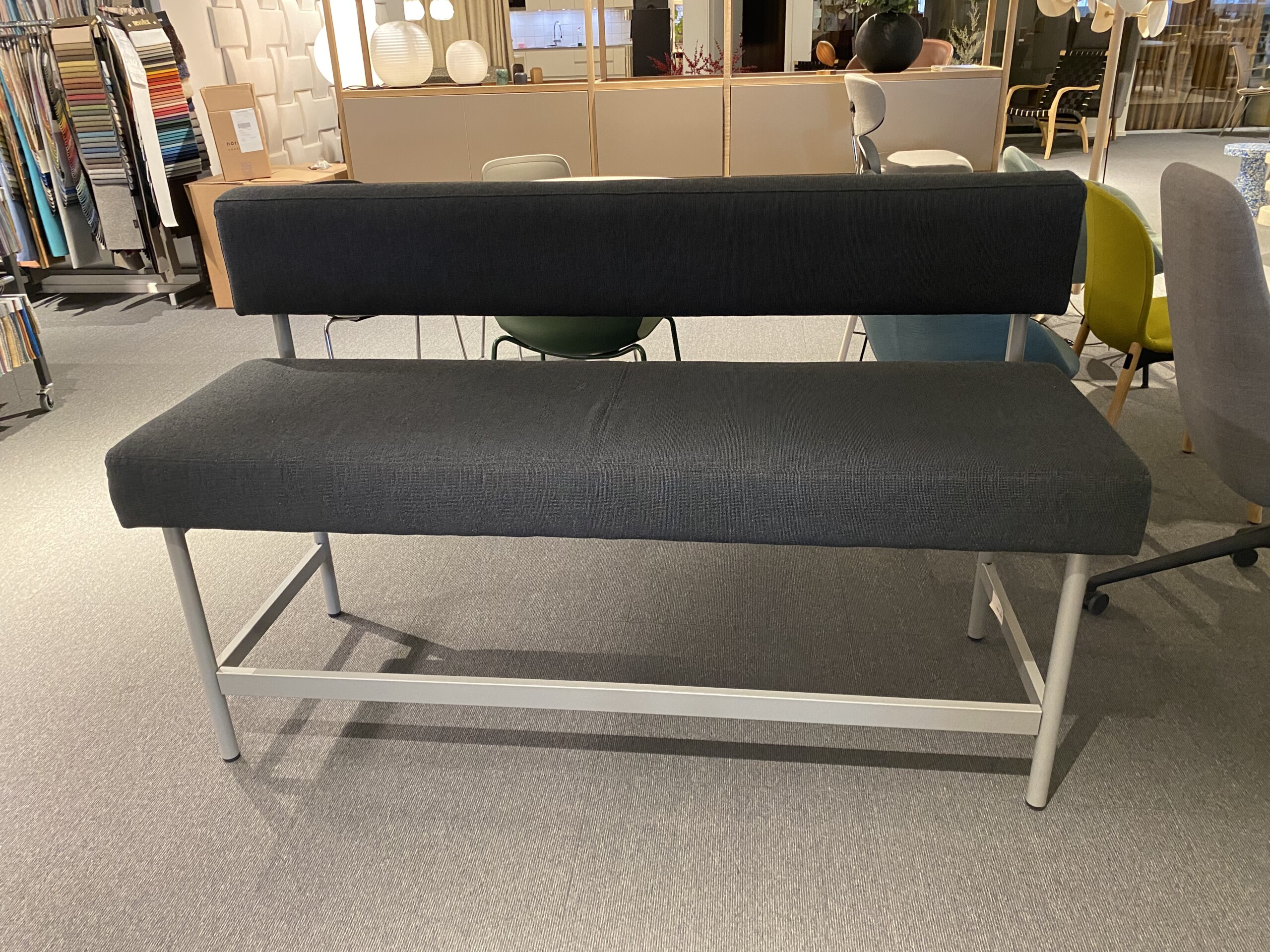 Sete og rygg i stoff (grå). Ben i metall (grå).