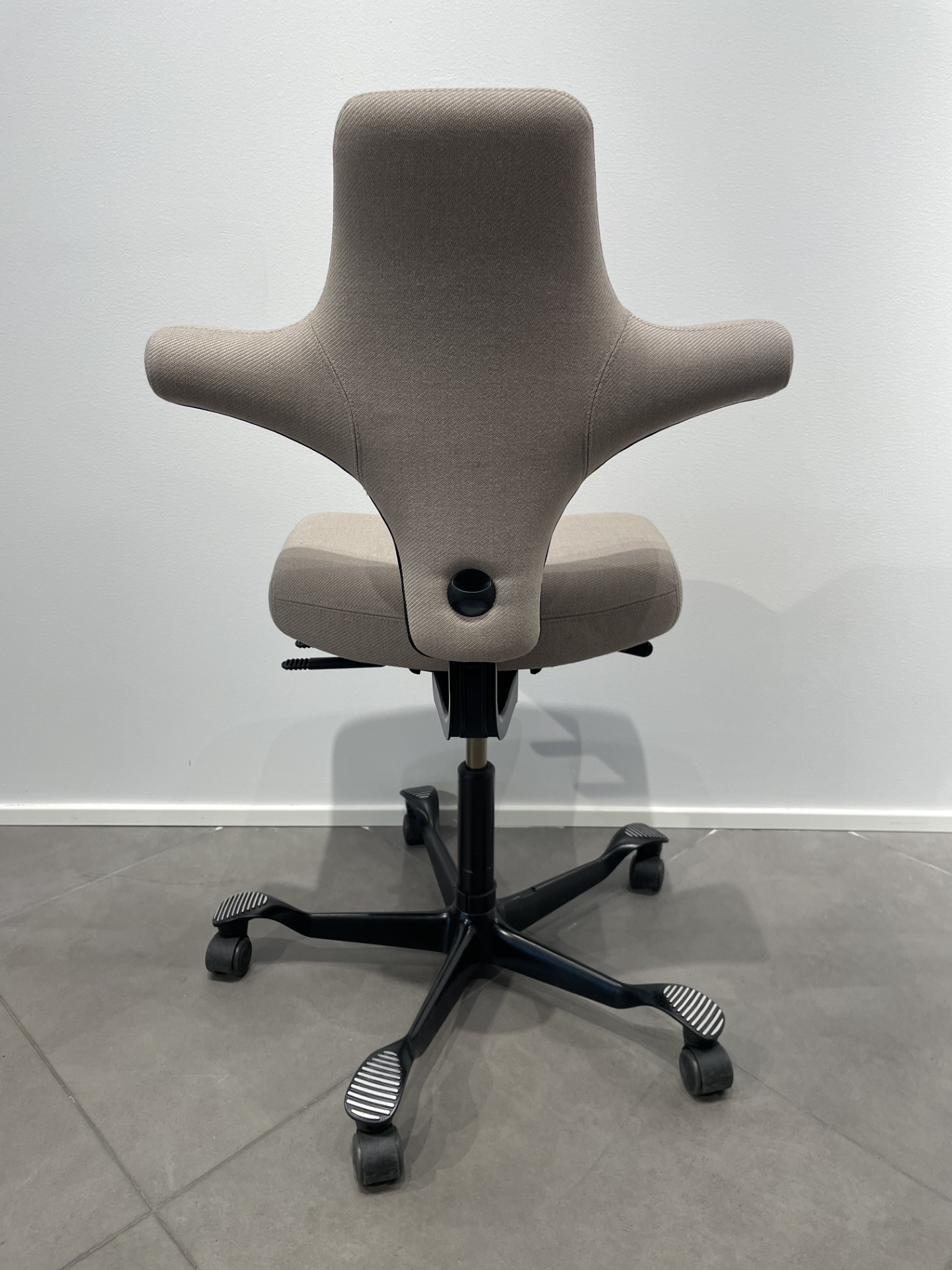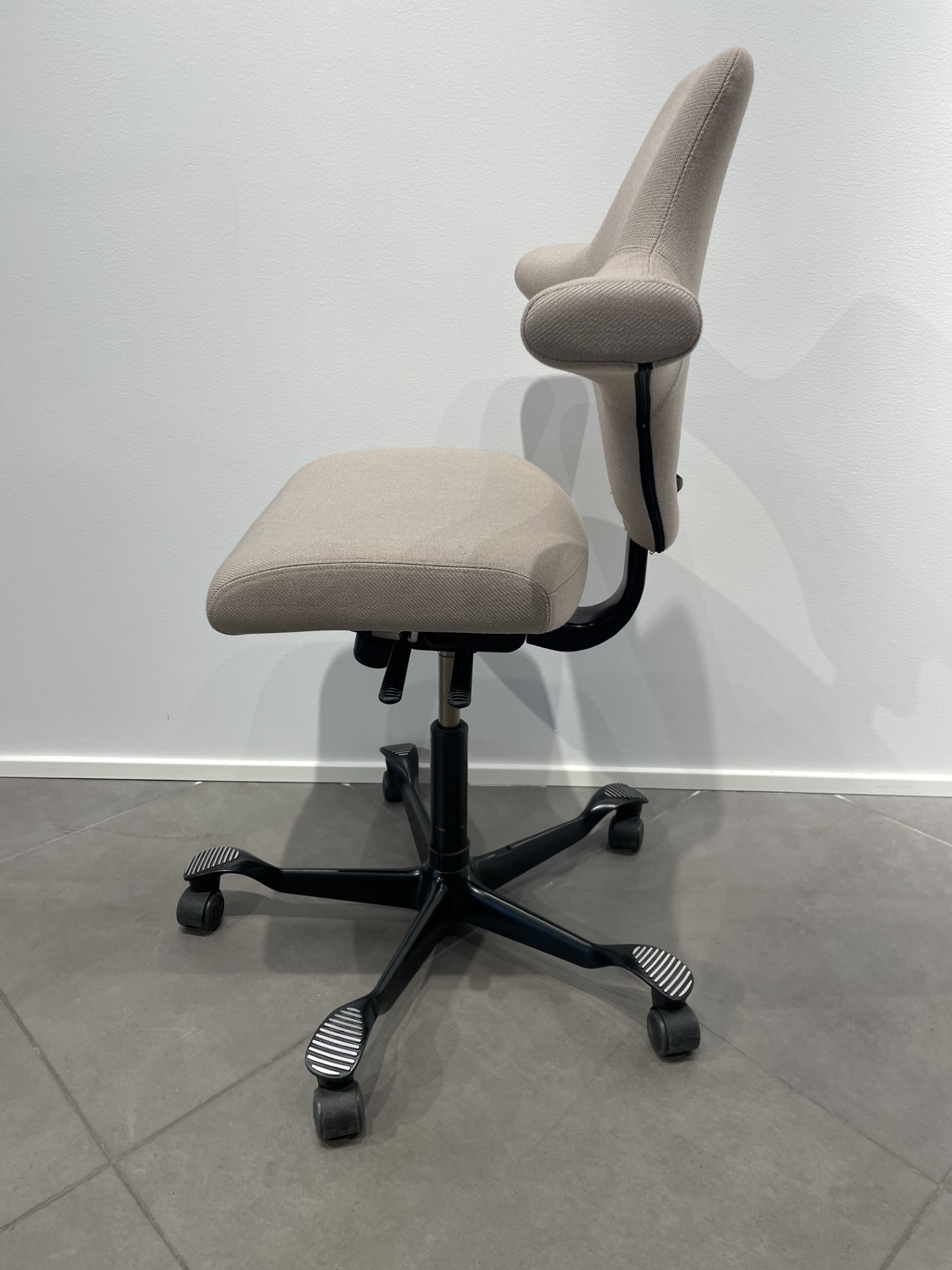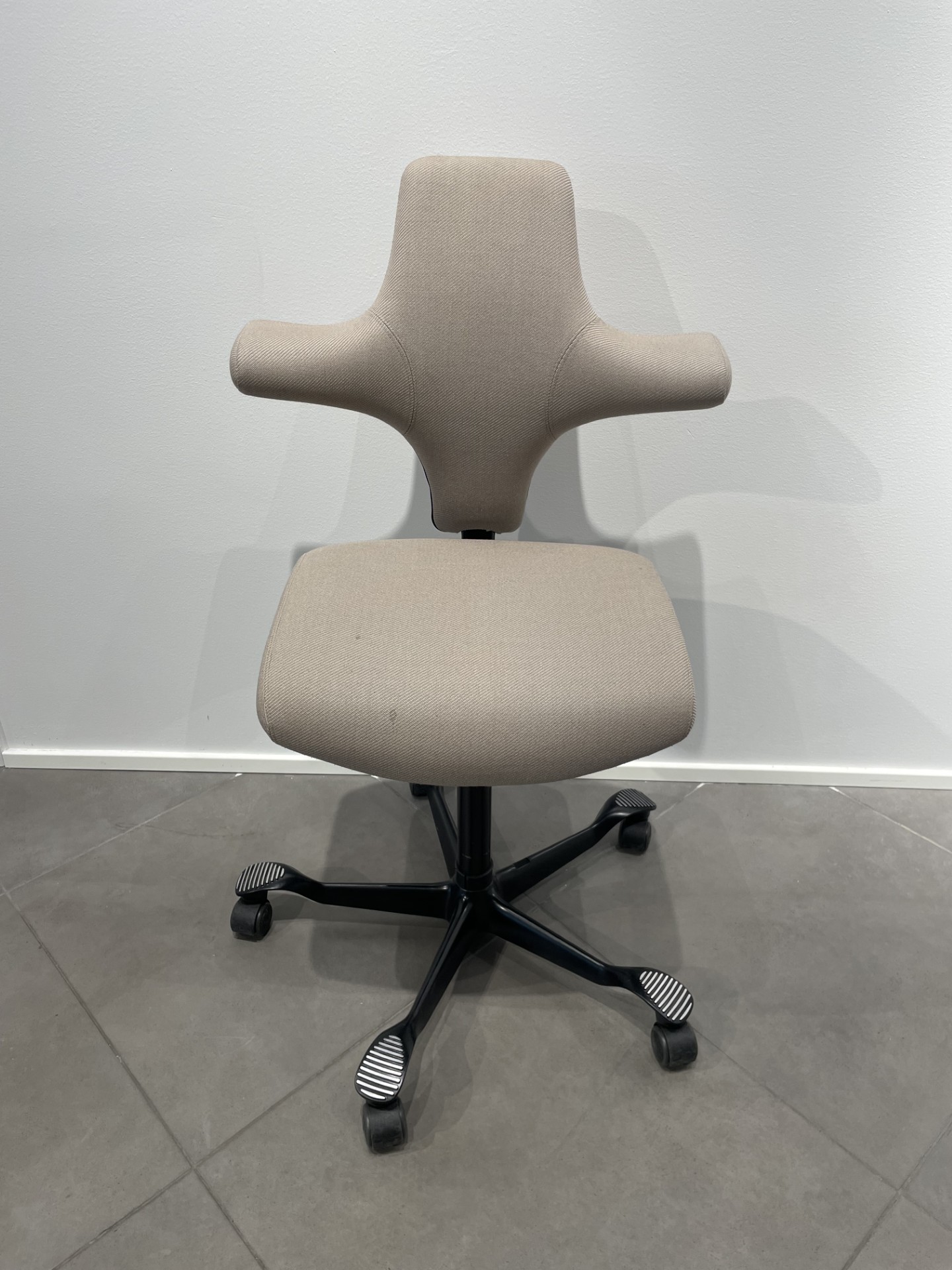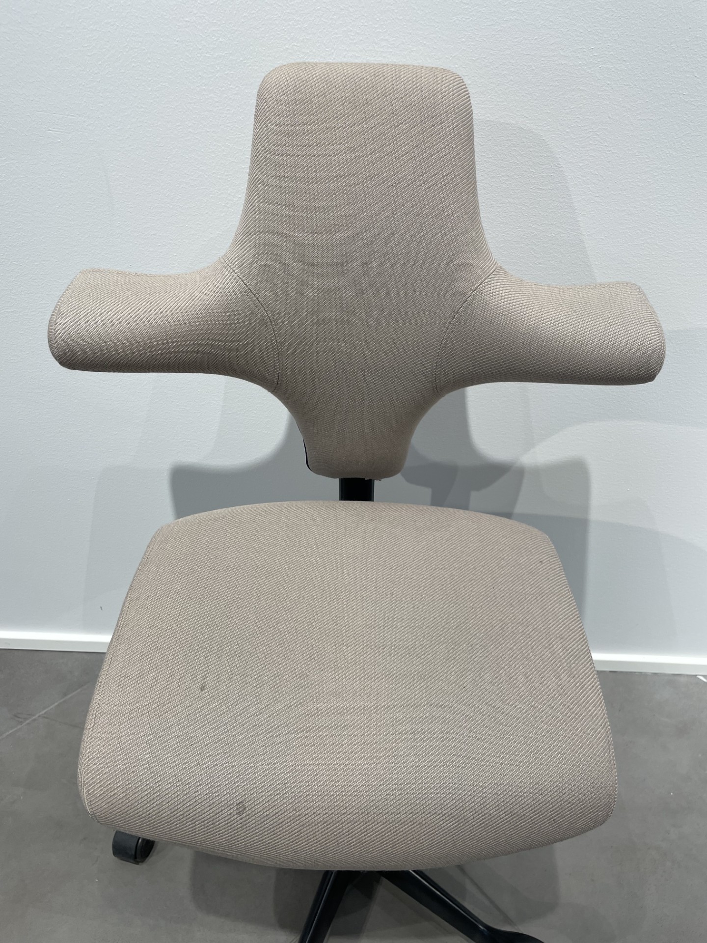 Sete og rygg i stoff (beige). Kryssfot i metall (svart). Høydejusterbar