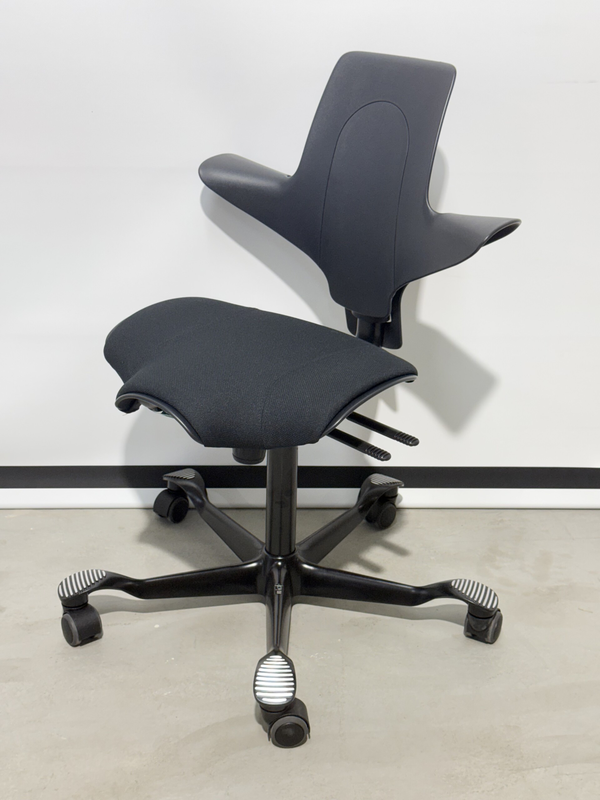 Sete i stoff. Rygg i plast (svart). Kryssfot i metall (svart). Høydejusterbar