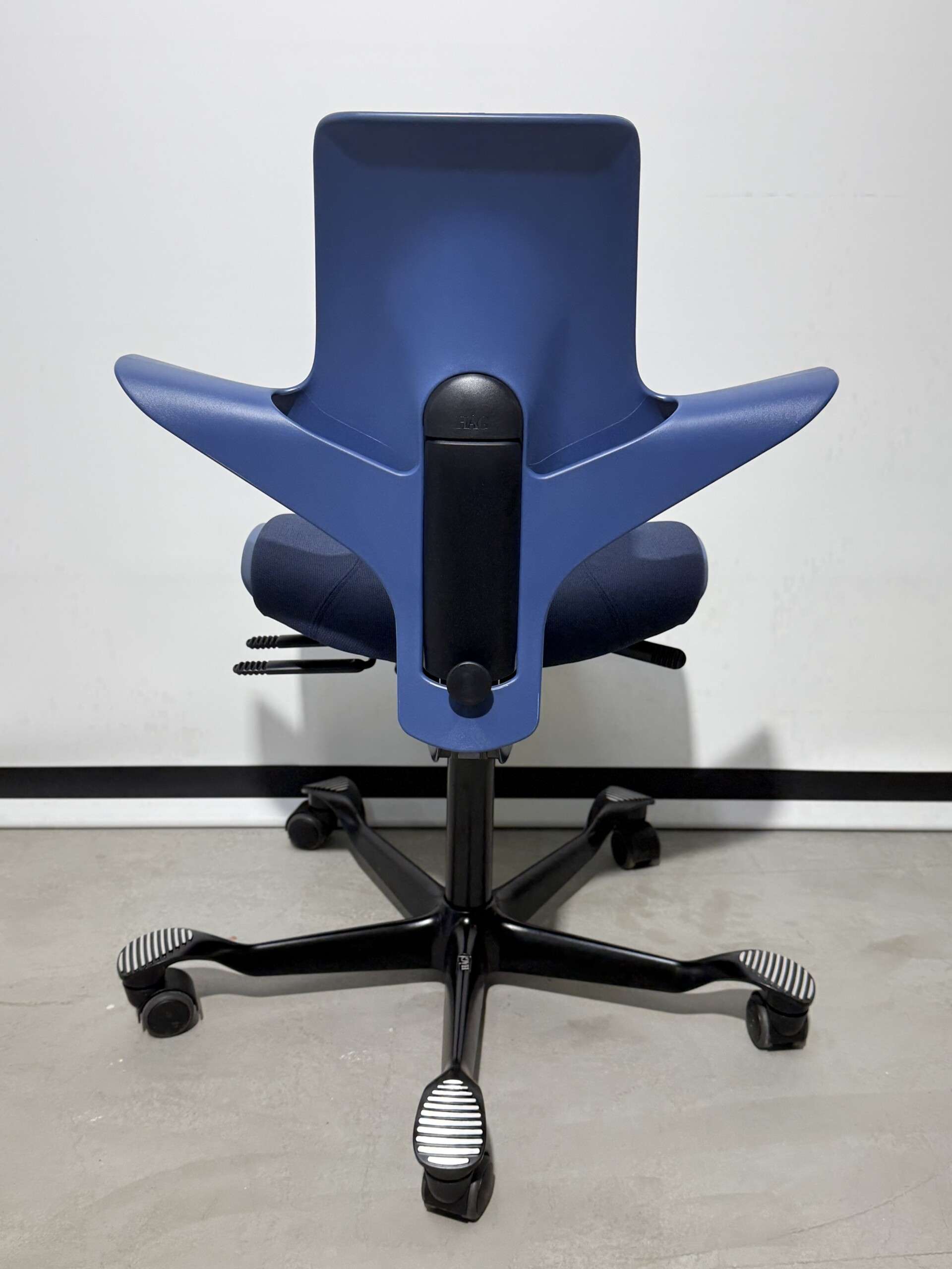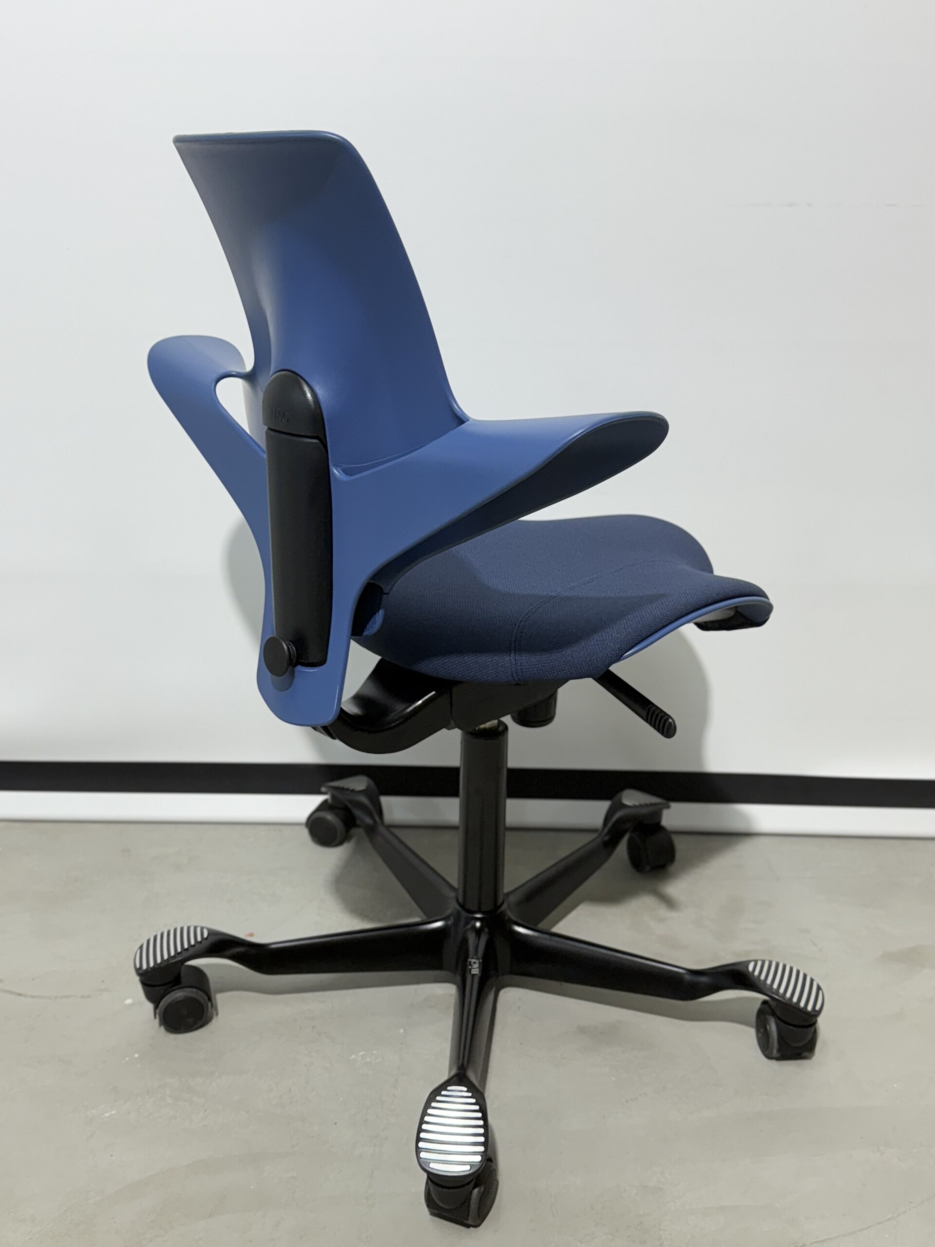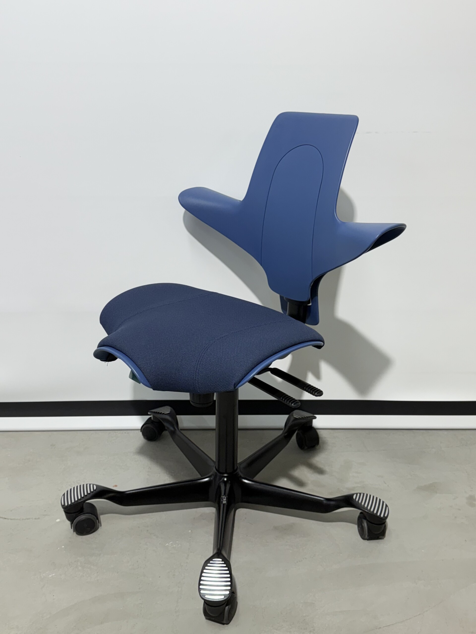 Sete i stoff (blå). Rygg i plast (beige). Kryssfot i metall (svart). Høydejusterbar