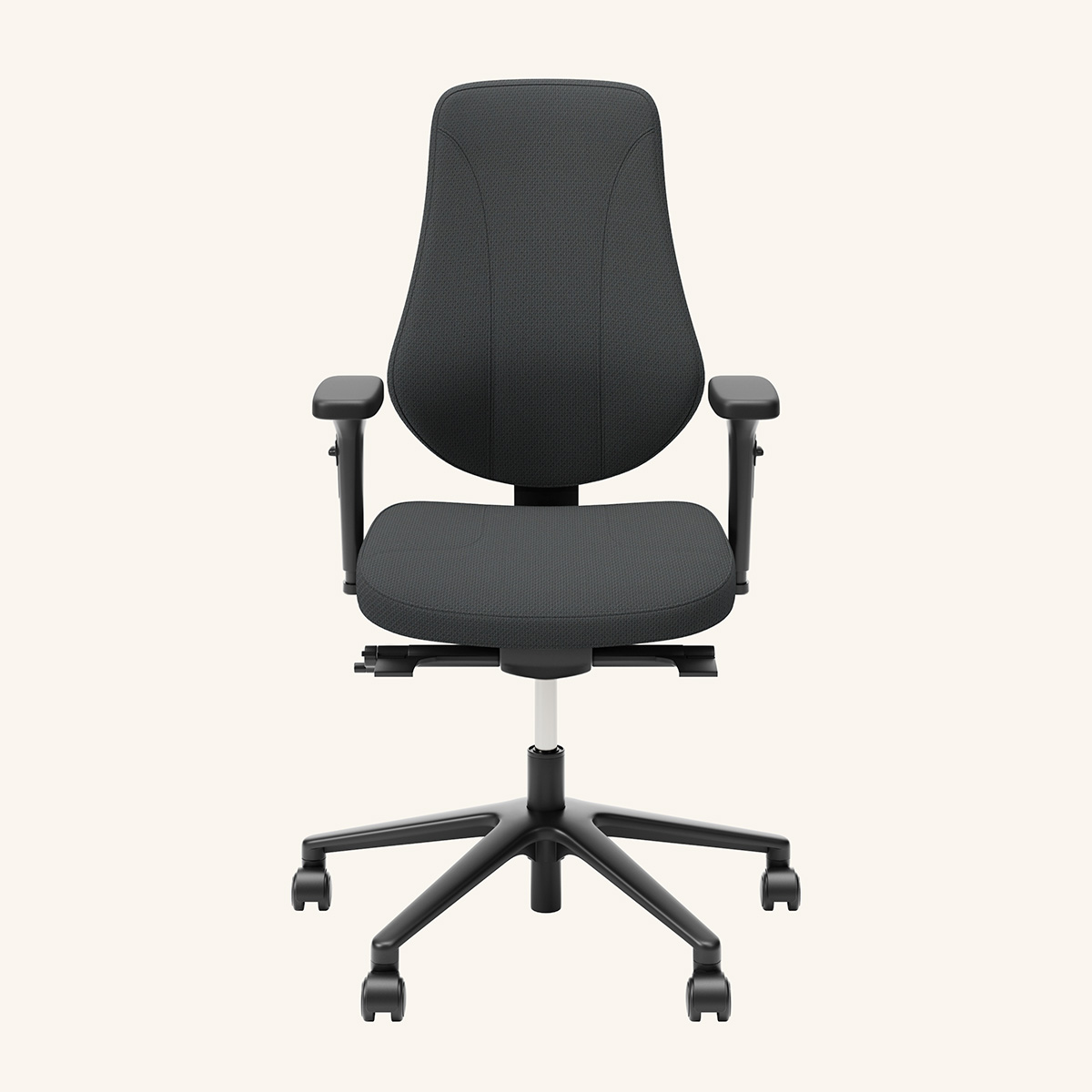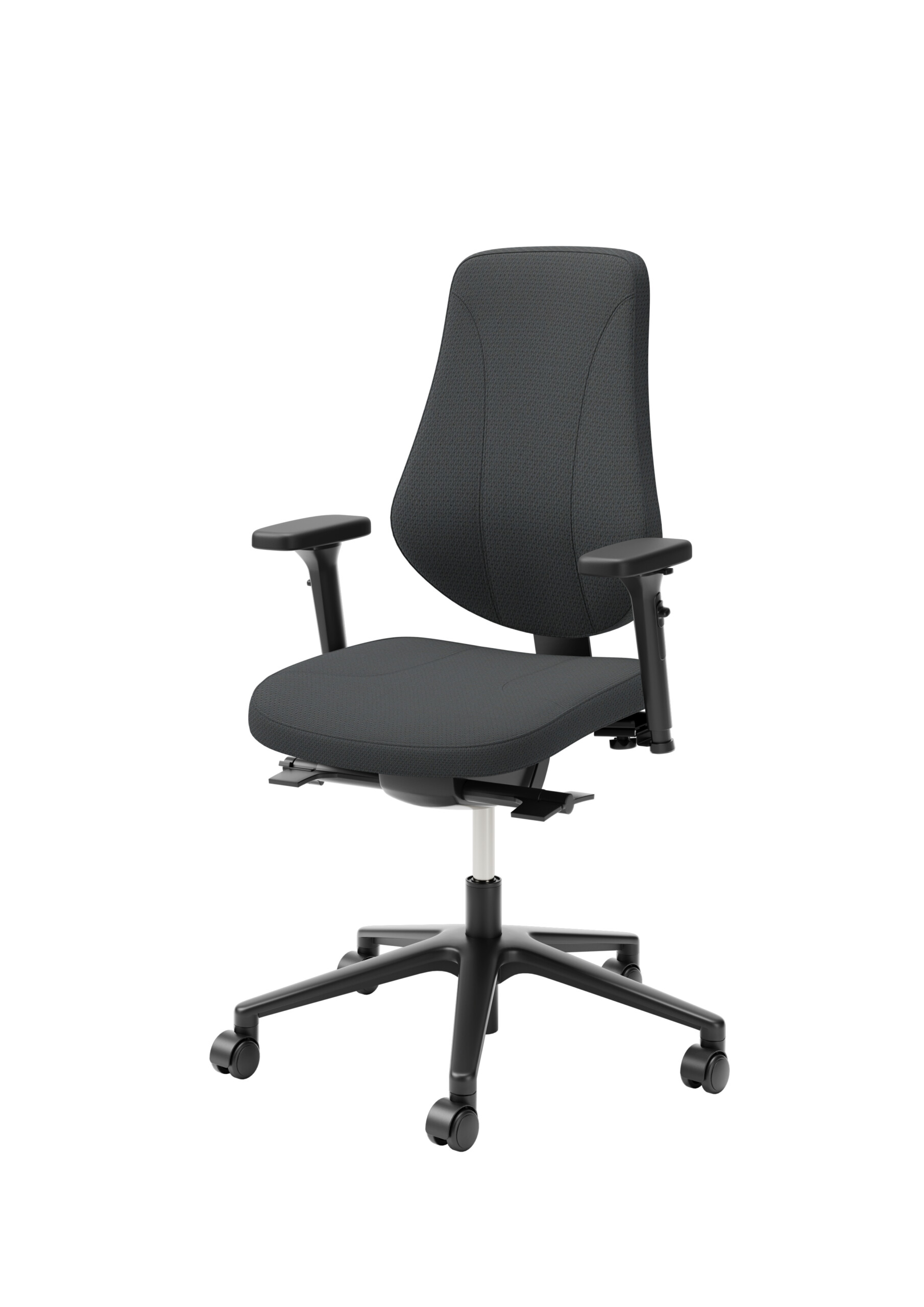 Sete og rygg i stoff (grå). Kryssfot i metall (svart). Høydejusterbar