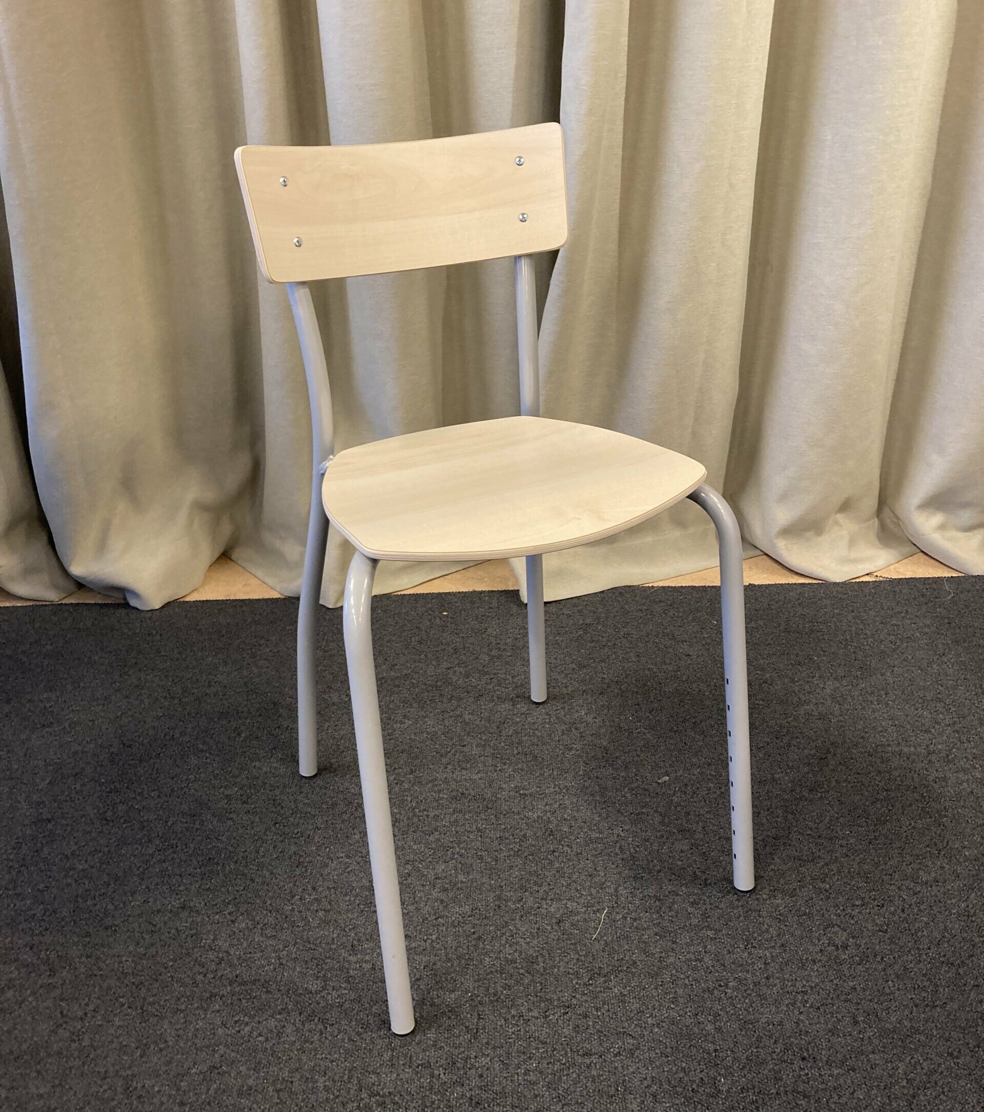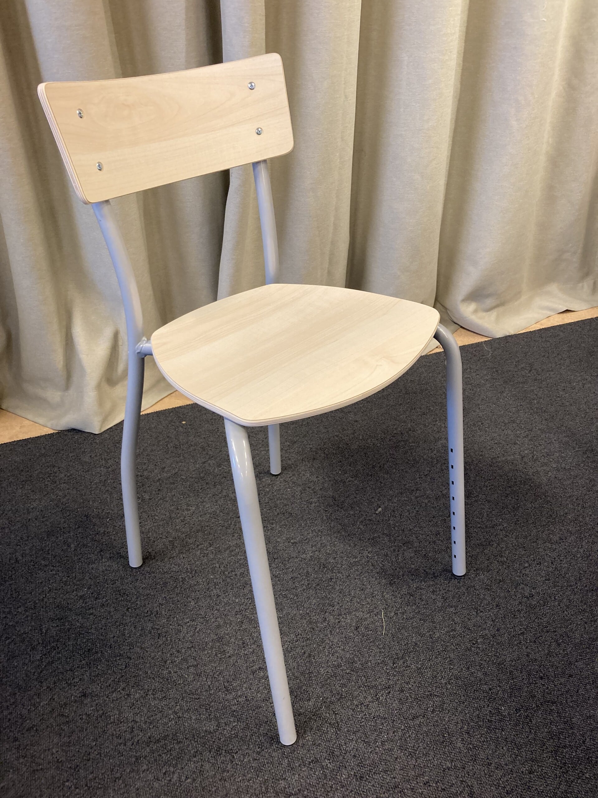 Sete og rygg i laminat (bjørk). Ben i metall (grå).
