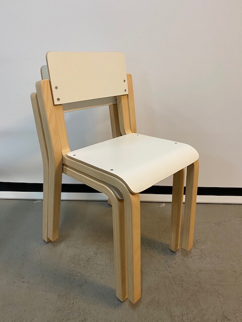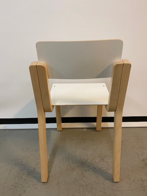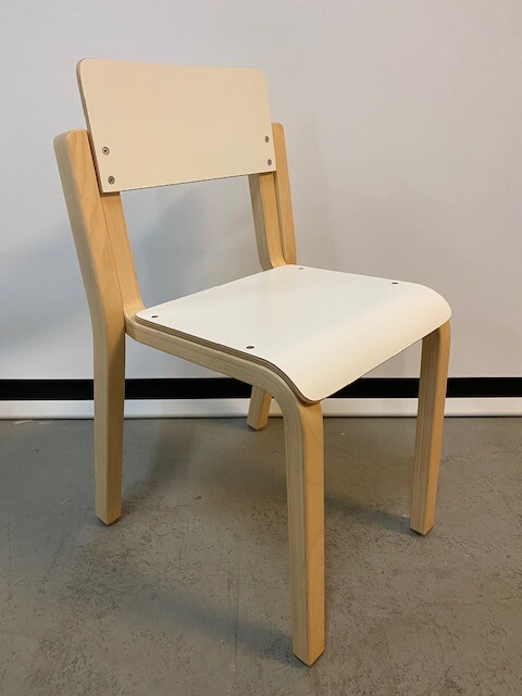 Sete og rygg i laminat (hvit). Ben i tre (bjørk).