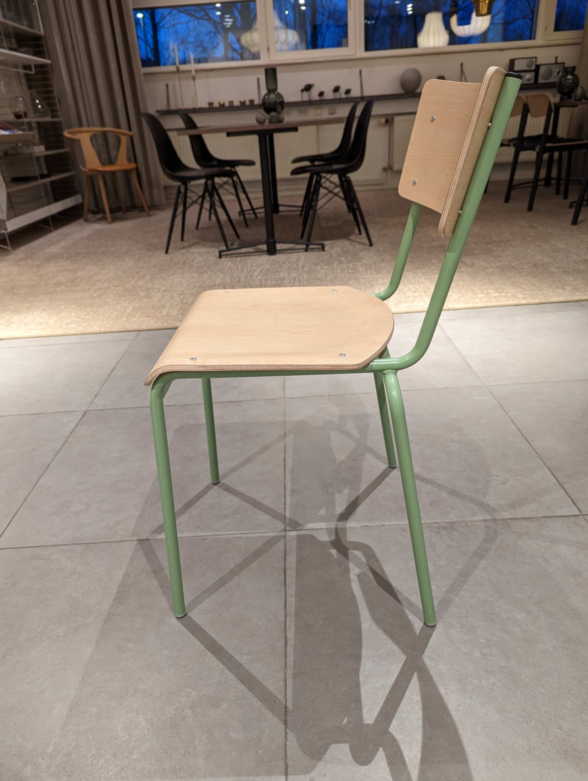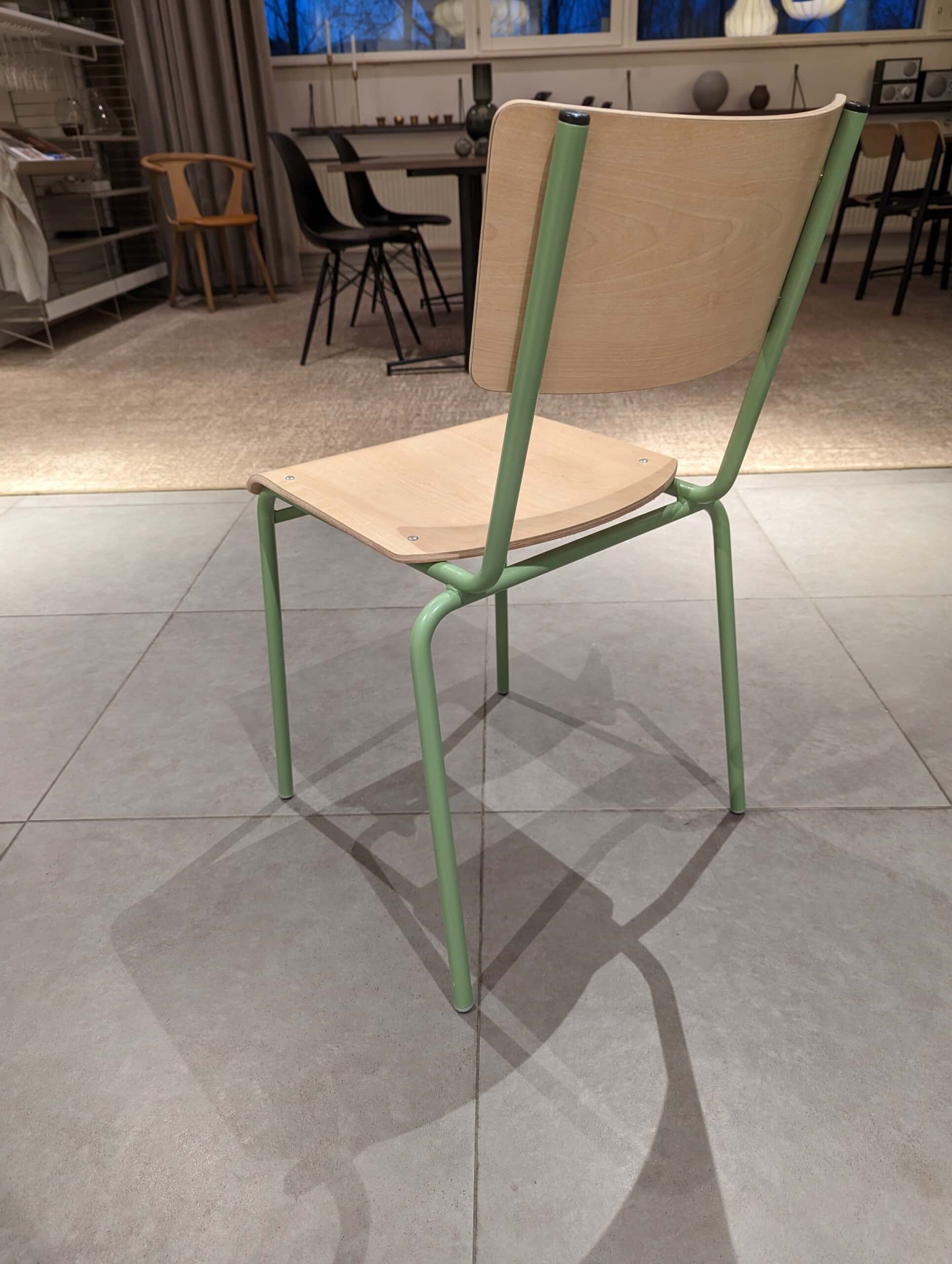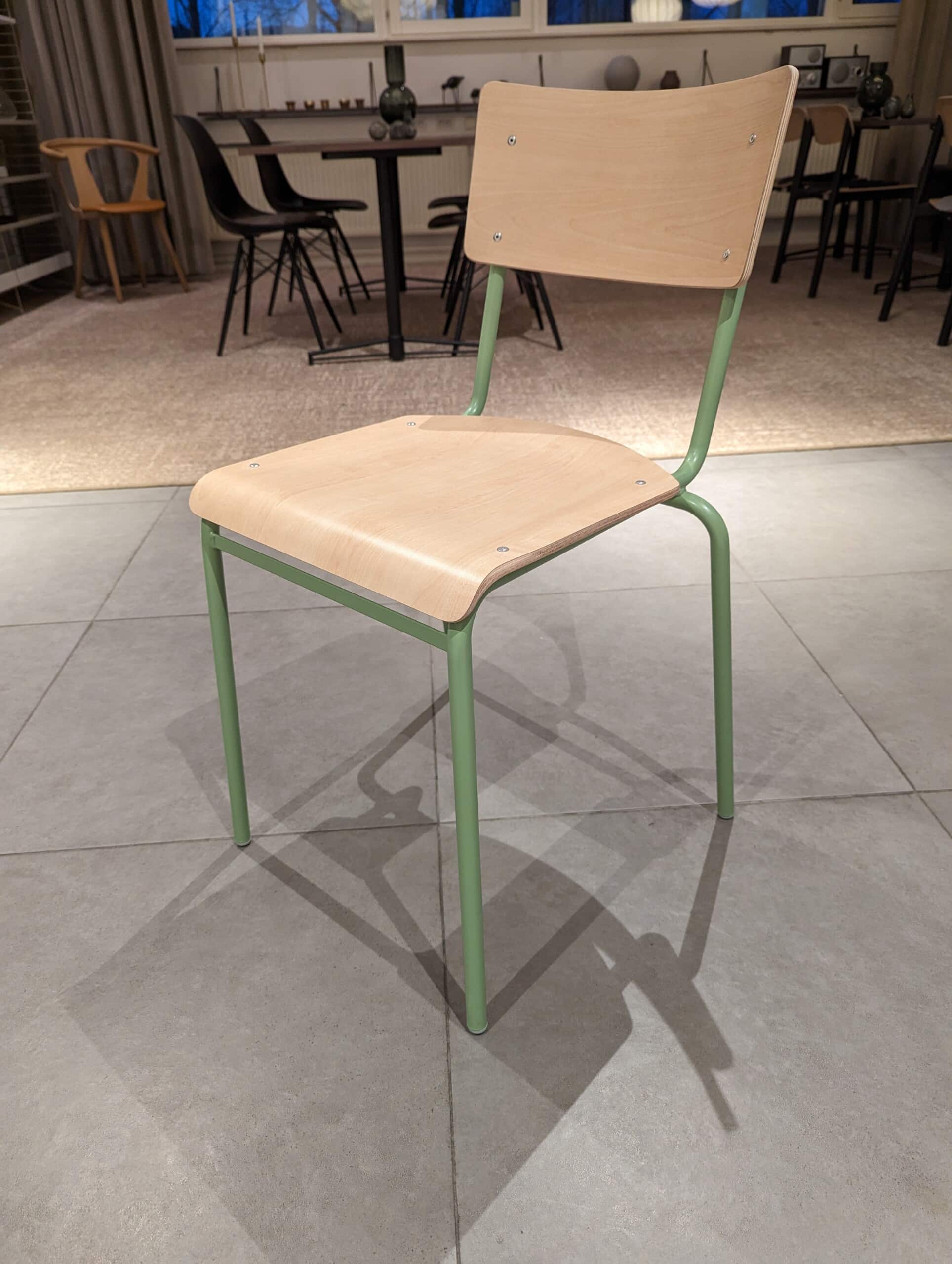 Sete og rygg i laminat (bjørk). Ben i metall (grønn).