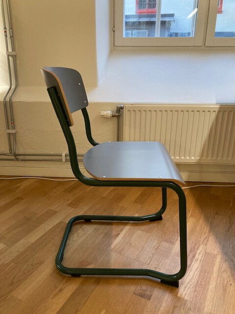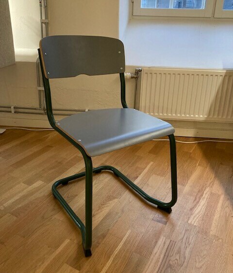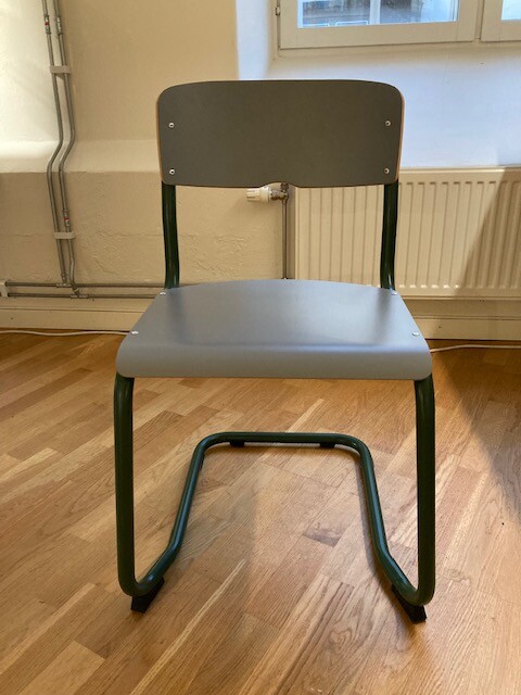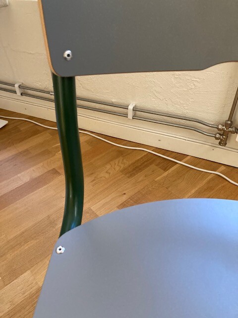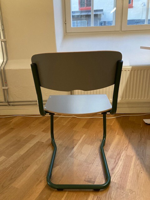 Sete og rygg i laminat (grå). Meiestativ i metall (grønn).