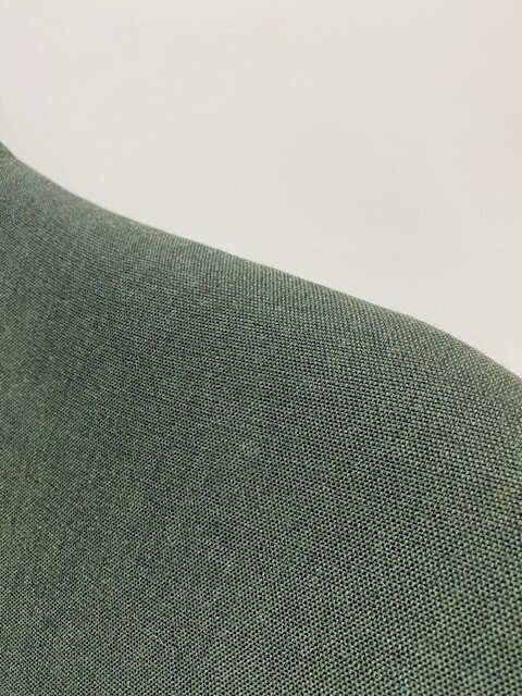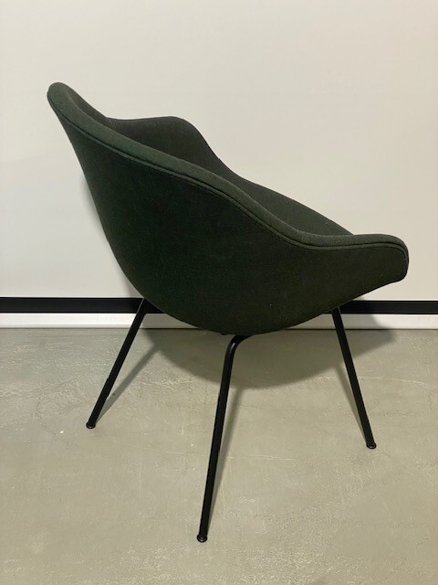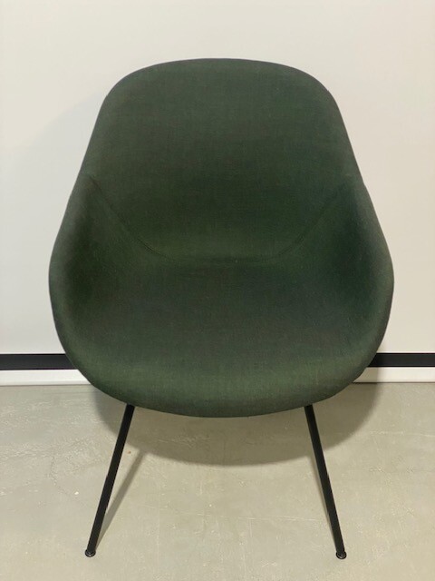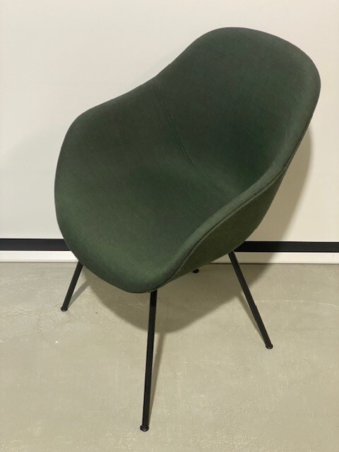 Sete og rygg i stoff (grønn). Ben i metall (svart).
