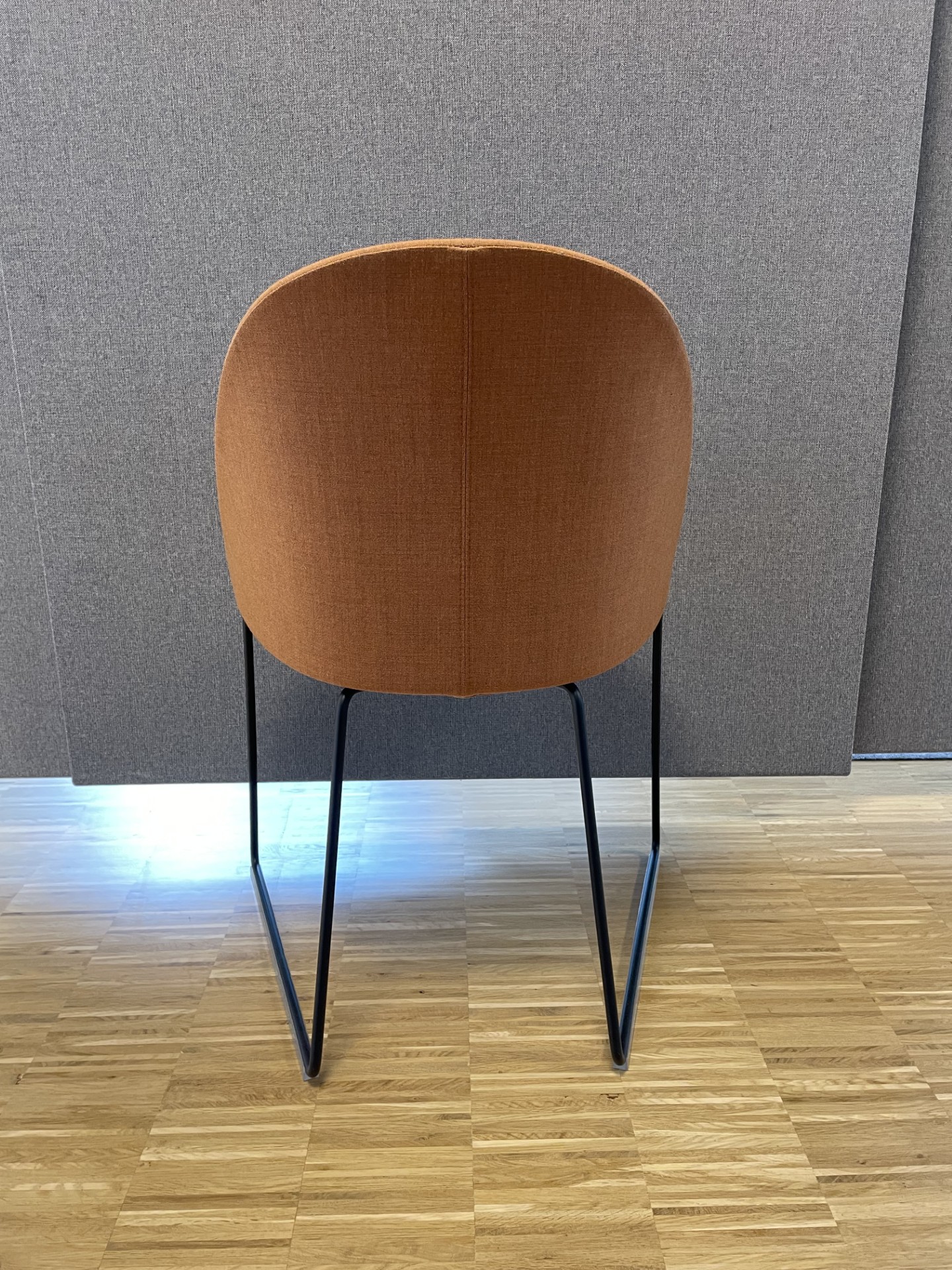 Sete og rygg i stoff (oransje). Meiestativ i metall (svart).