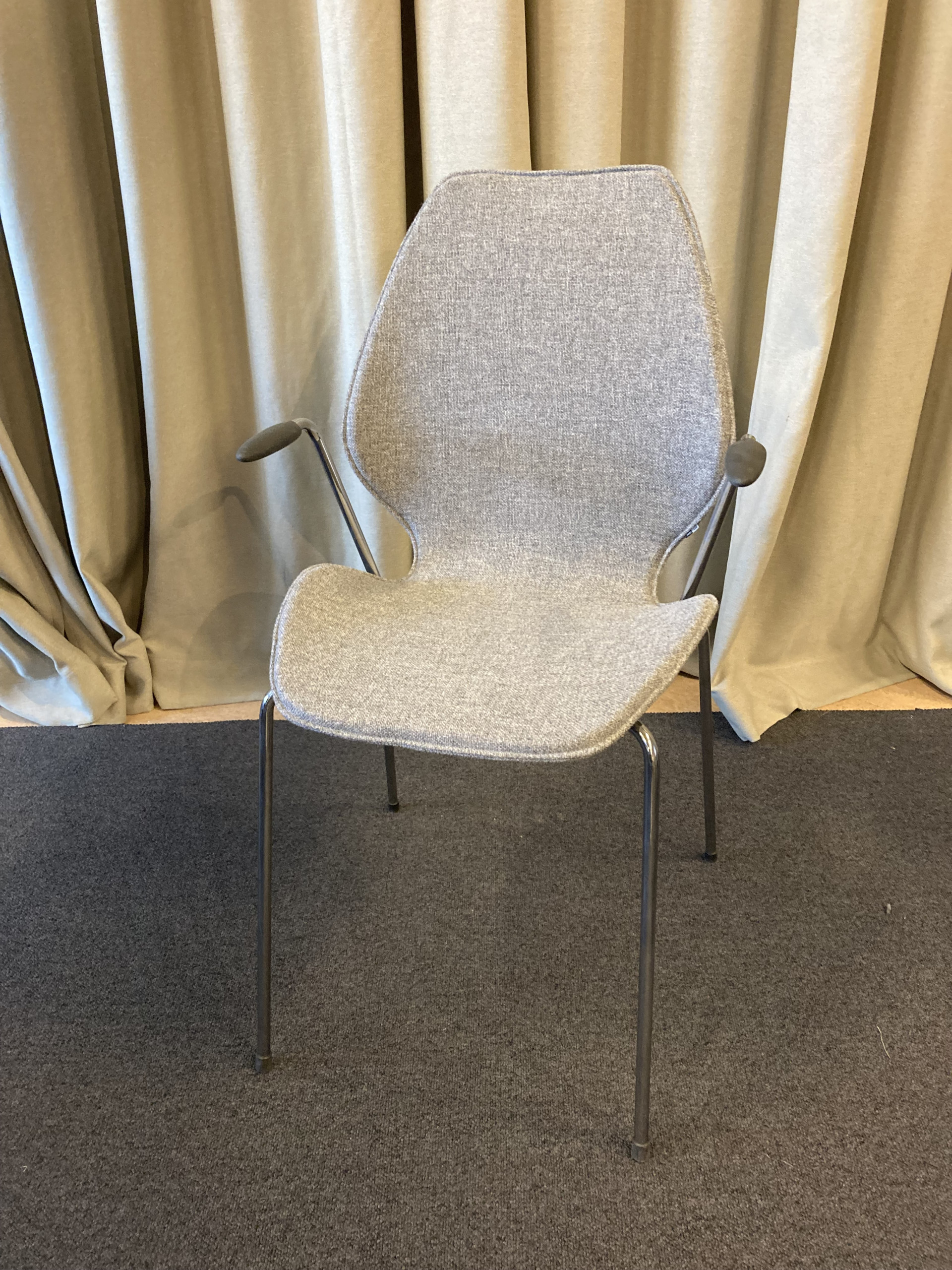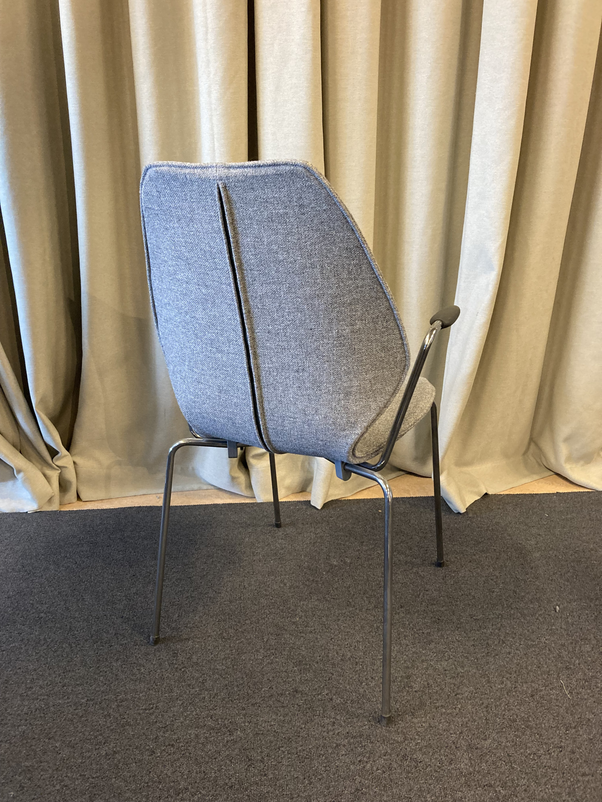 Sete og rygg i stoff (grå). Ben i metall (krom).