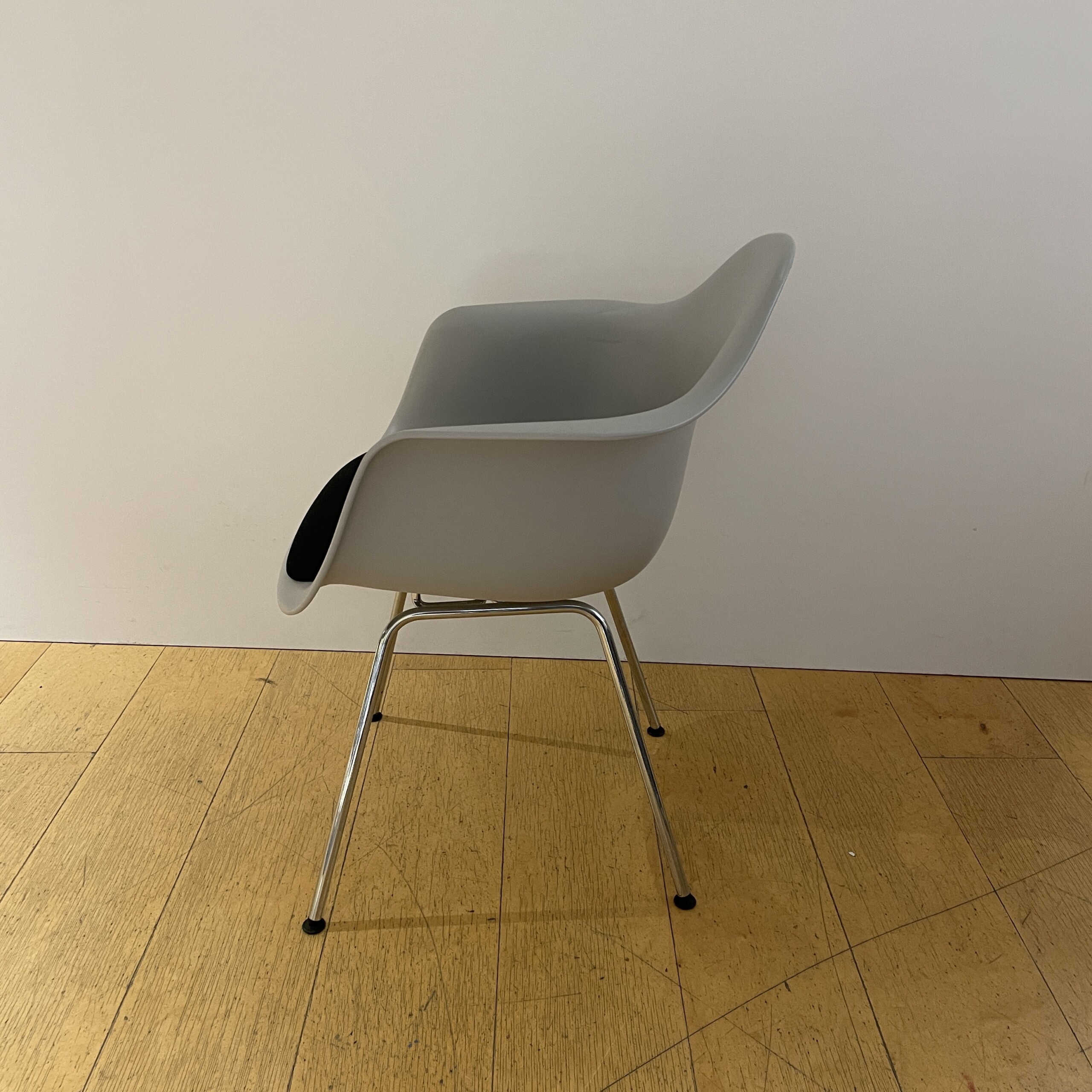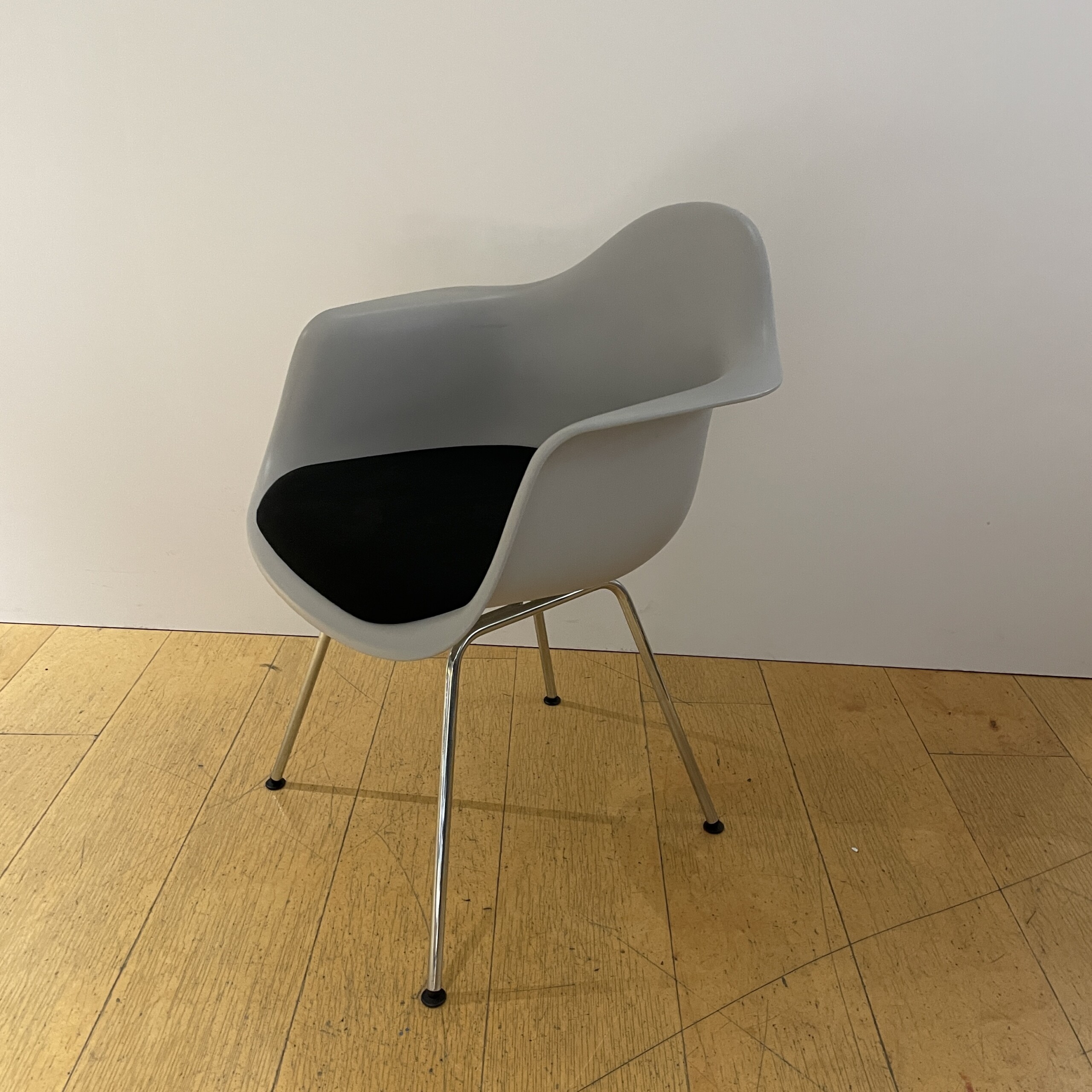 Sete i stoff (svart). Rygg i plast (grå). Ben i metall (krom).