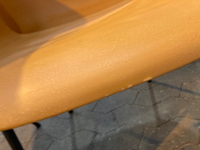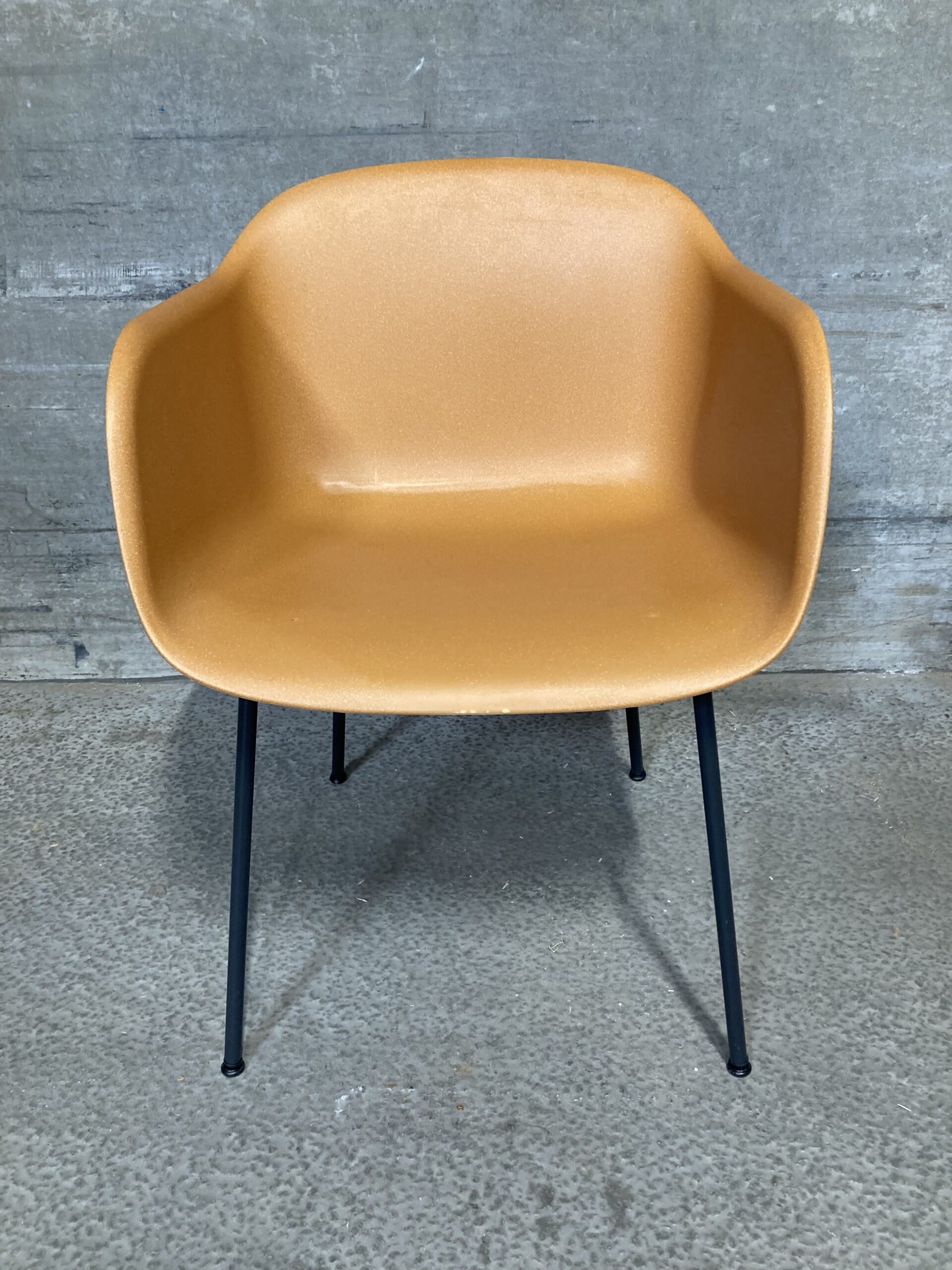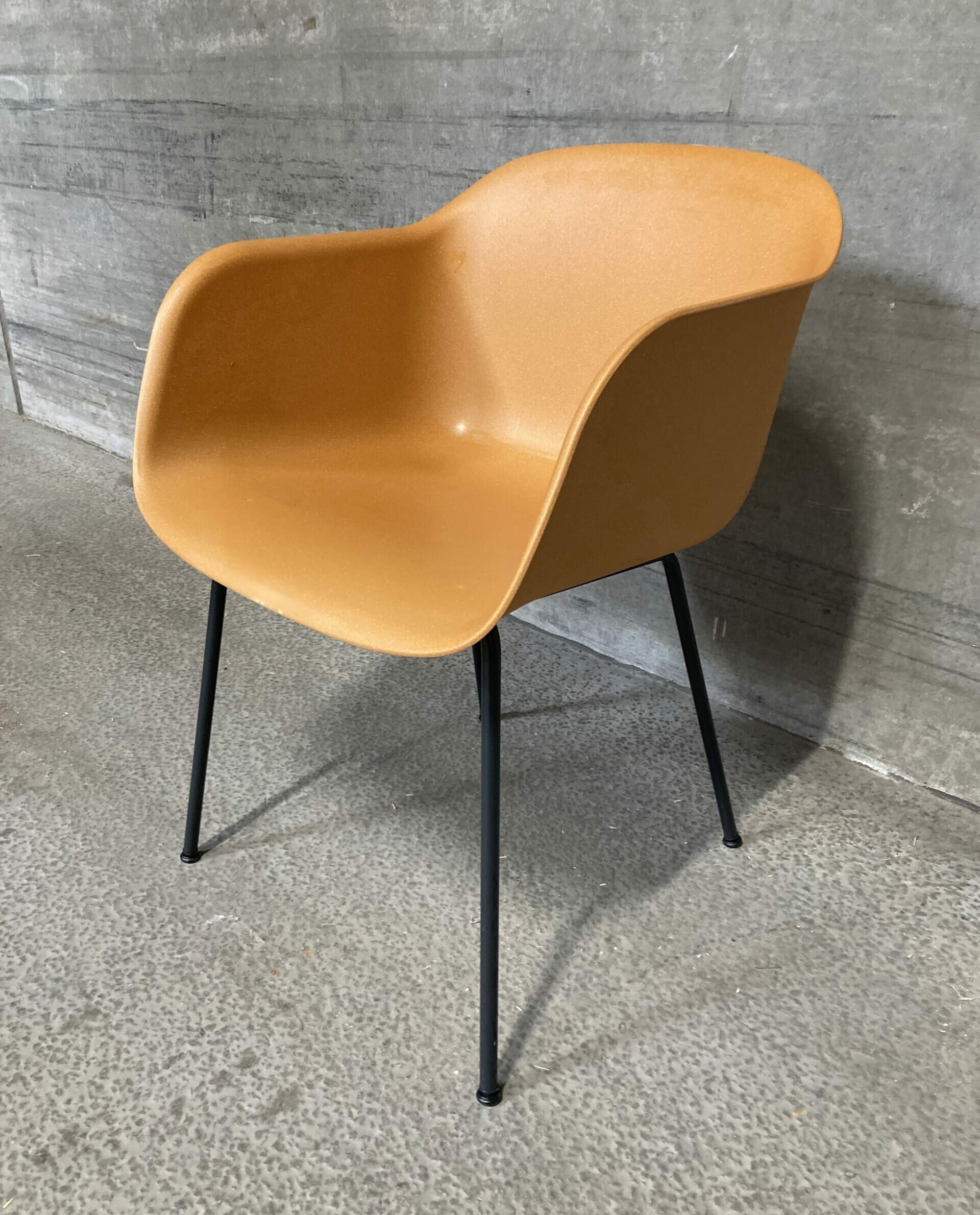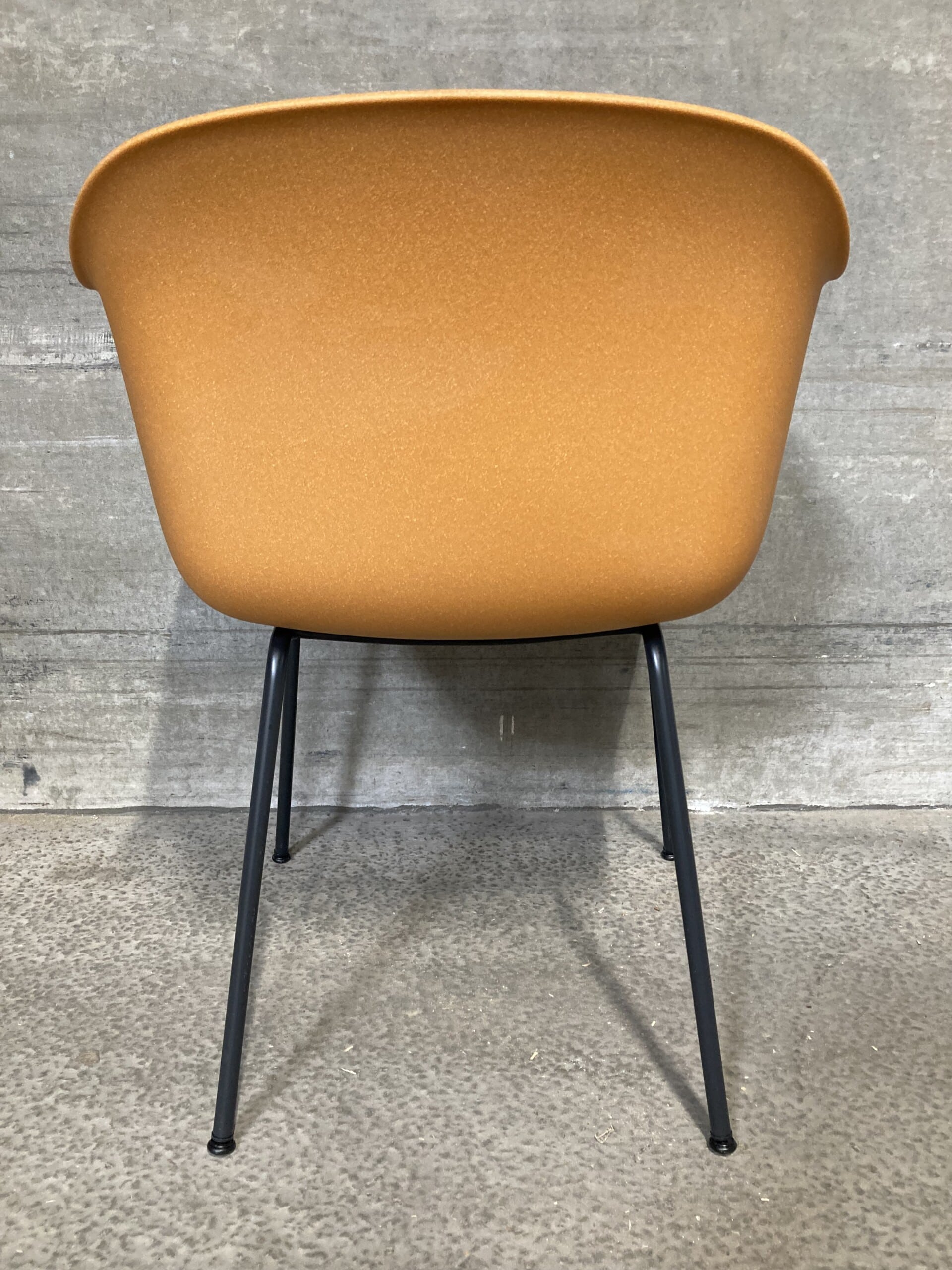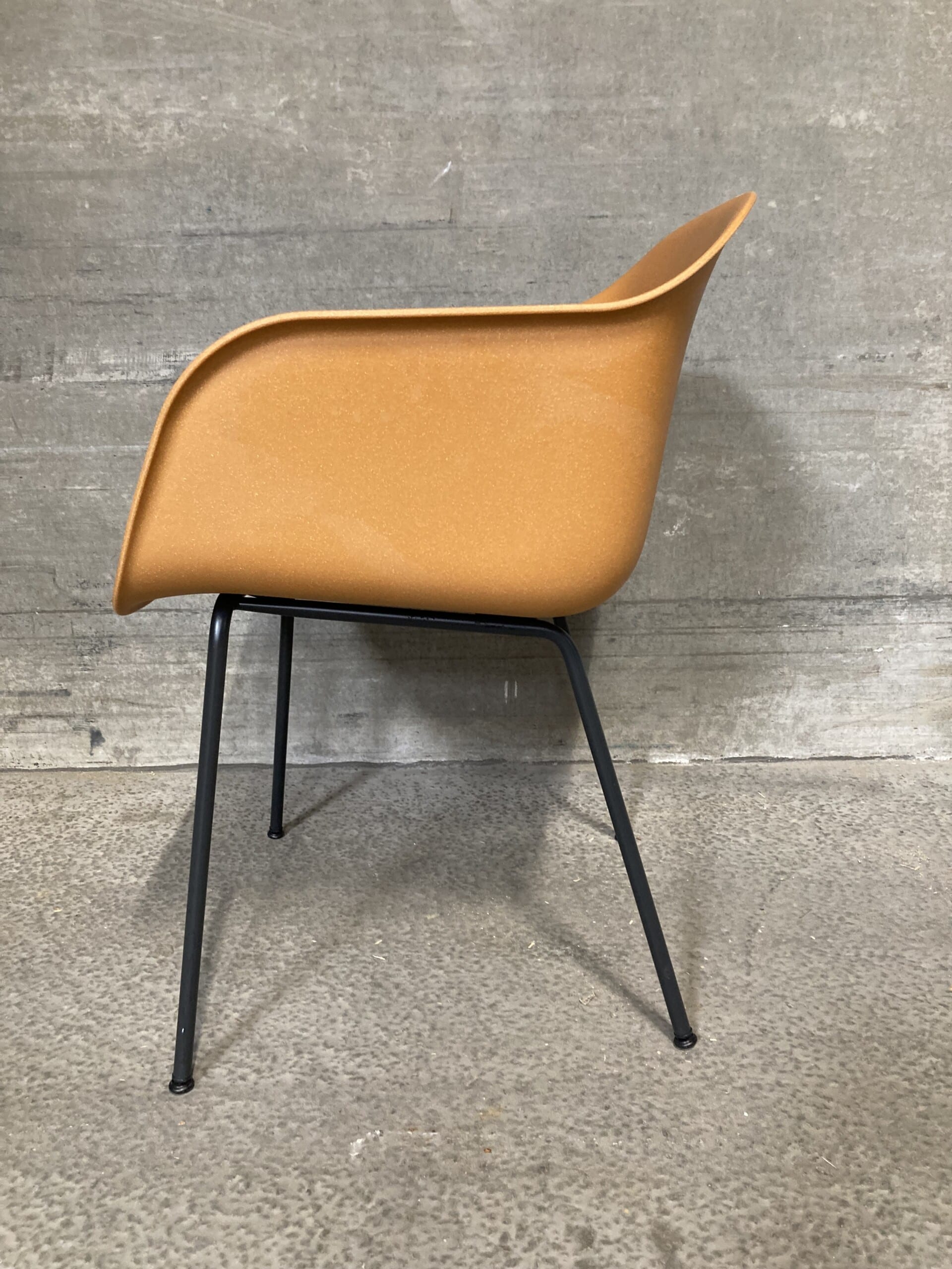 Sete og rygg i plast (brun). Ben i metall (svart).