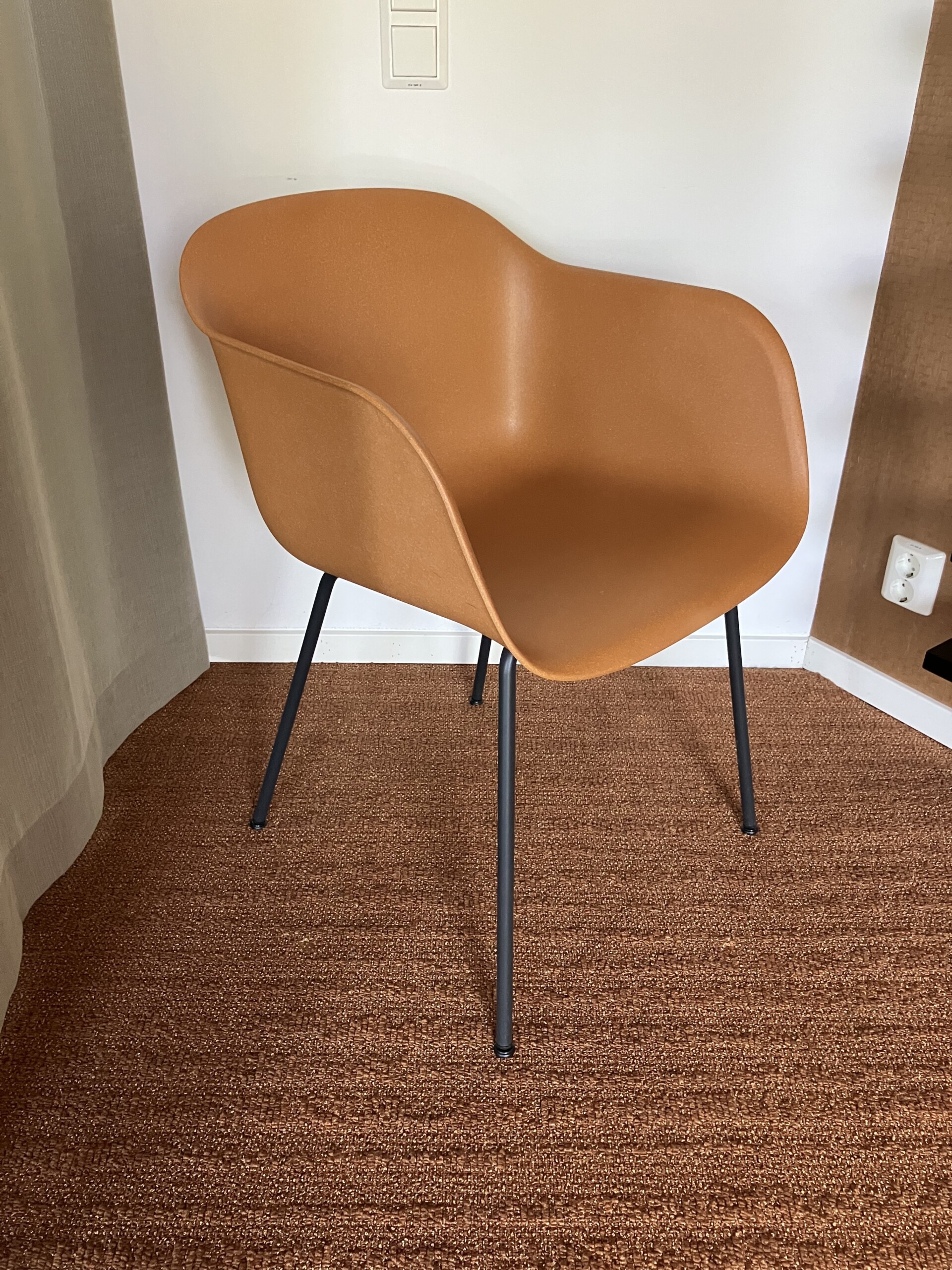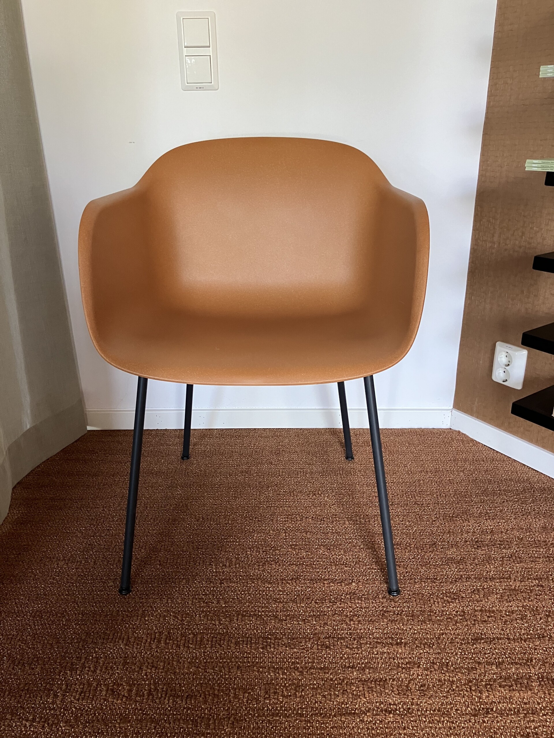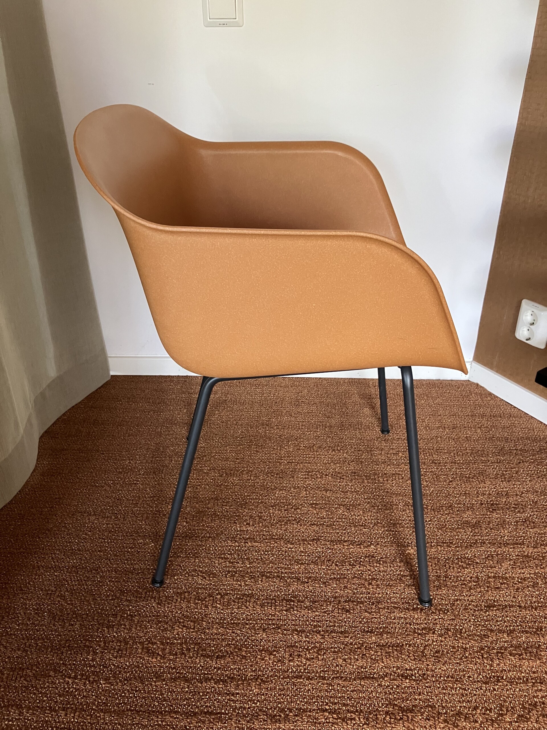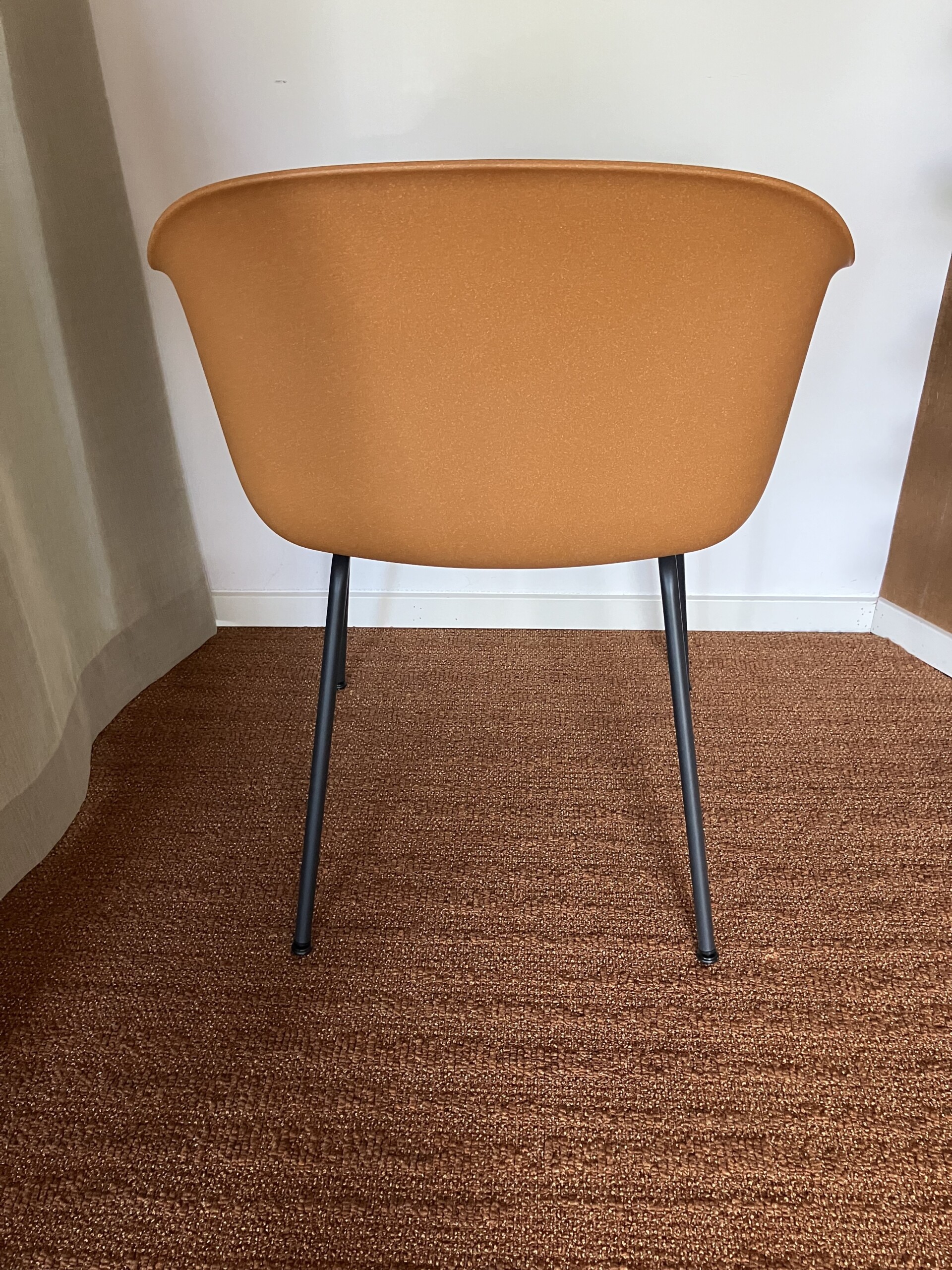 Sete og rygg i plast (oransje). Ben i metall (svart).