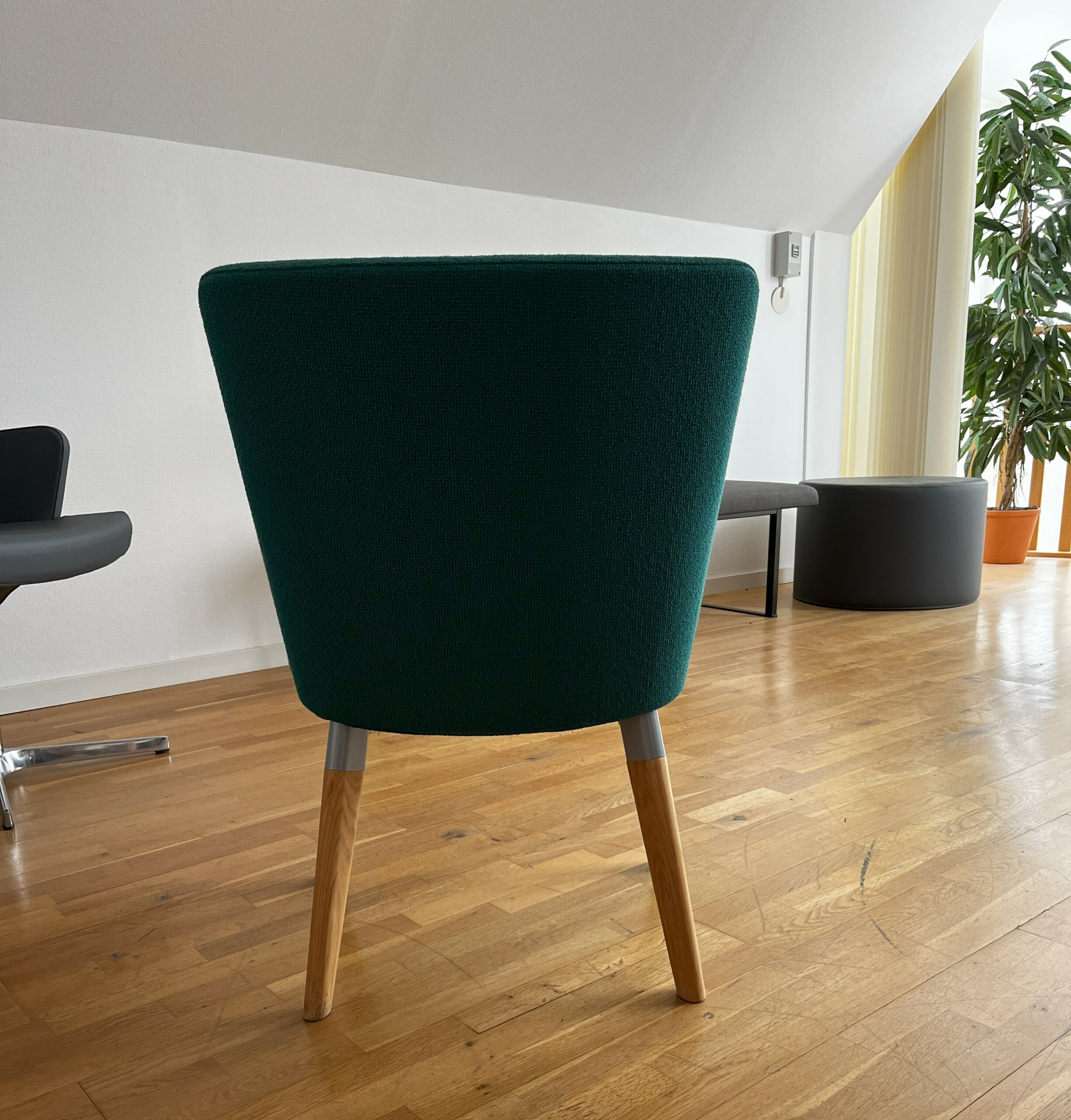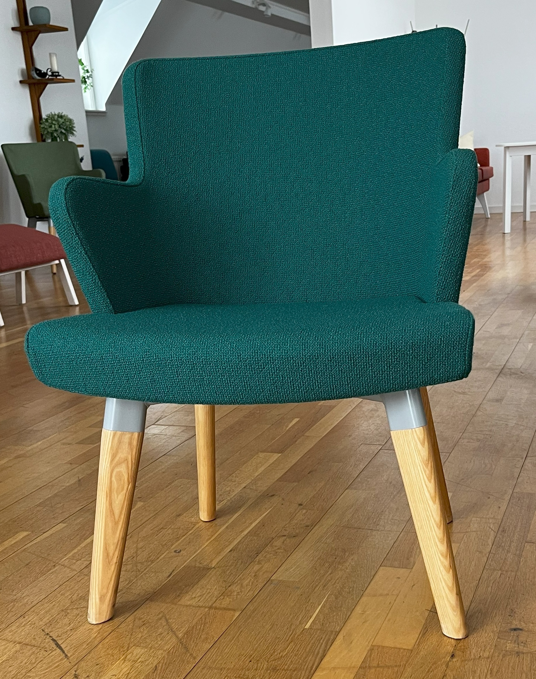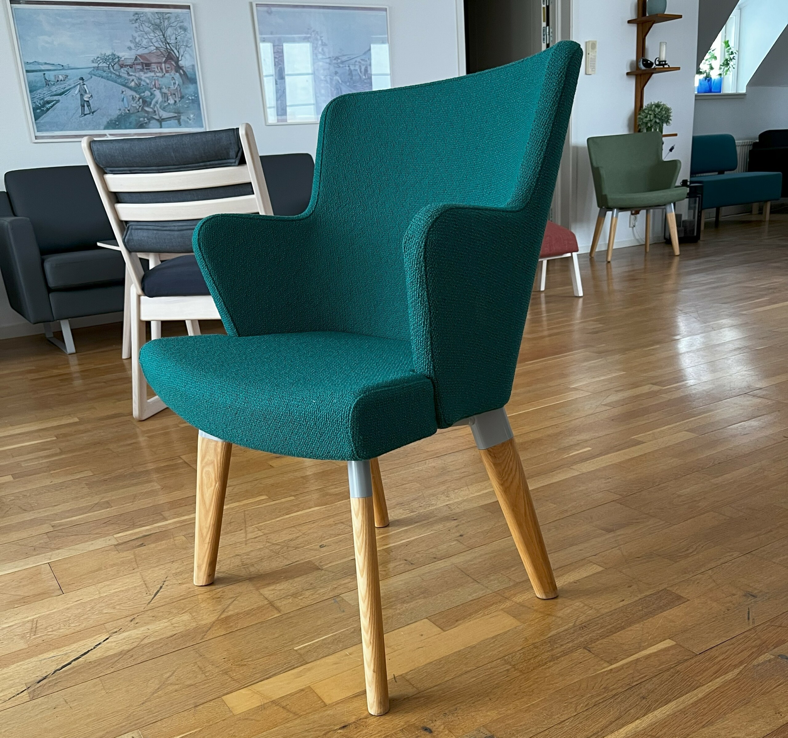 Sete og rygg i stoff (grønn). Ben i tre (ask).