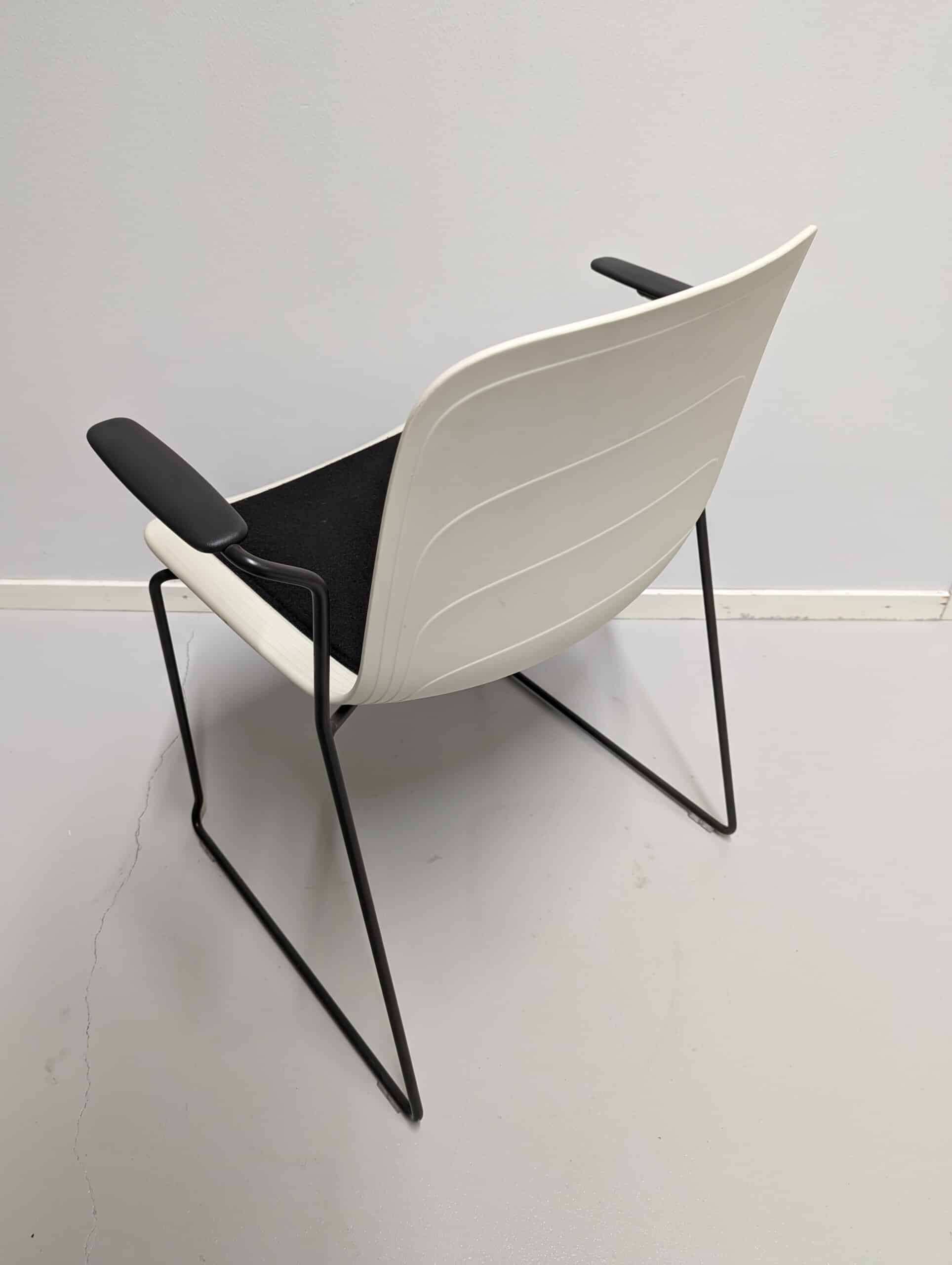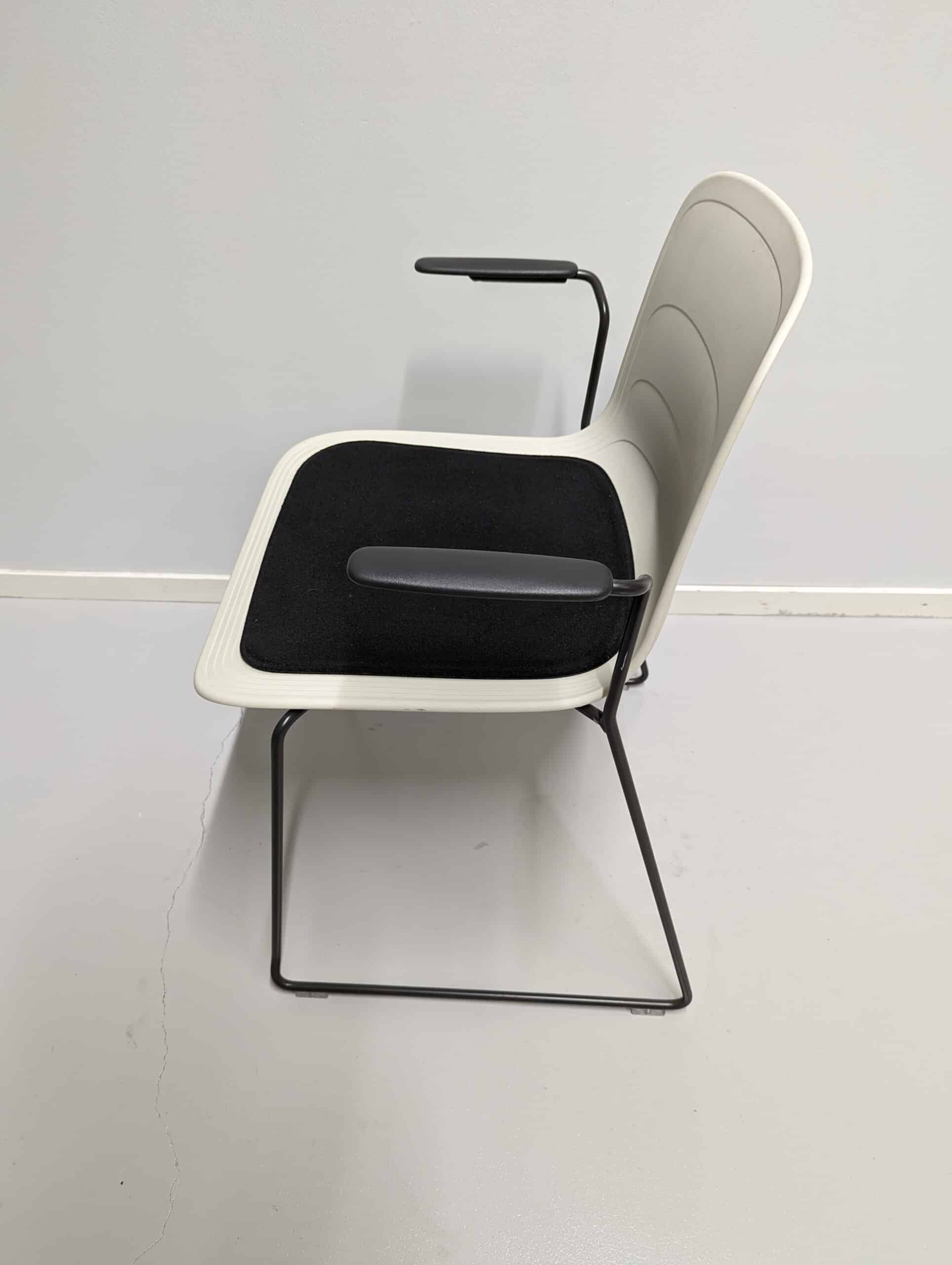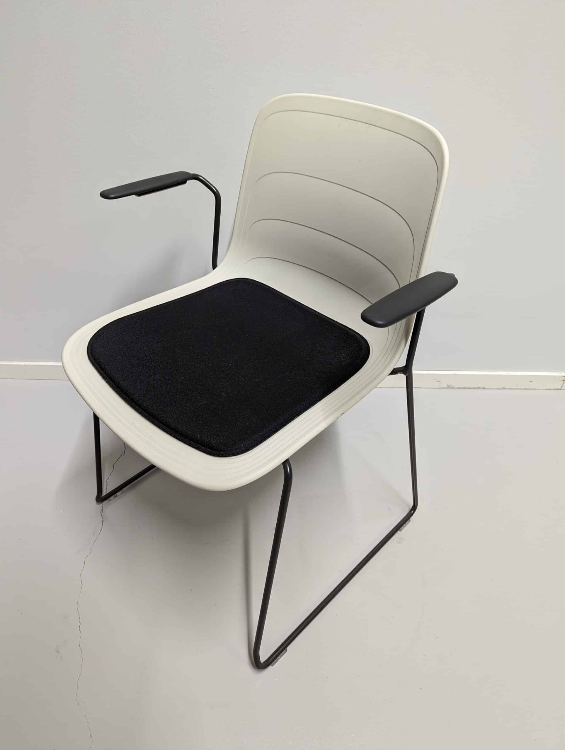 Sete i stoff (svart). Rygg i plast (hvit). Meiestativ i metall (svart).