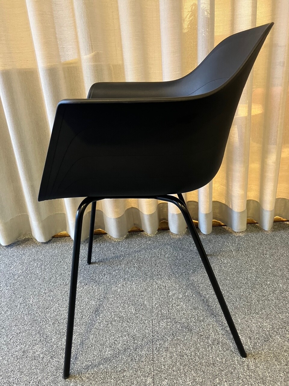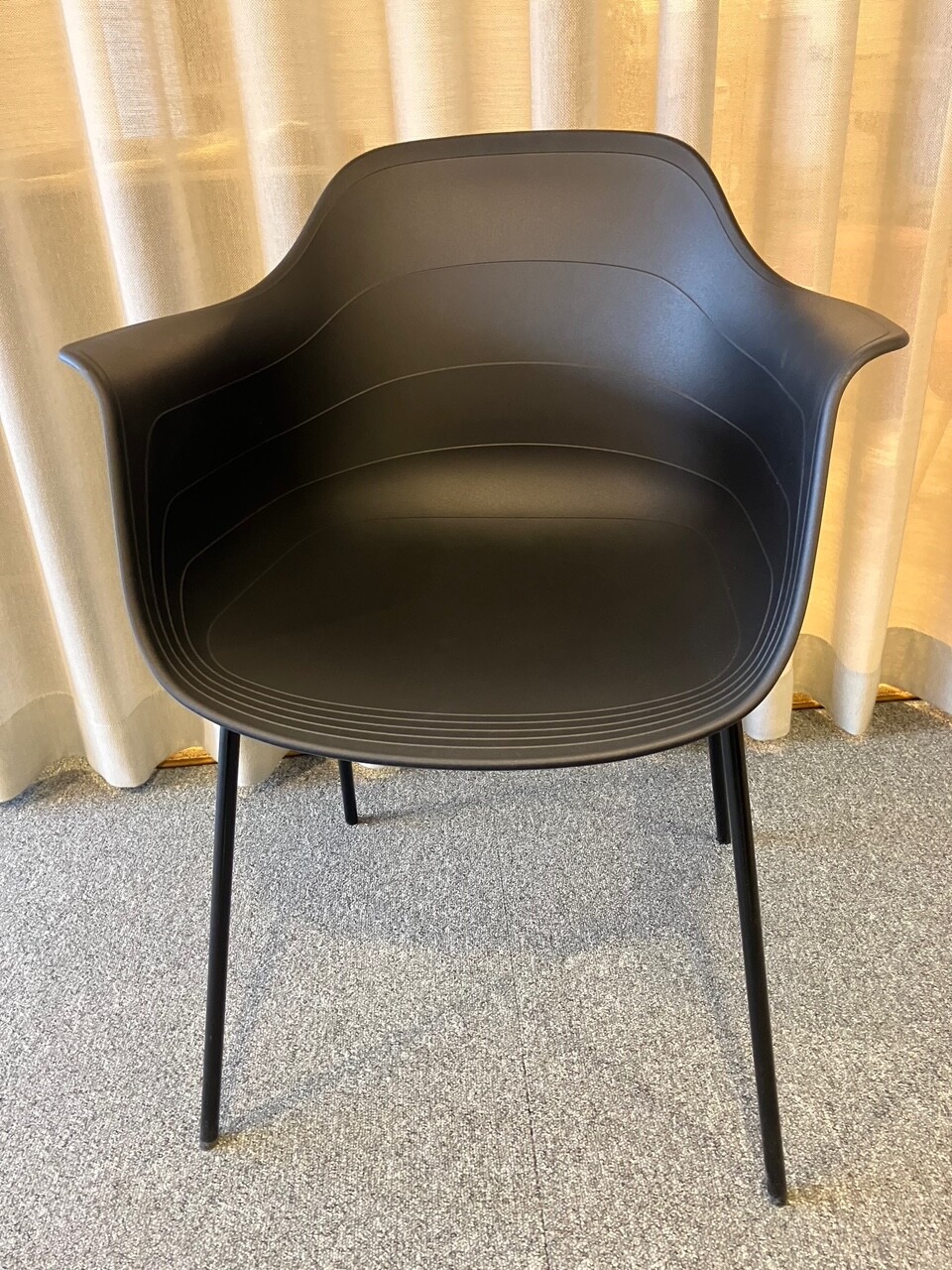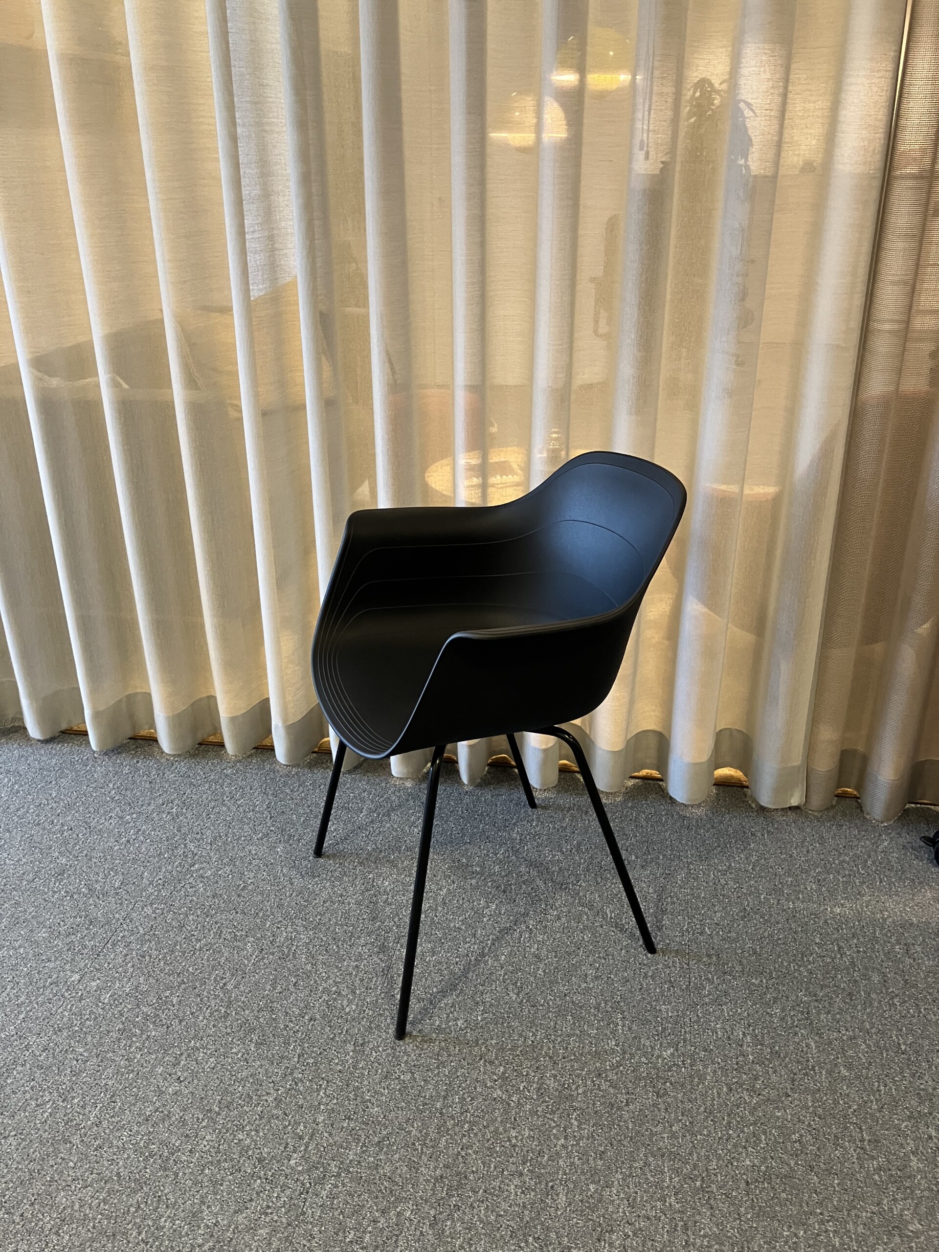 Sete og rygg i plast (svart). Ben i metall (svart).