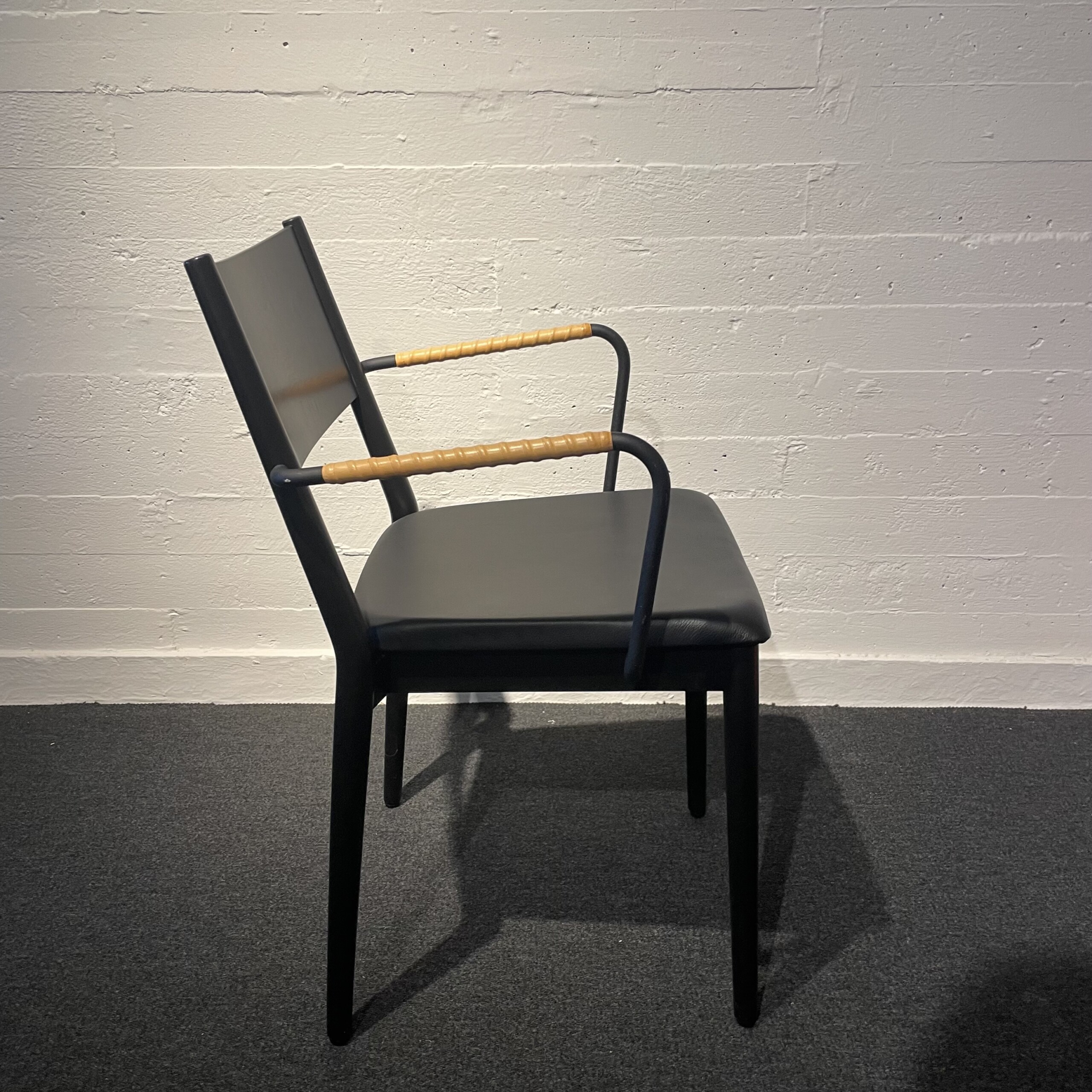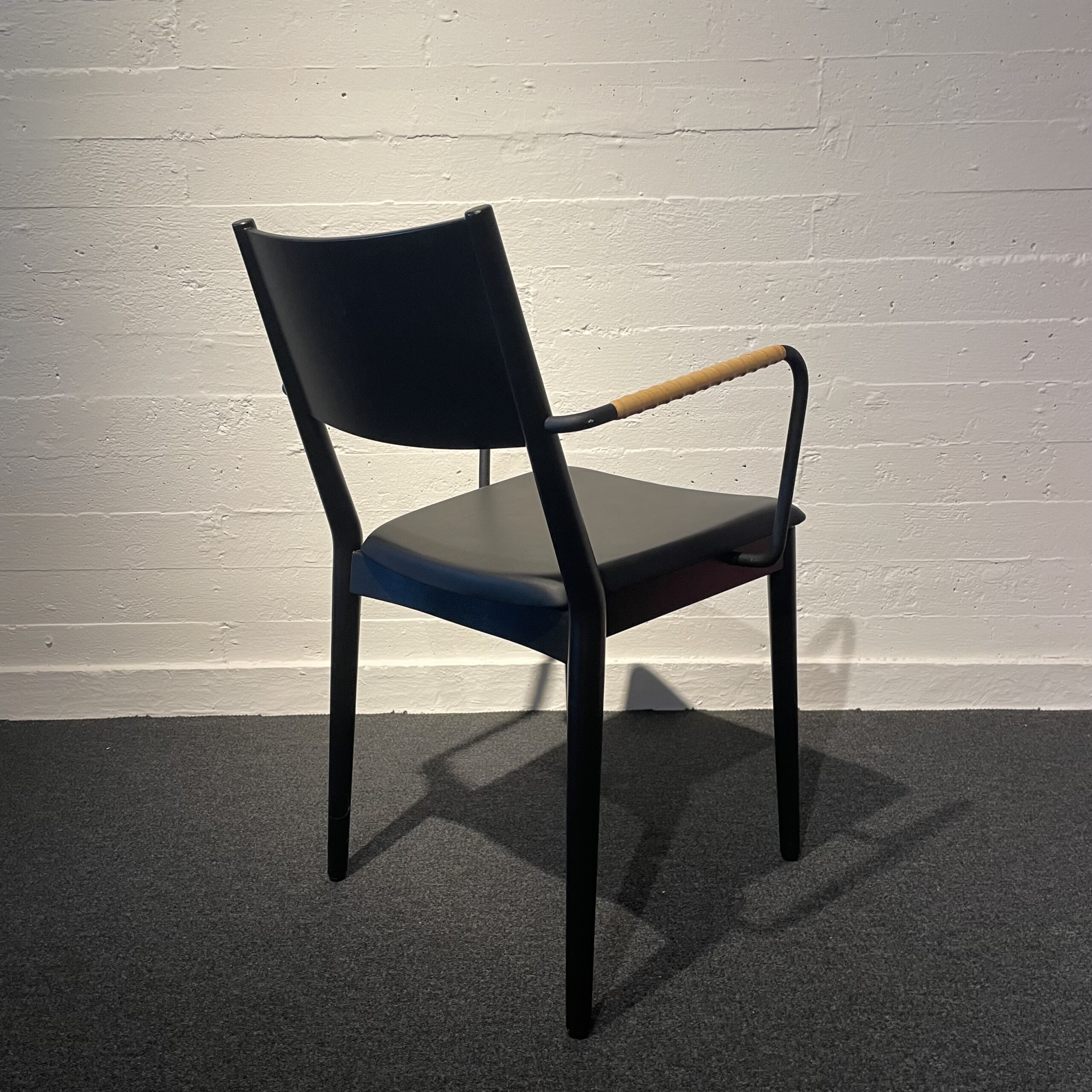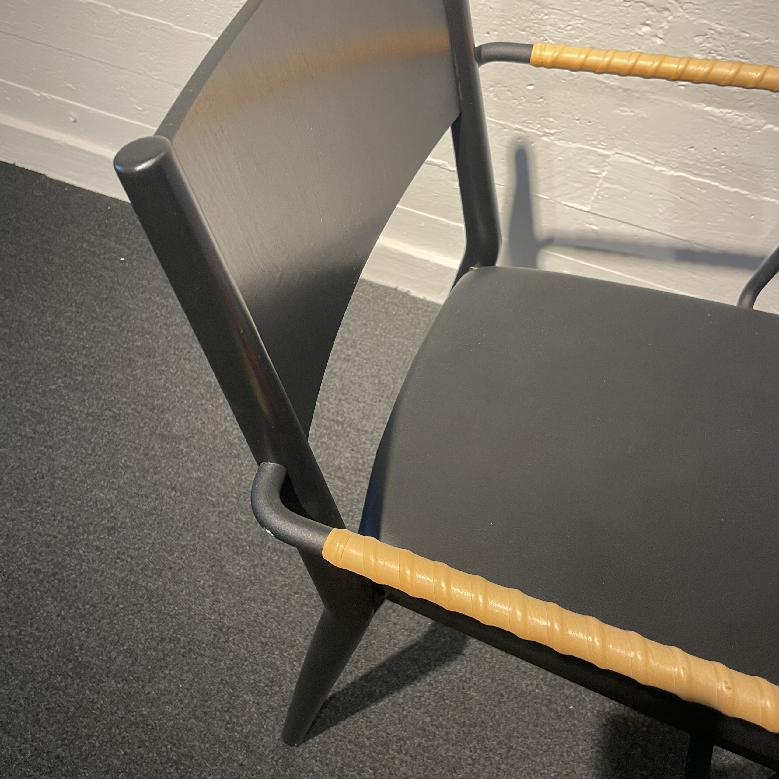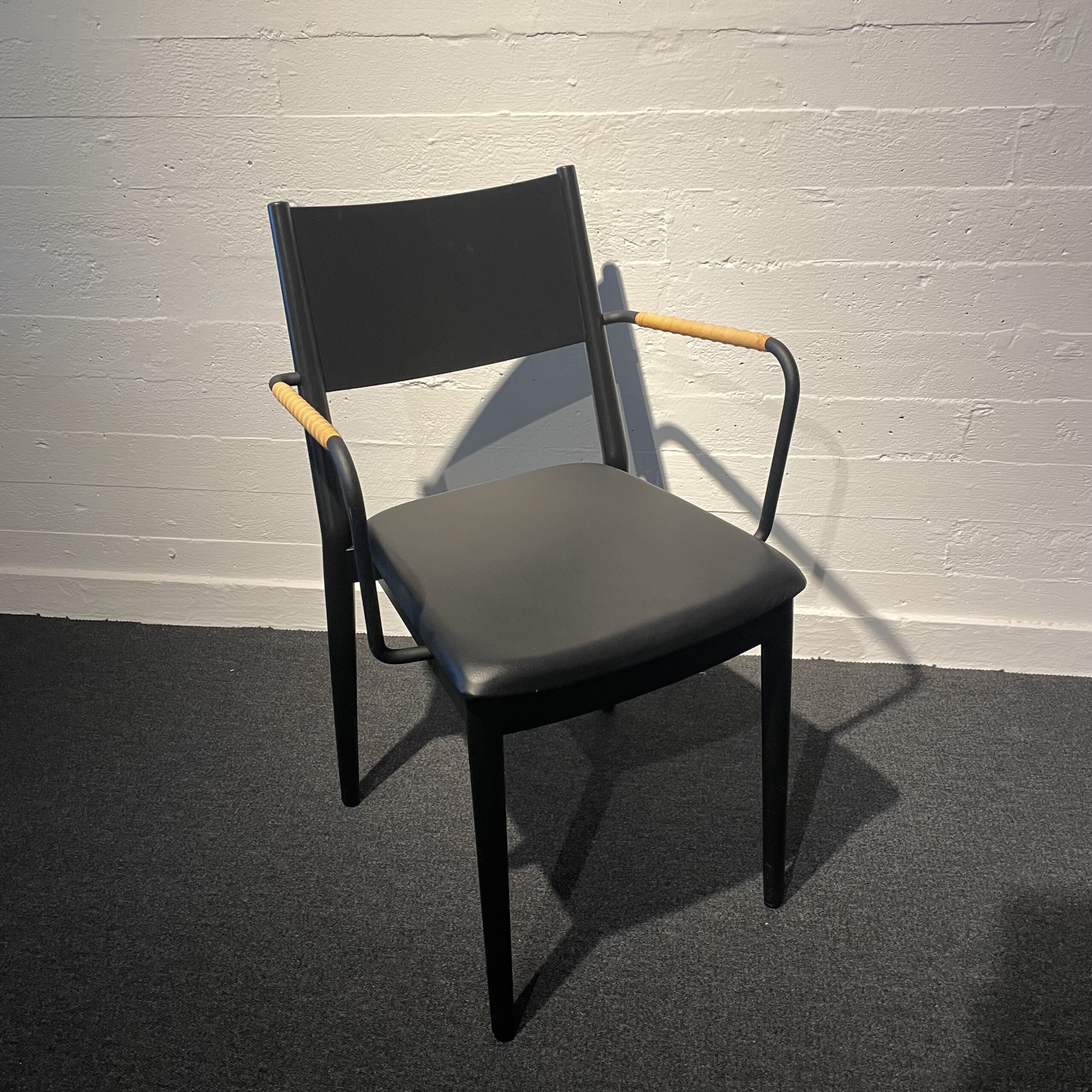 Sete i skinn (svart). Rygg i tre (svart). Ben i tre (svart).