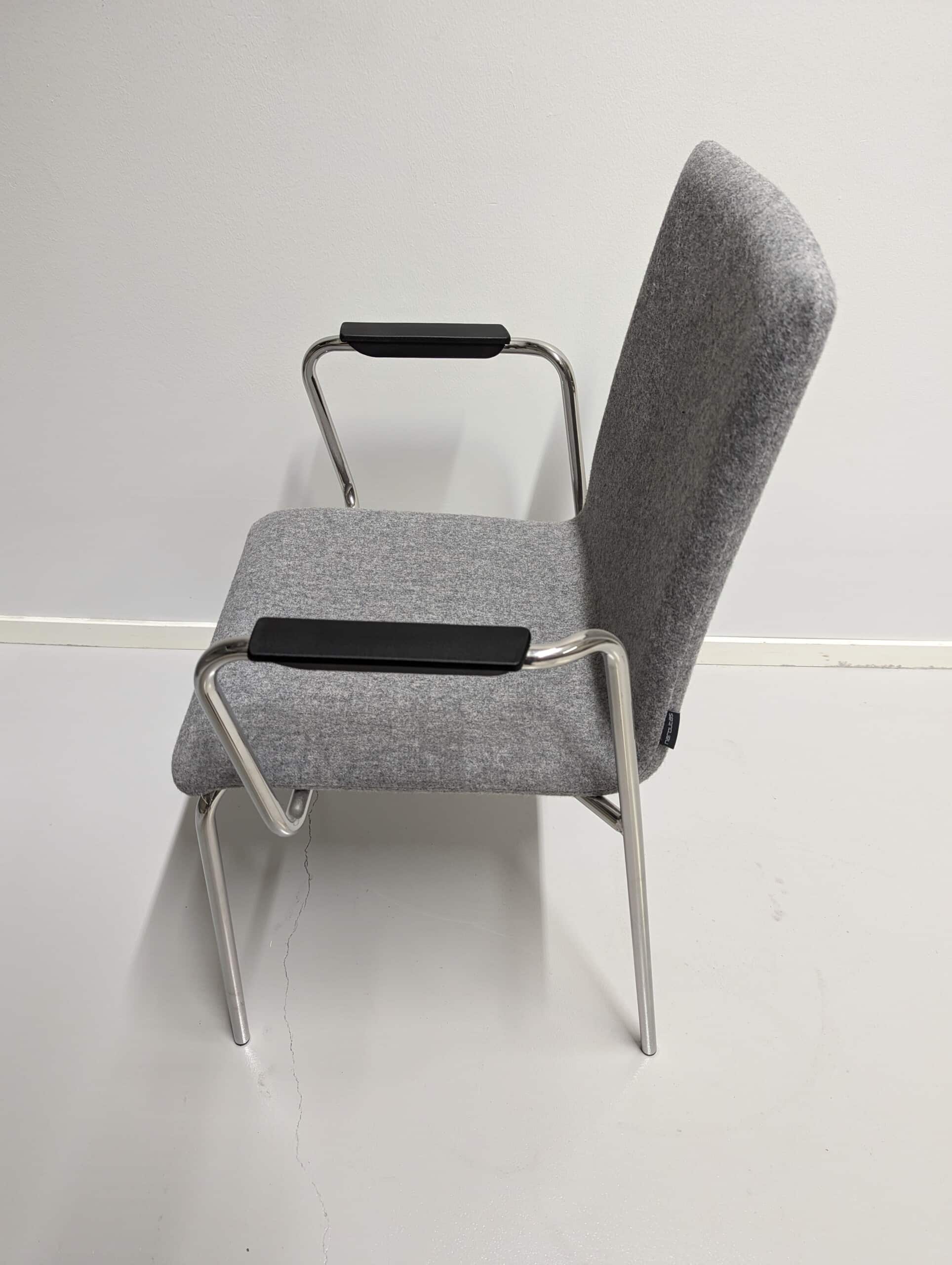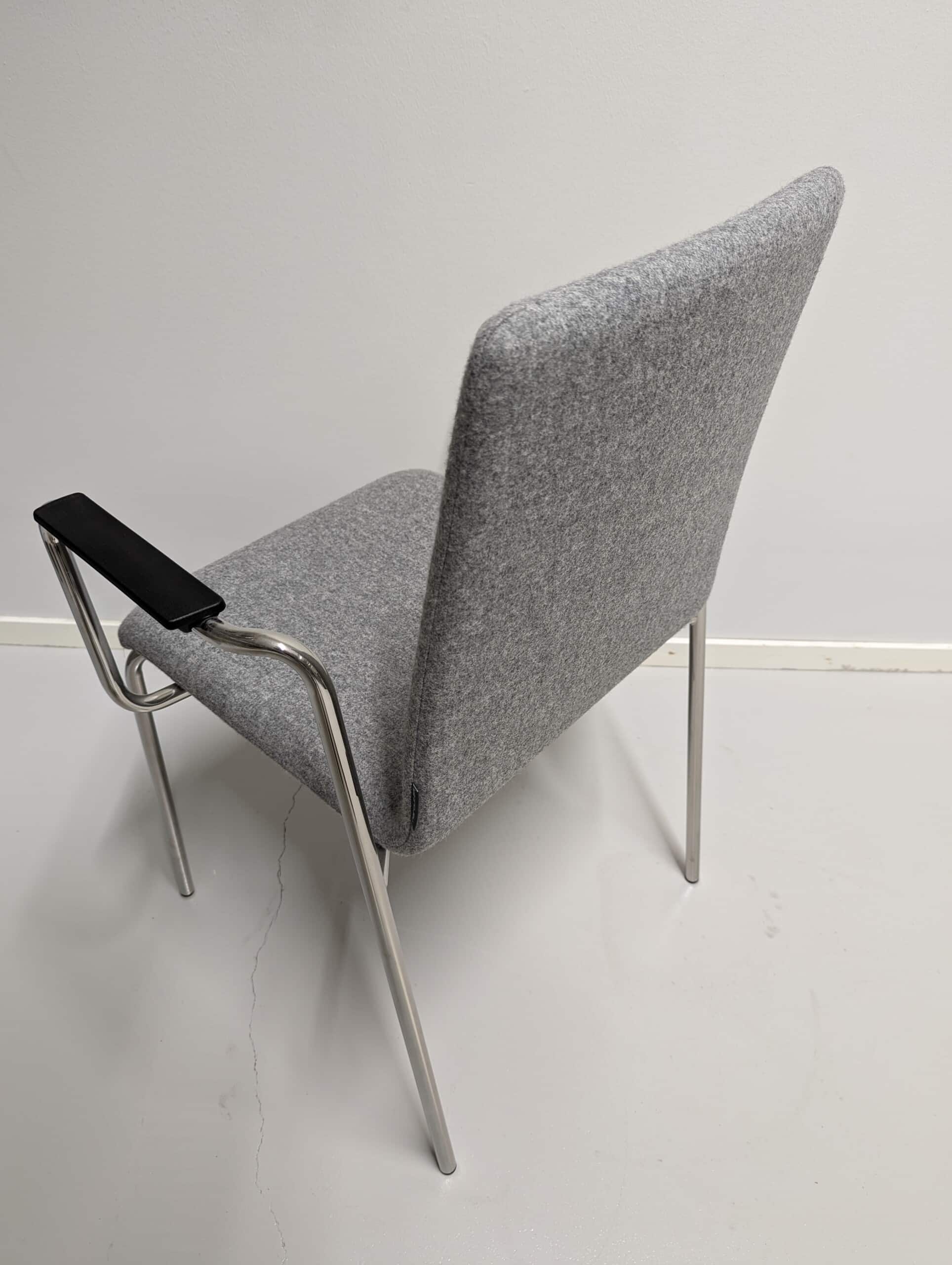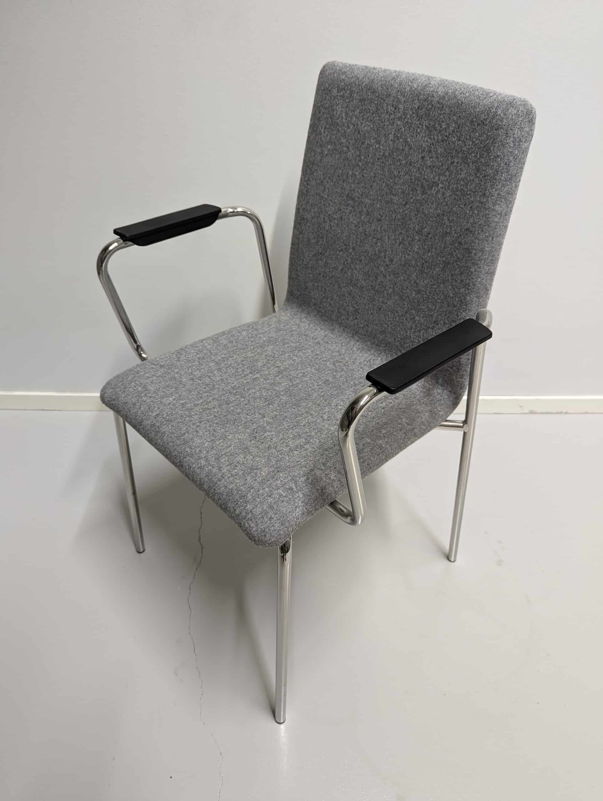 Sete og rygg i stoff (grå). Ben i metall (krom).