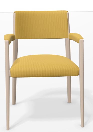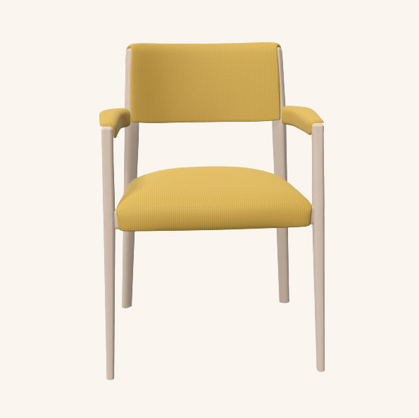 Sete og rygg i stoff (gul). Ben i tre (bjørk).