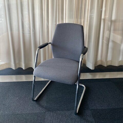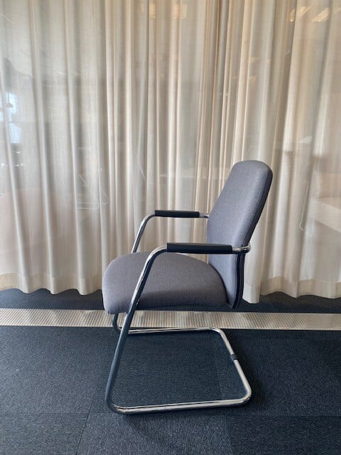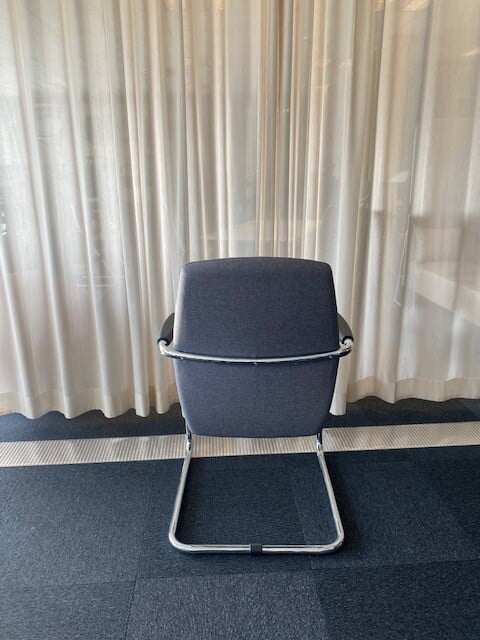 Sete og rygg i stoff (blå). Meiestativ i metall (krom).