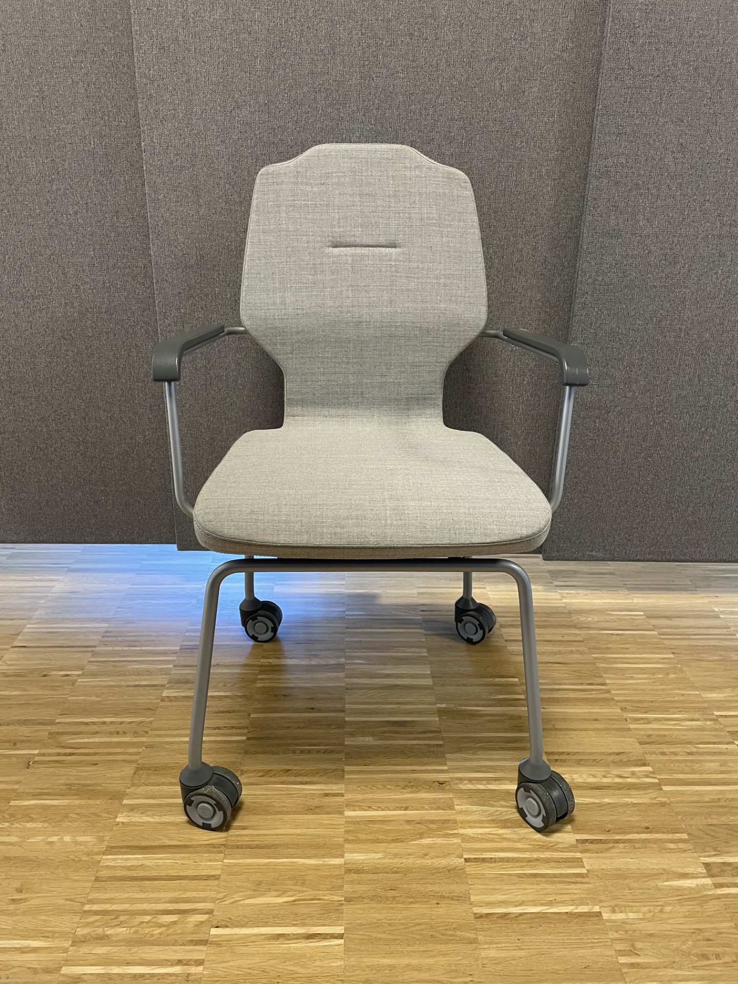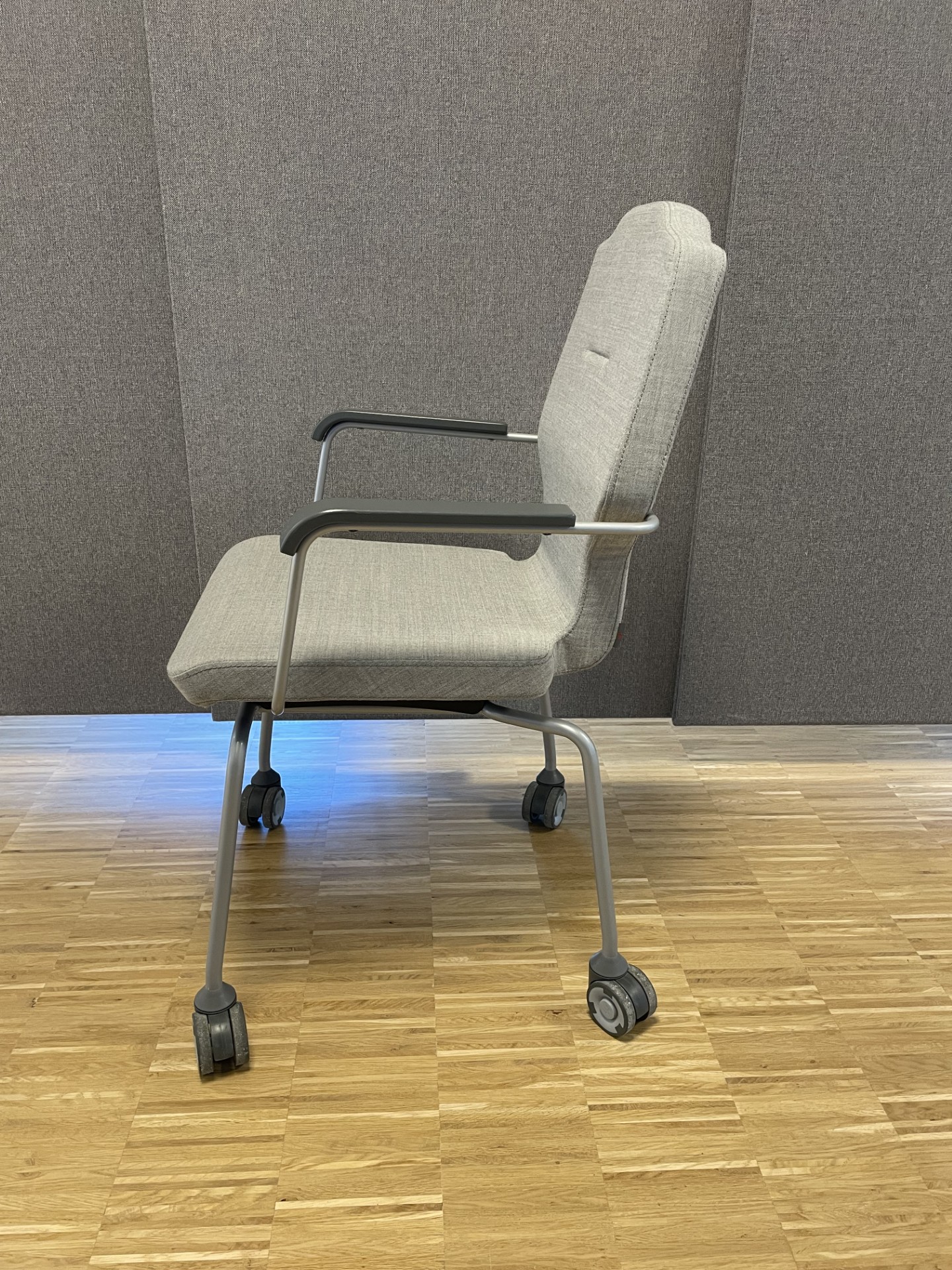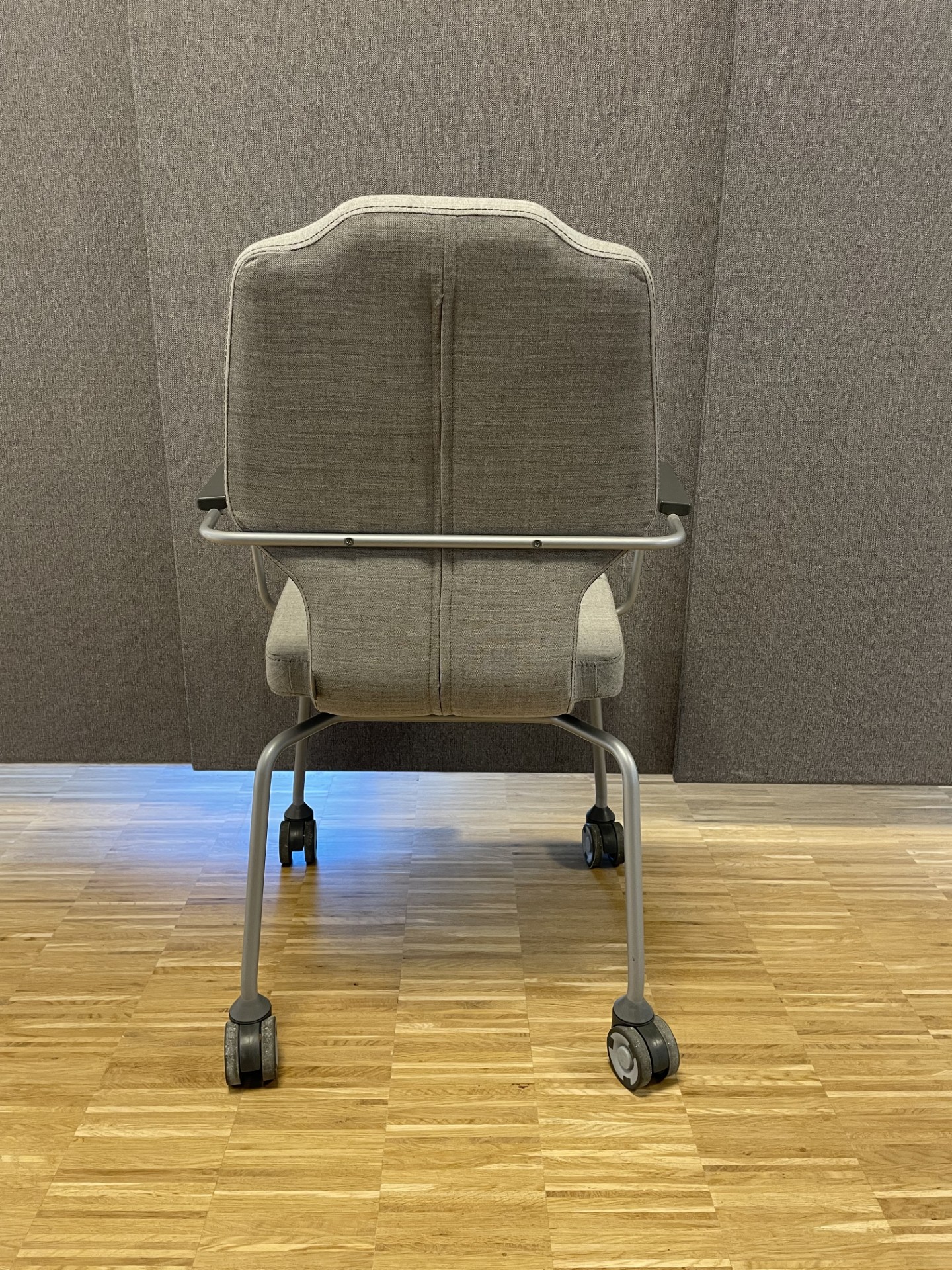 Sete og rygg i stoff (grå). Ben i metall (sølv).