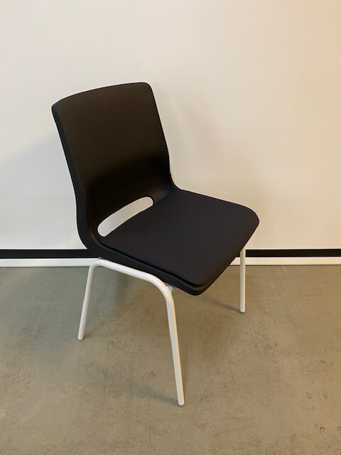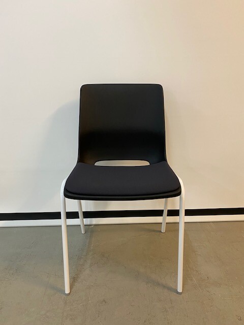 Sete i stoff (grå). Rygg i plast (grå). Ben i metall (hvit).