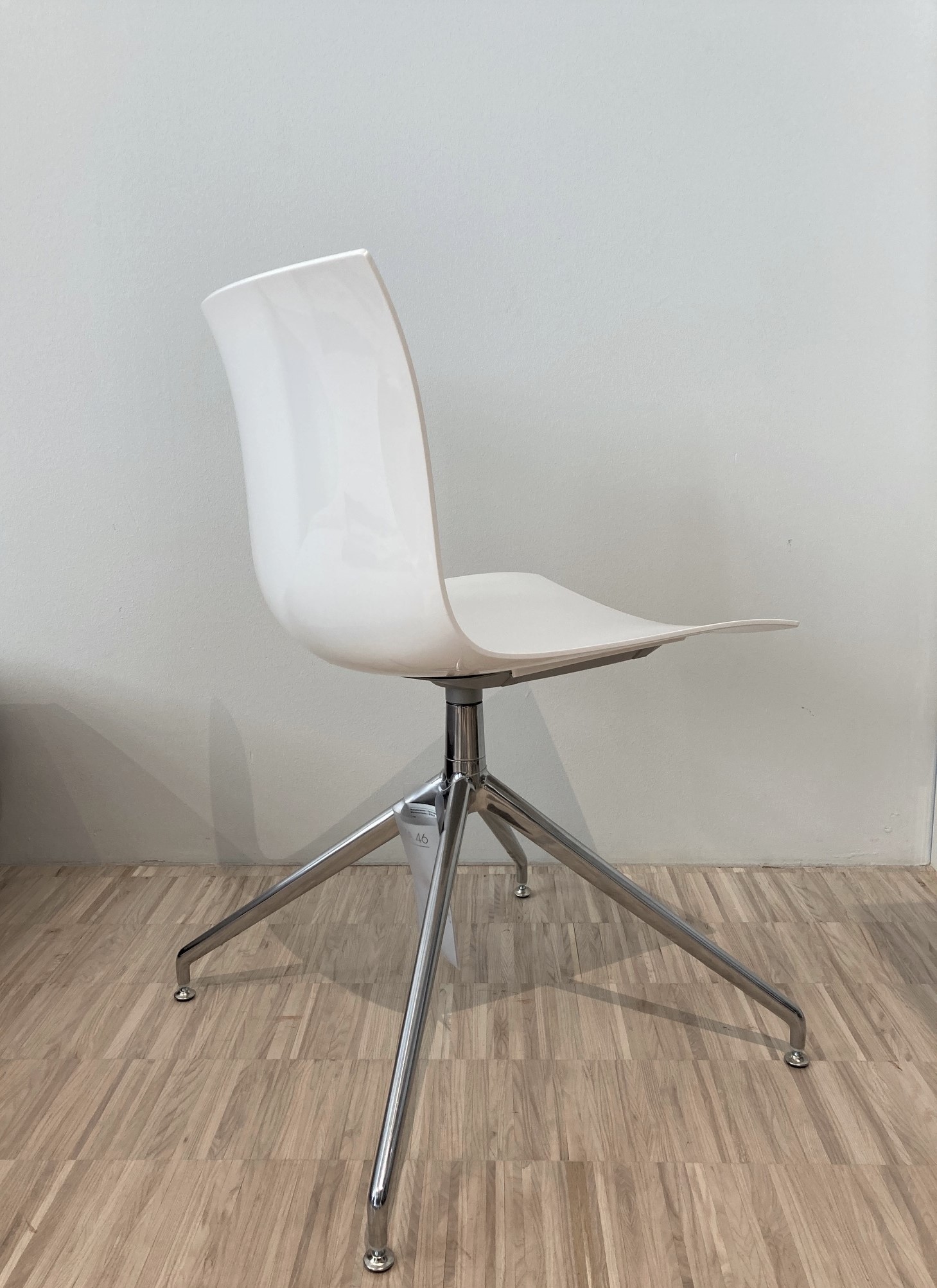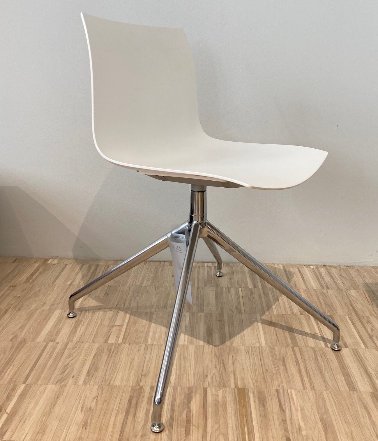 Sete og rygg i plast (hvit). Kryssfot i metall (aluminium).