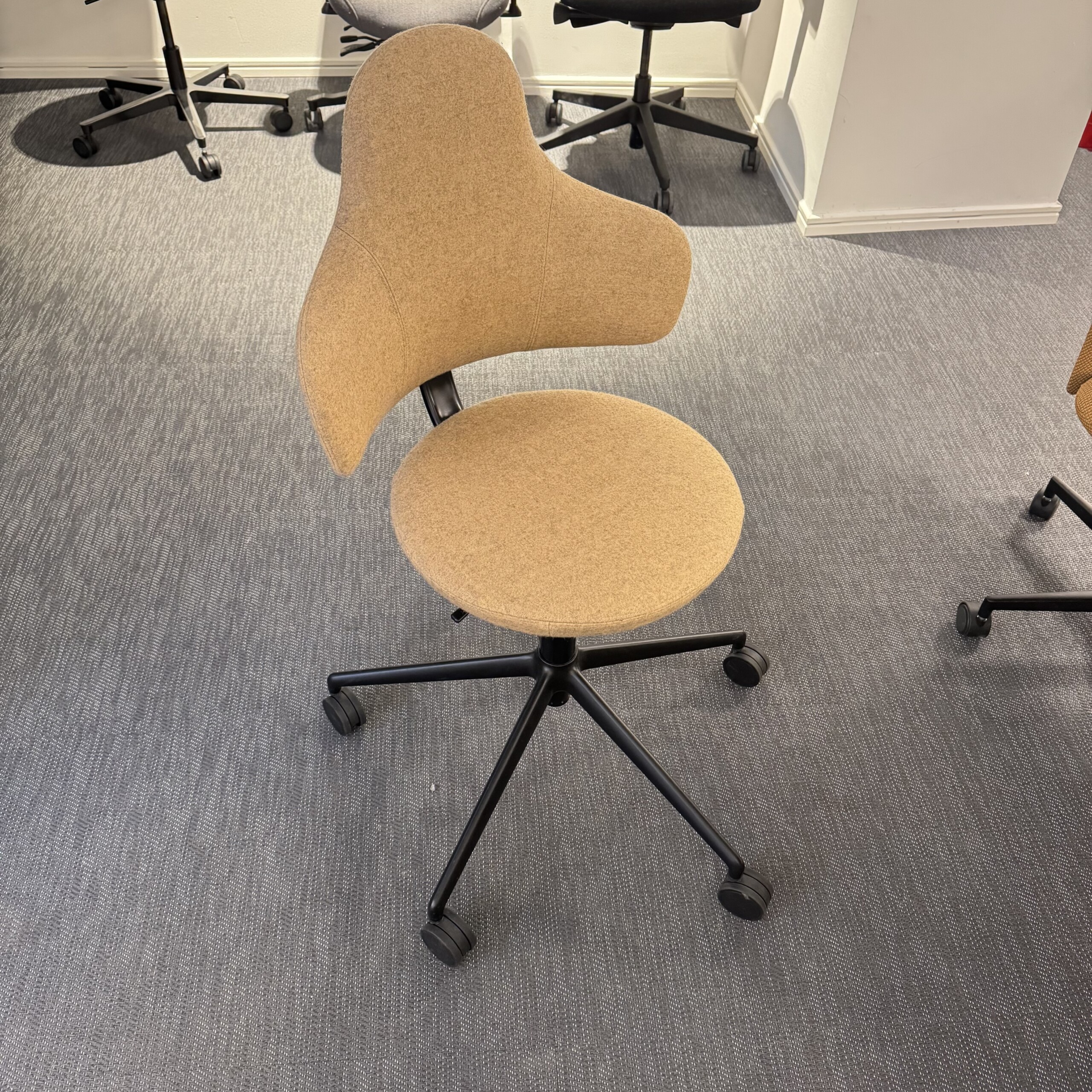 Sete og rygg i stoff (brun). Kryssfot i metall (svart). Høydejusterbar