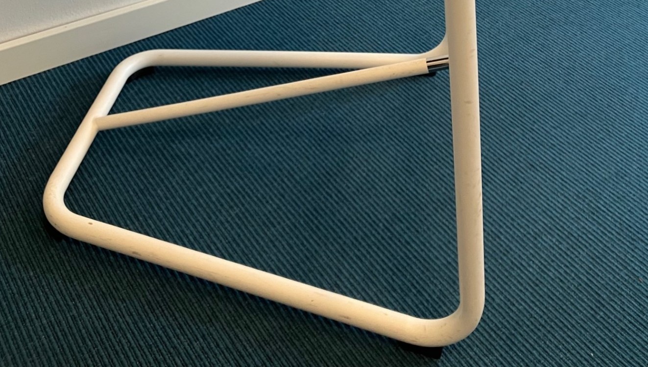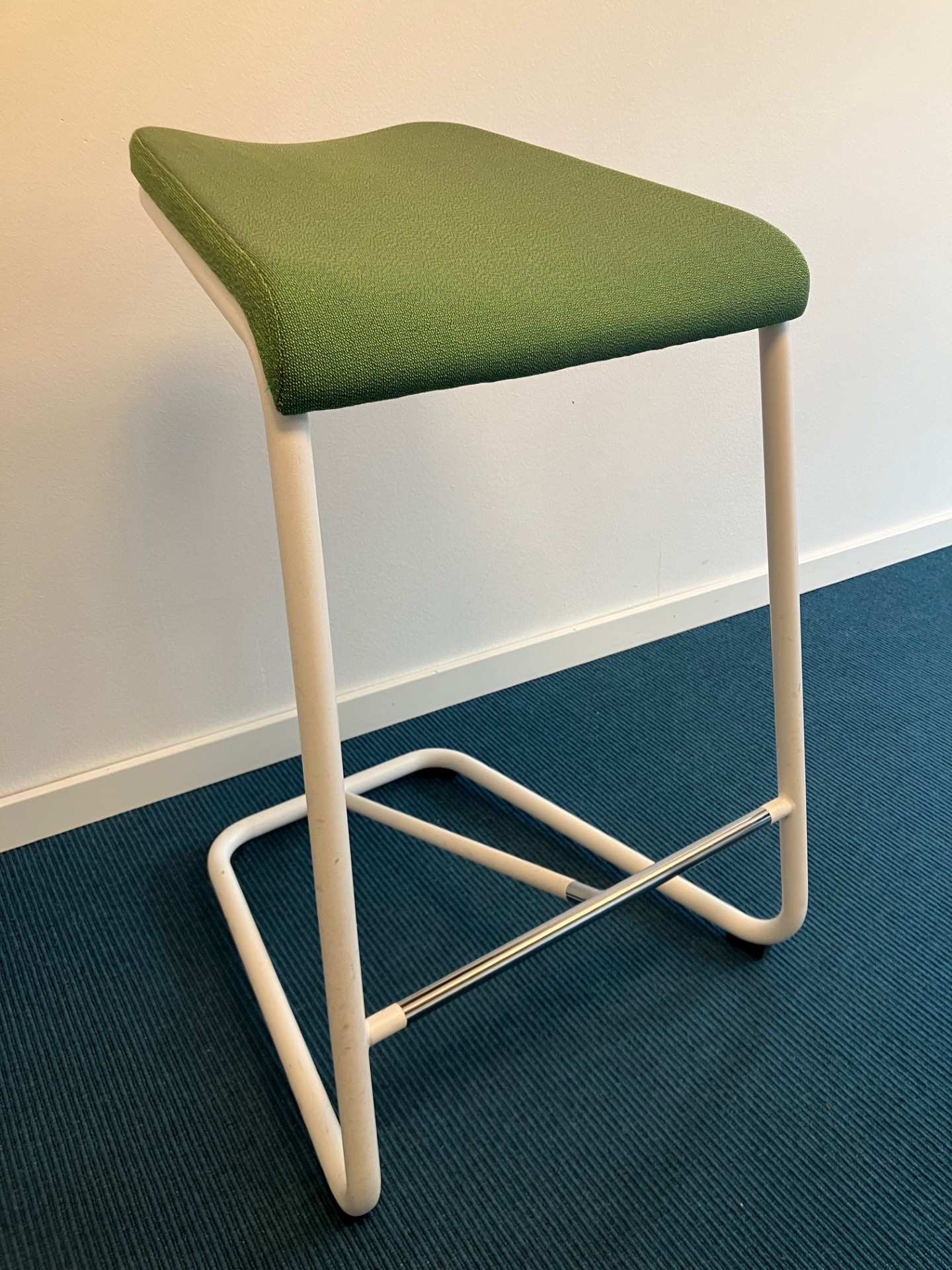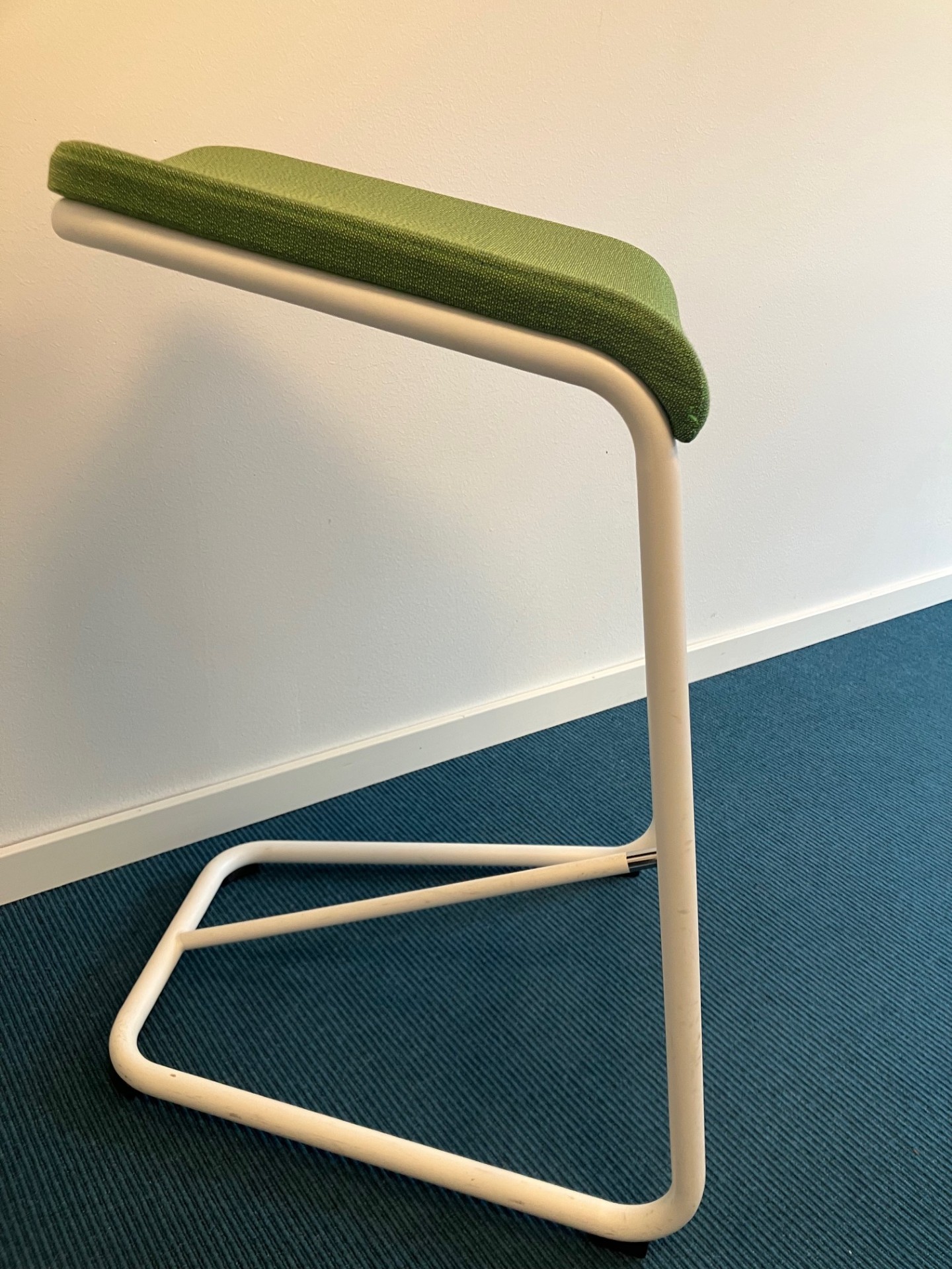 Sete i stoff (grønn). Meiestativ i metall (hvit).