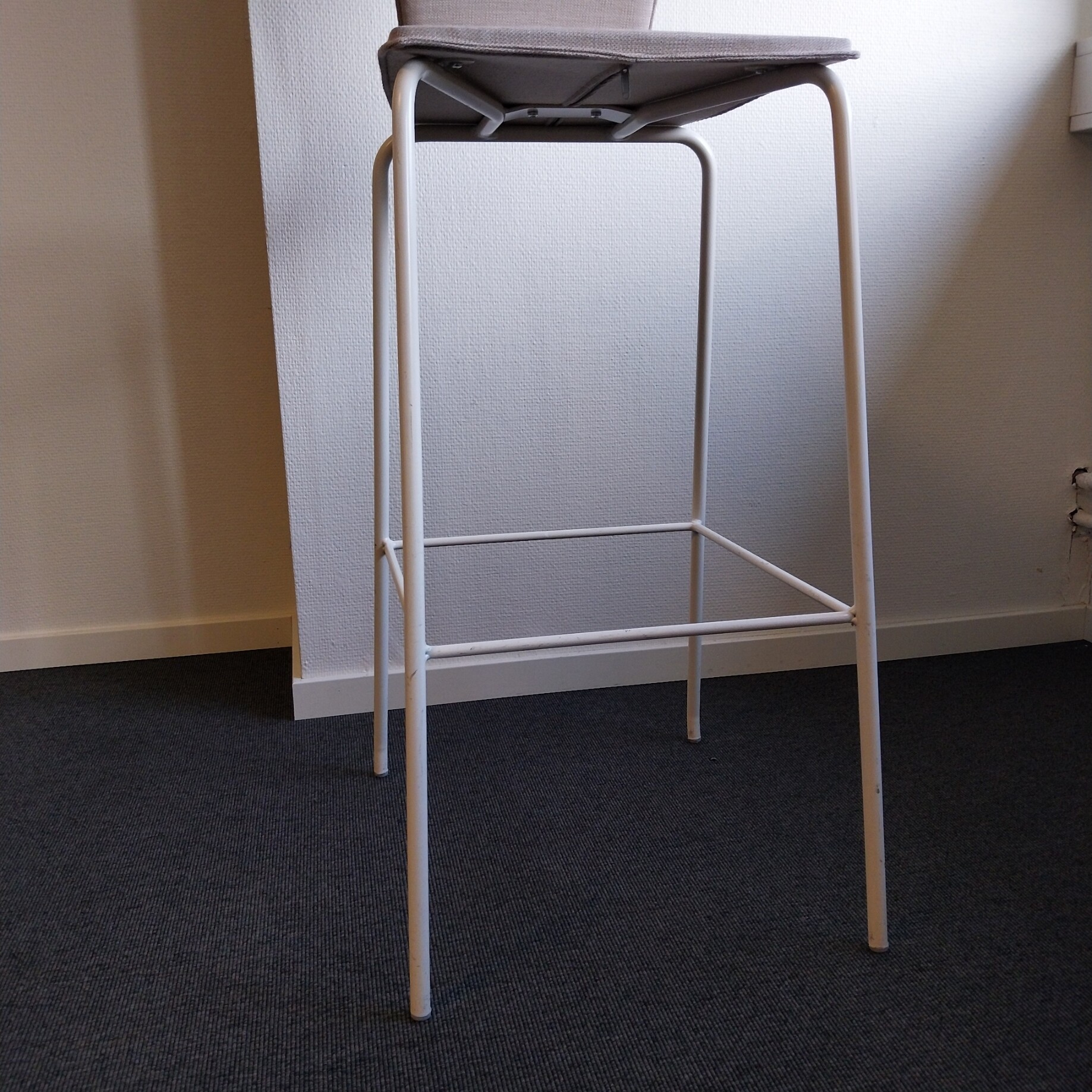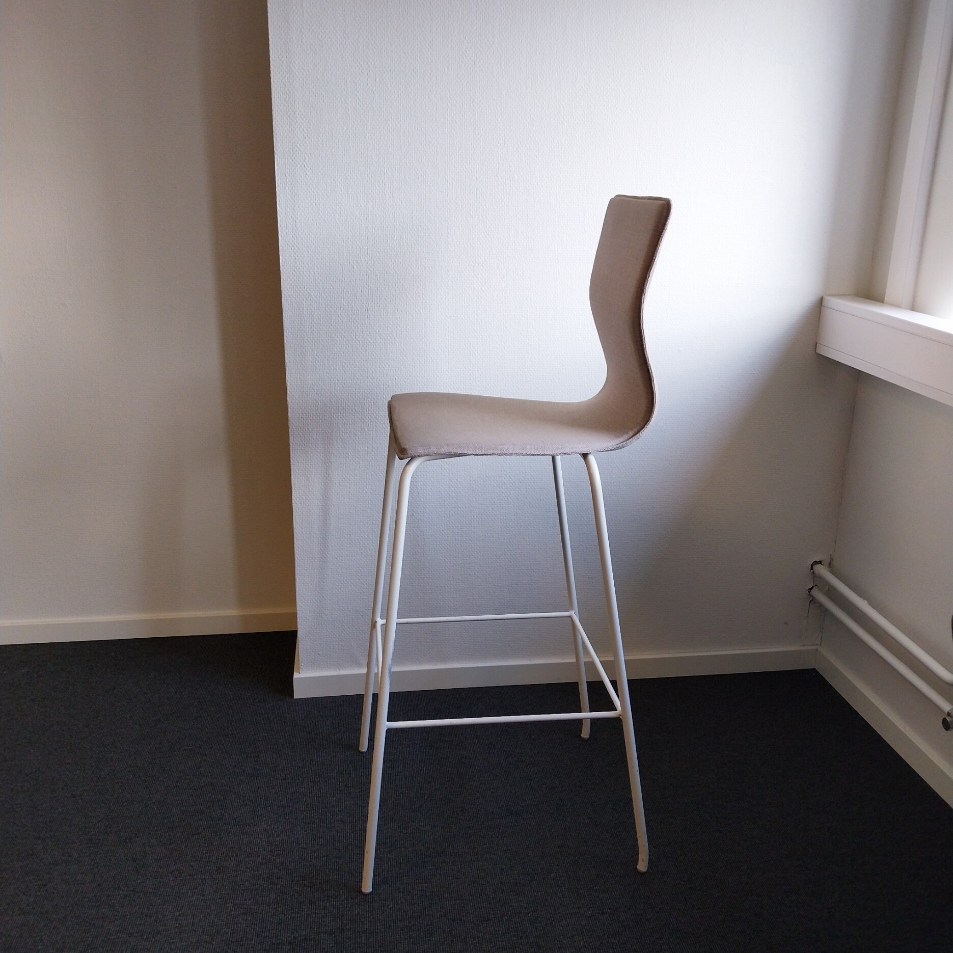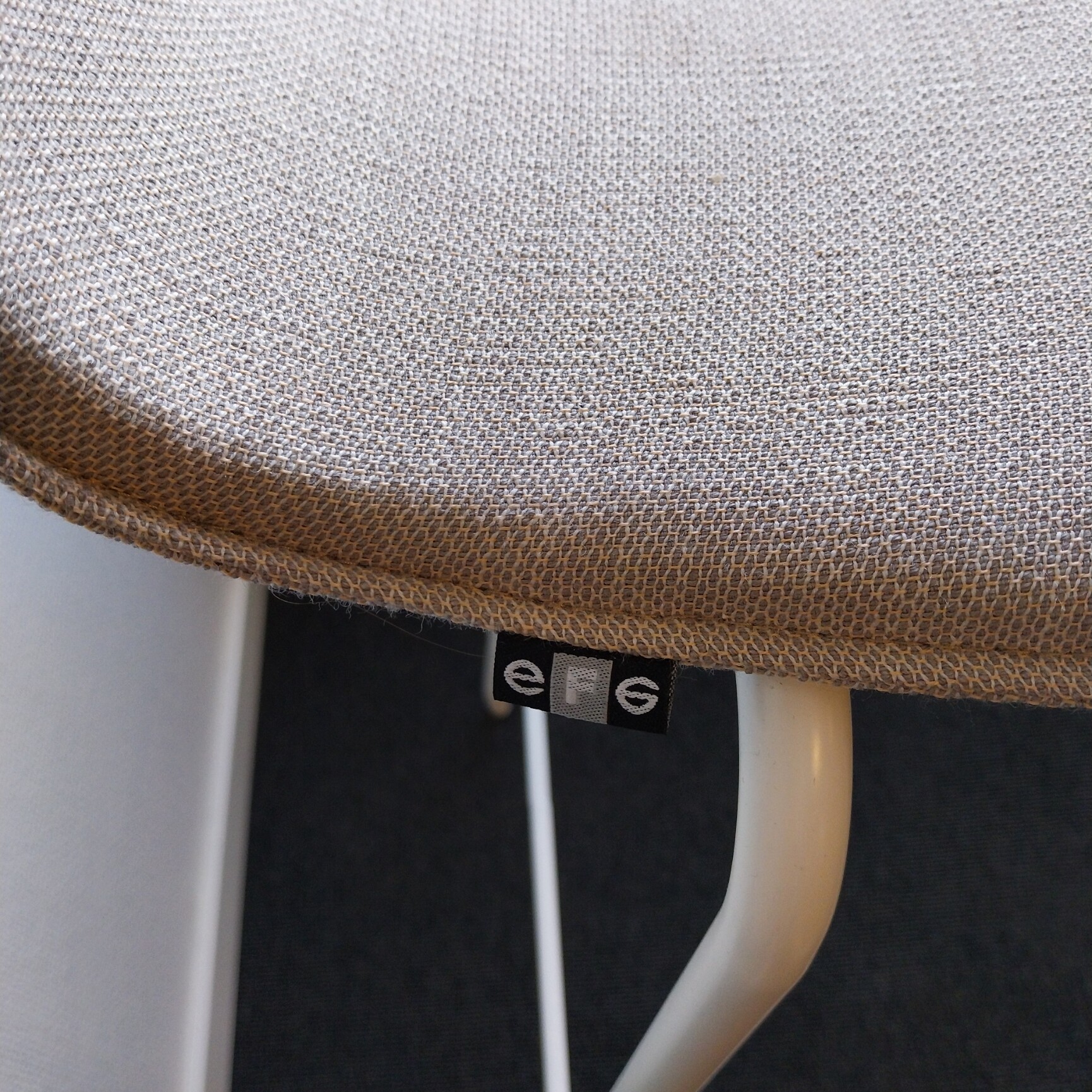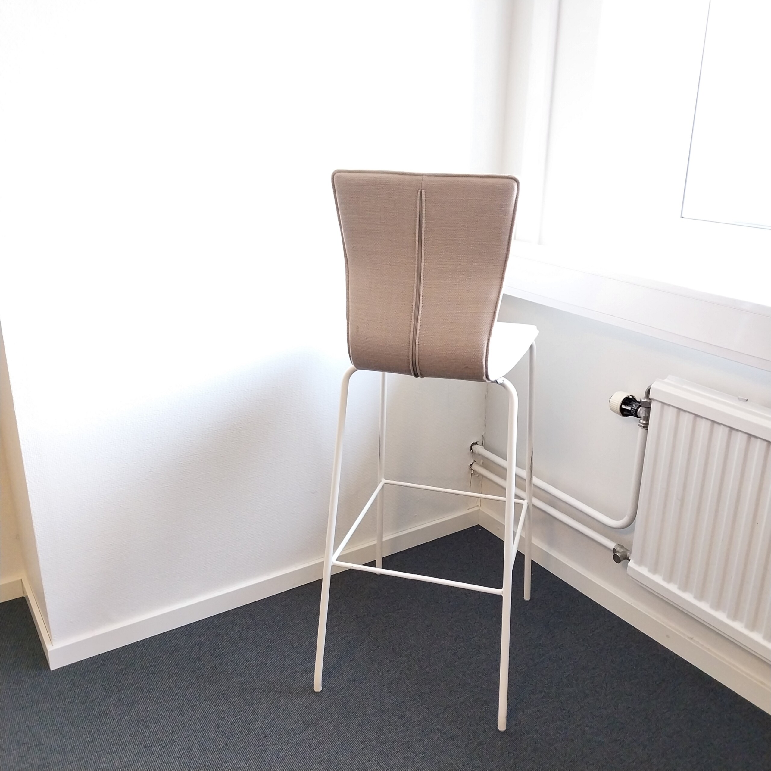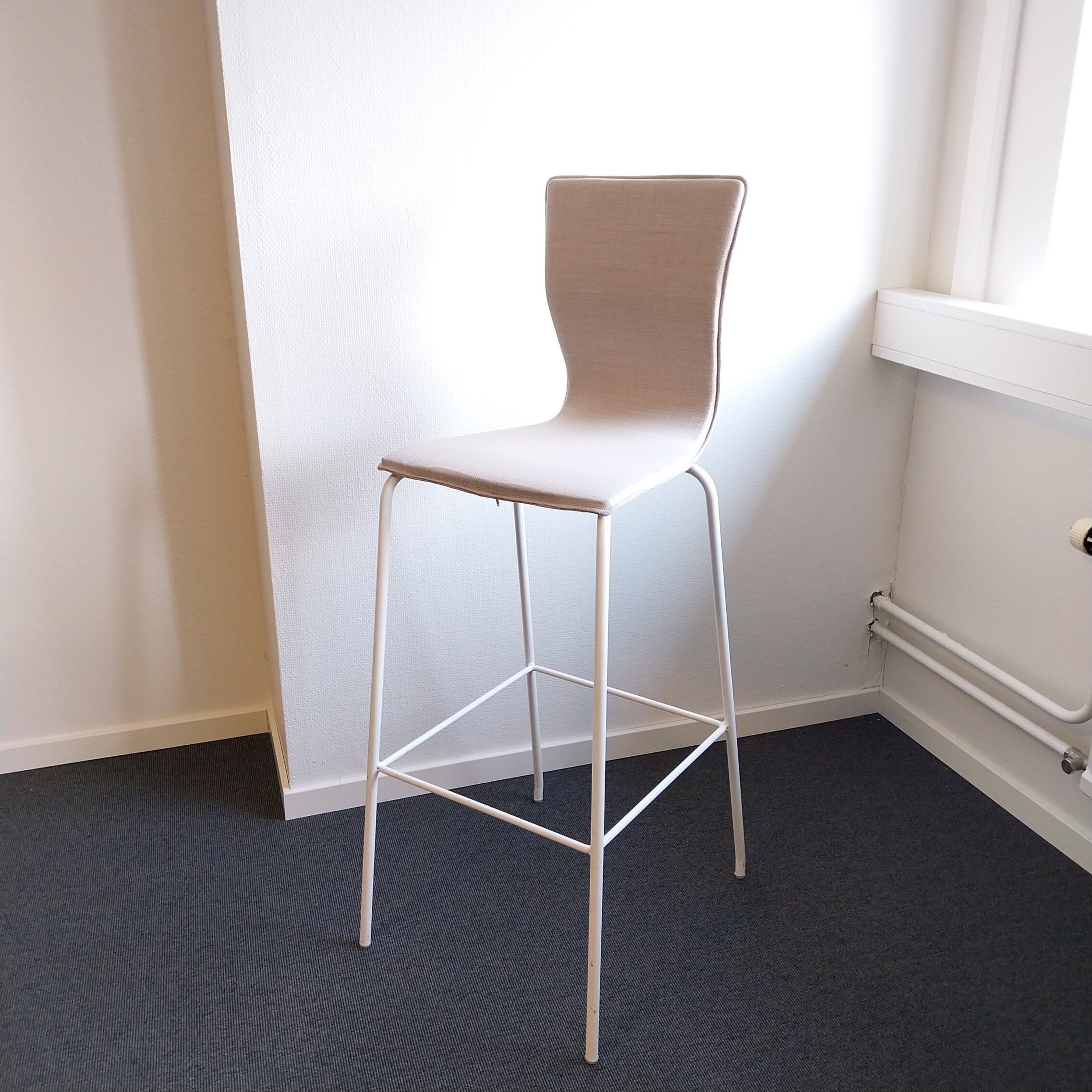 Sete og rygg i stoff (beige). Ben i metall (hvit).