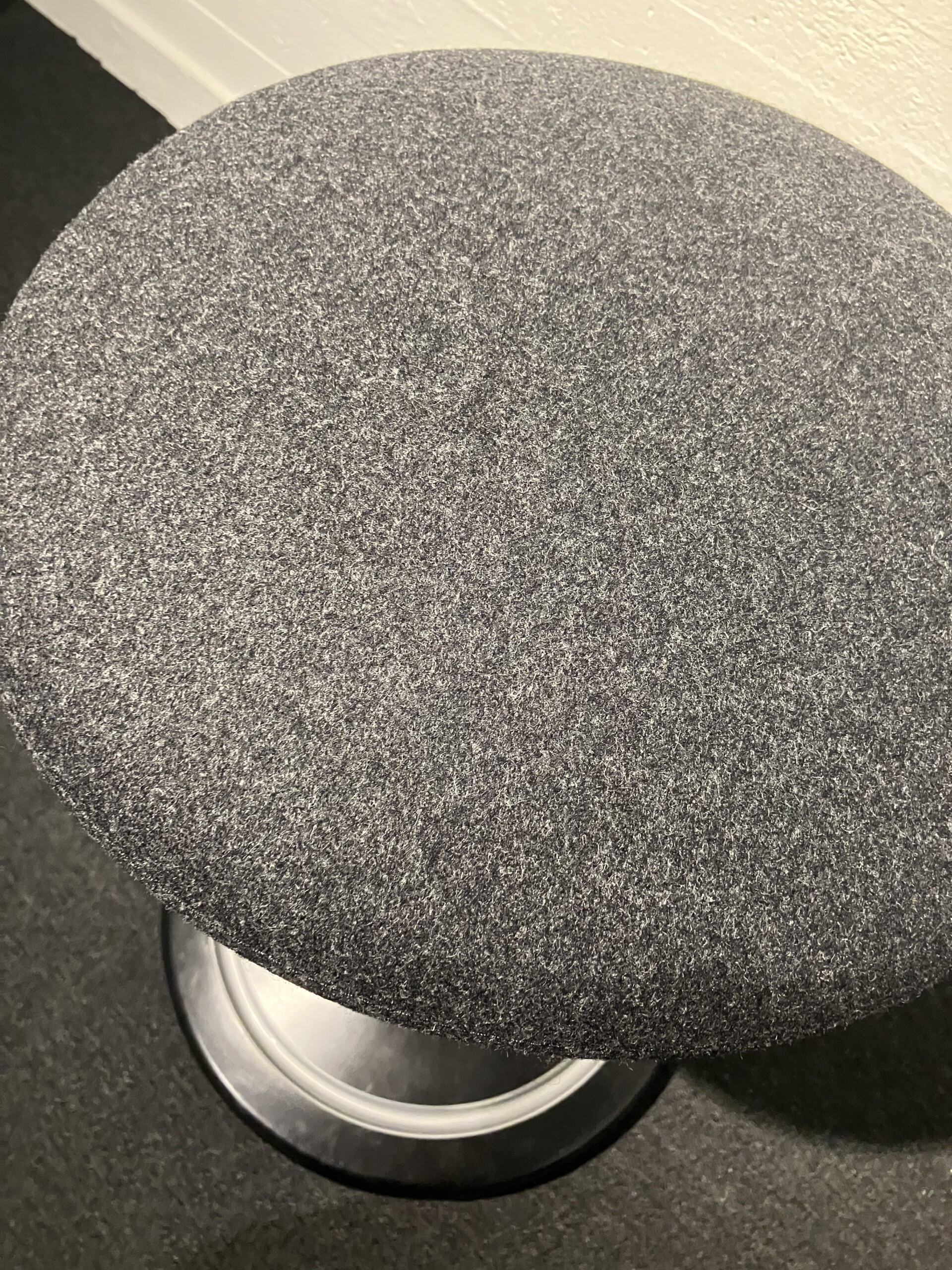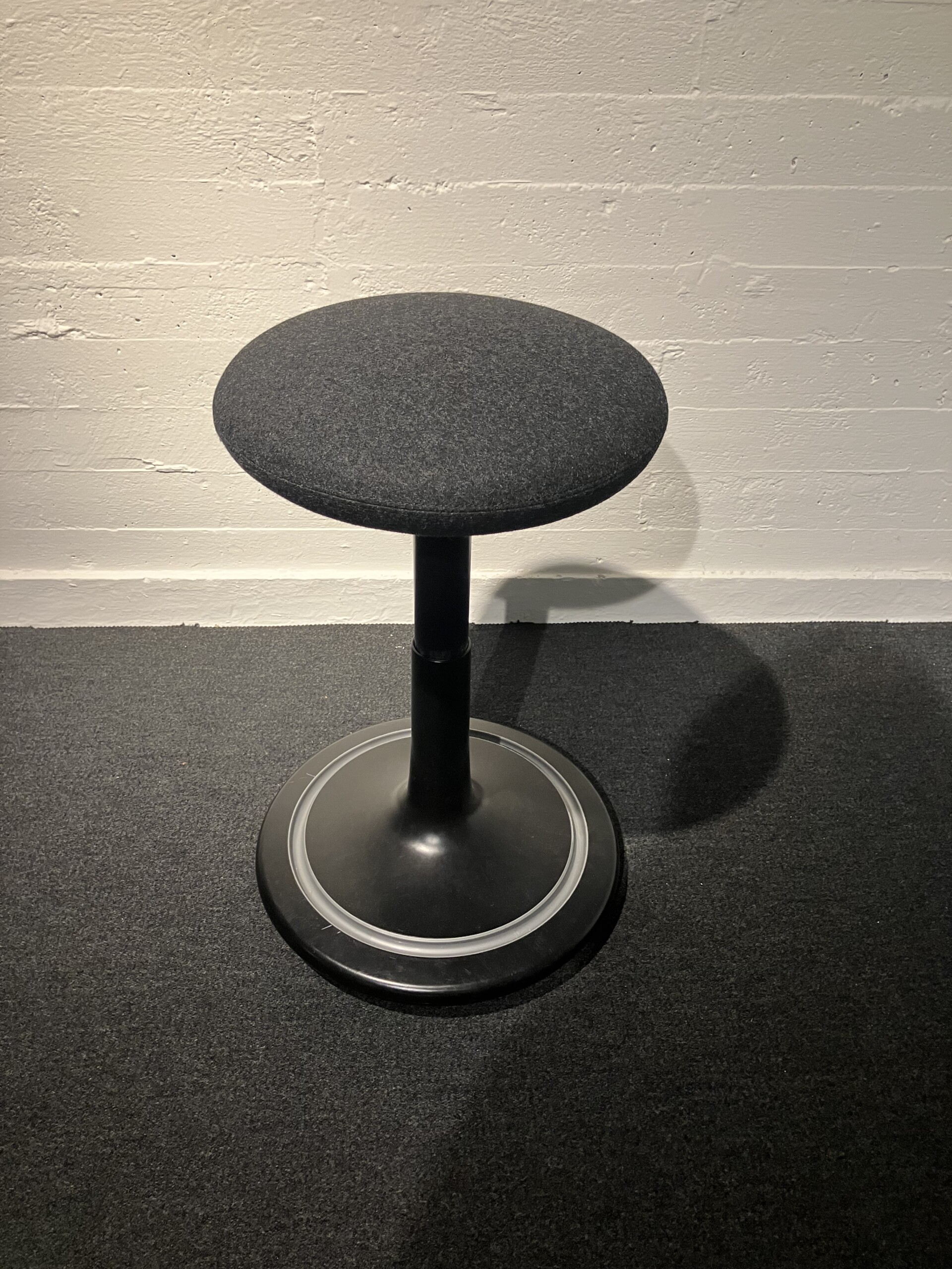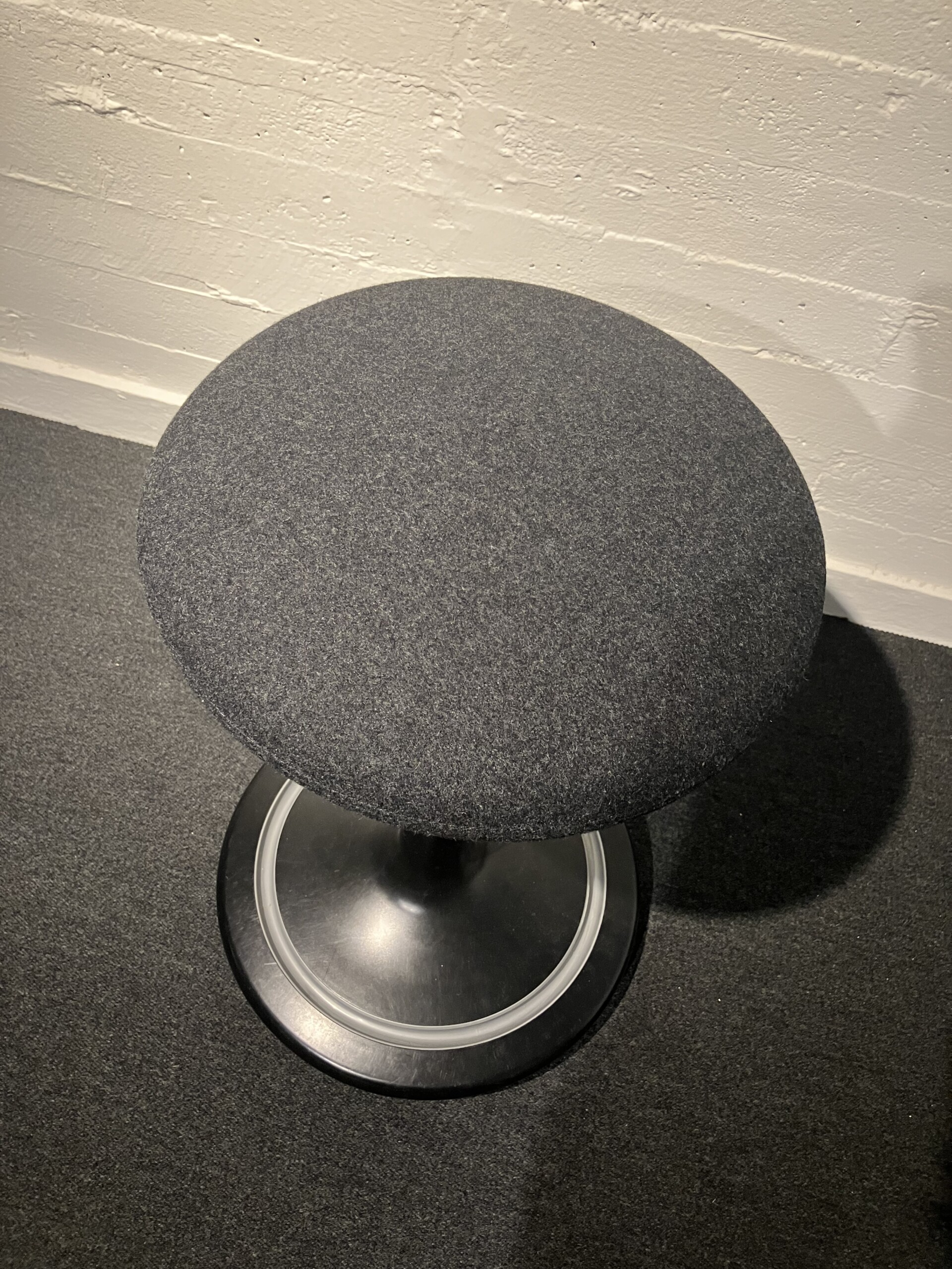 Sete i stoff (grå). Søylefot i metall (svart). Høydejusterbar