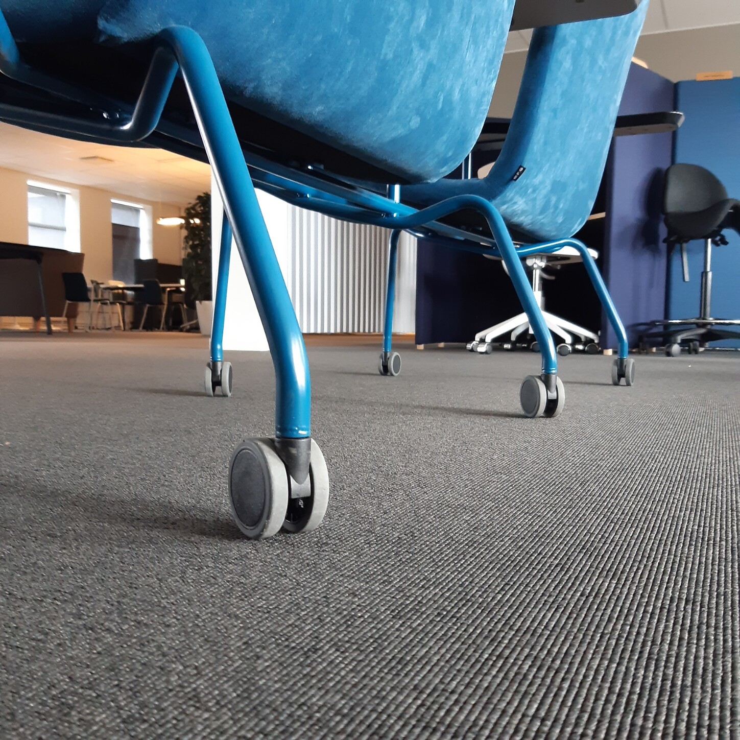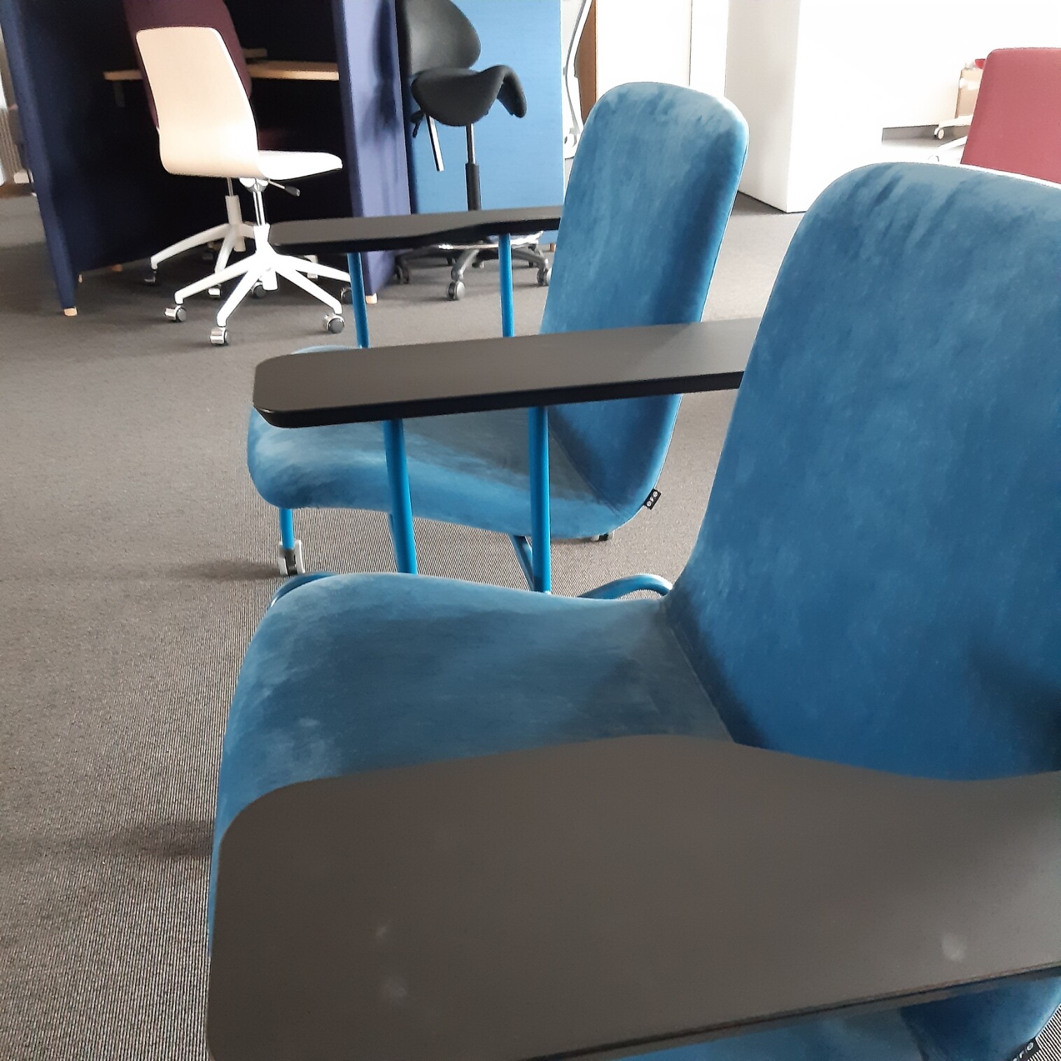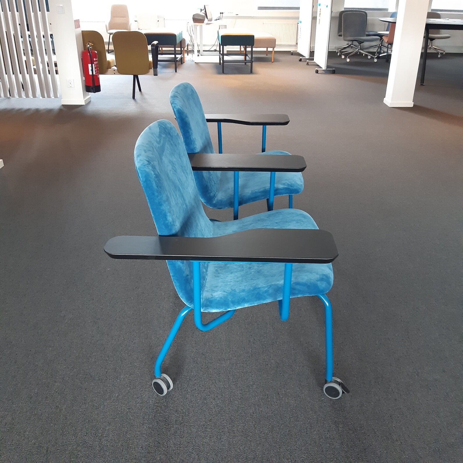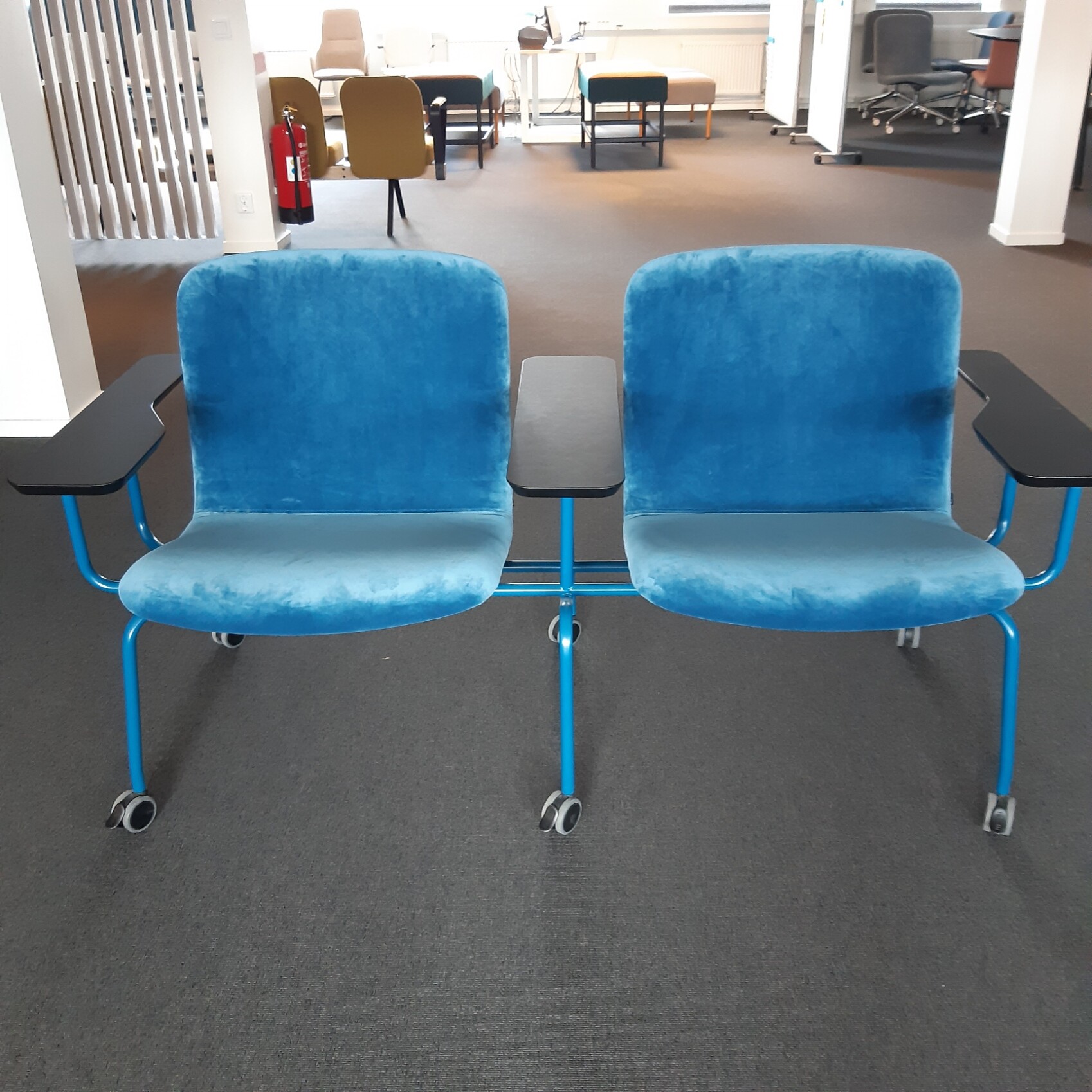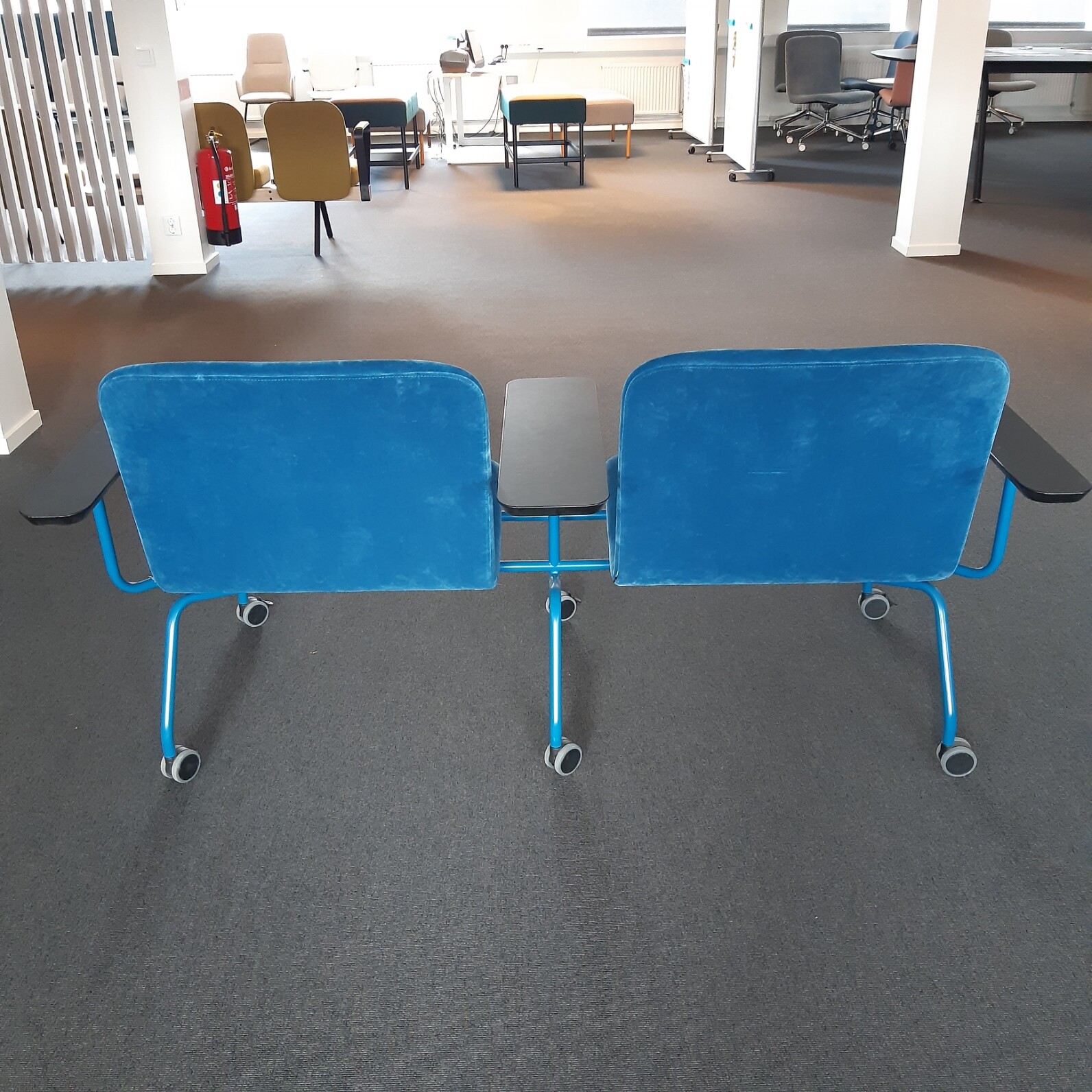 Sete og rygg i stoff (blå). Ben i metall (blå).