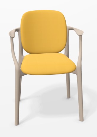 Sete og rygg i kunstskinn (gul). Ben i tre (eik).