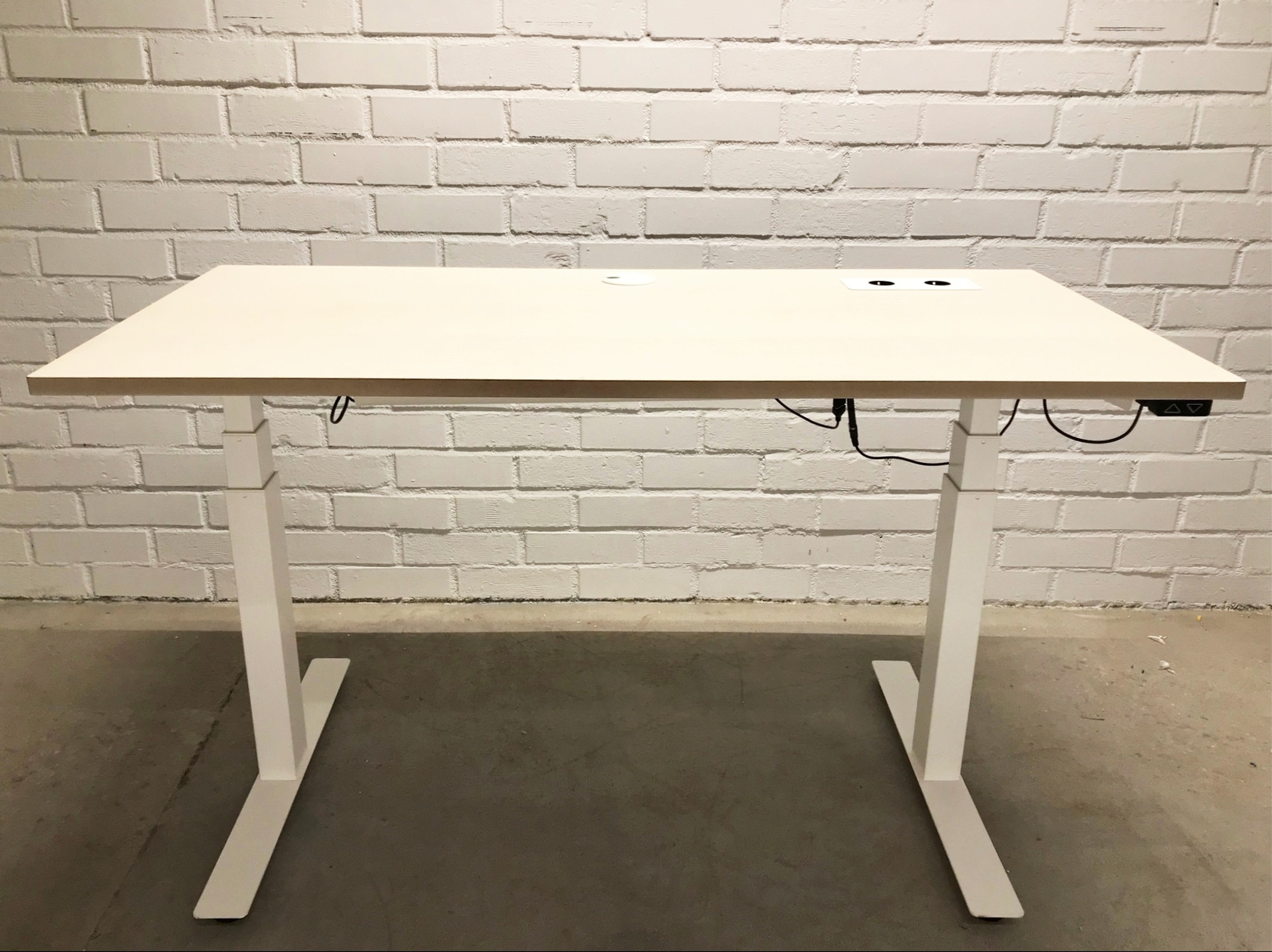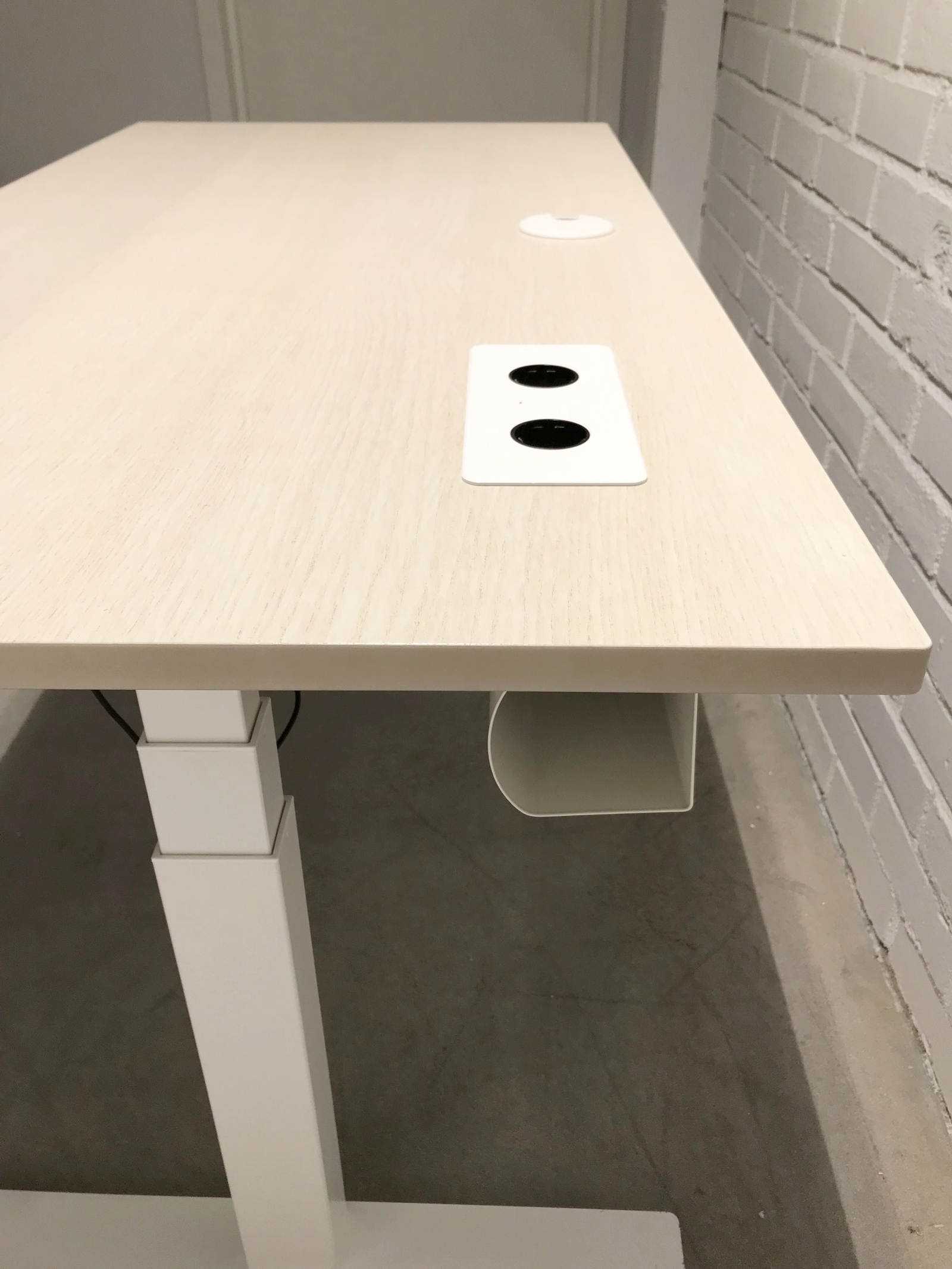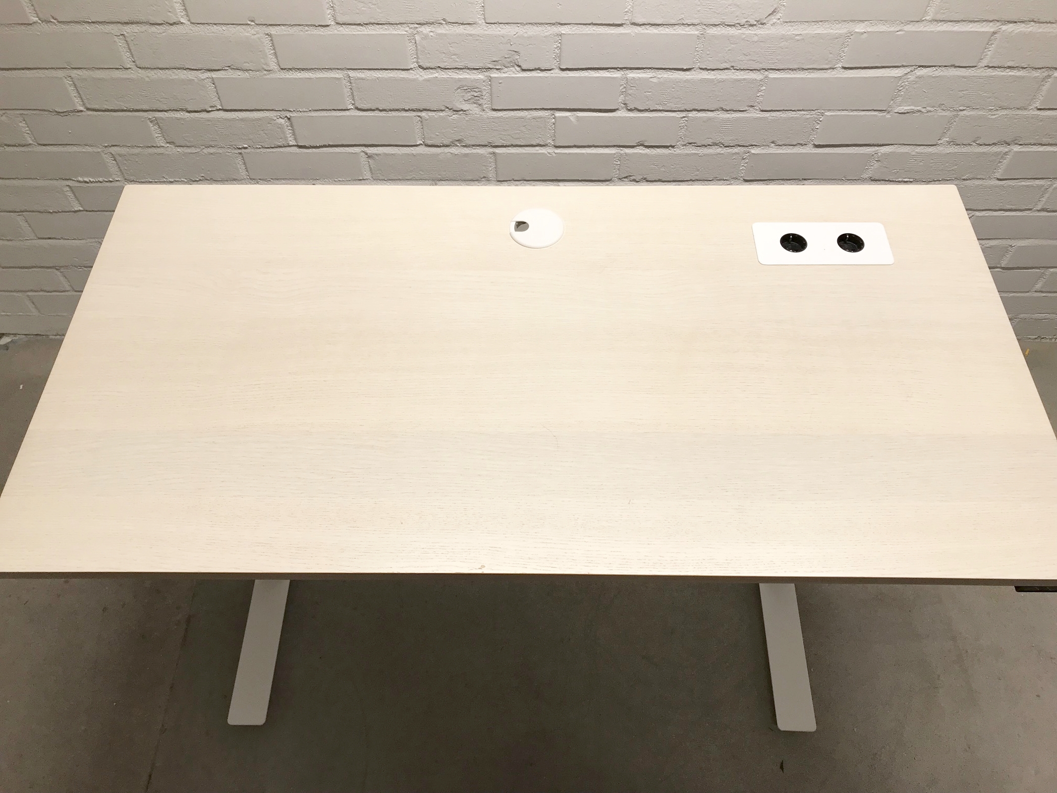 Bordplate i laminat (ask). Understell i metall (hvit). Høydejusterbart.