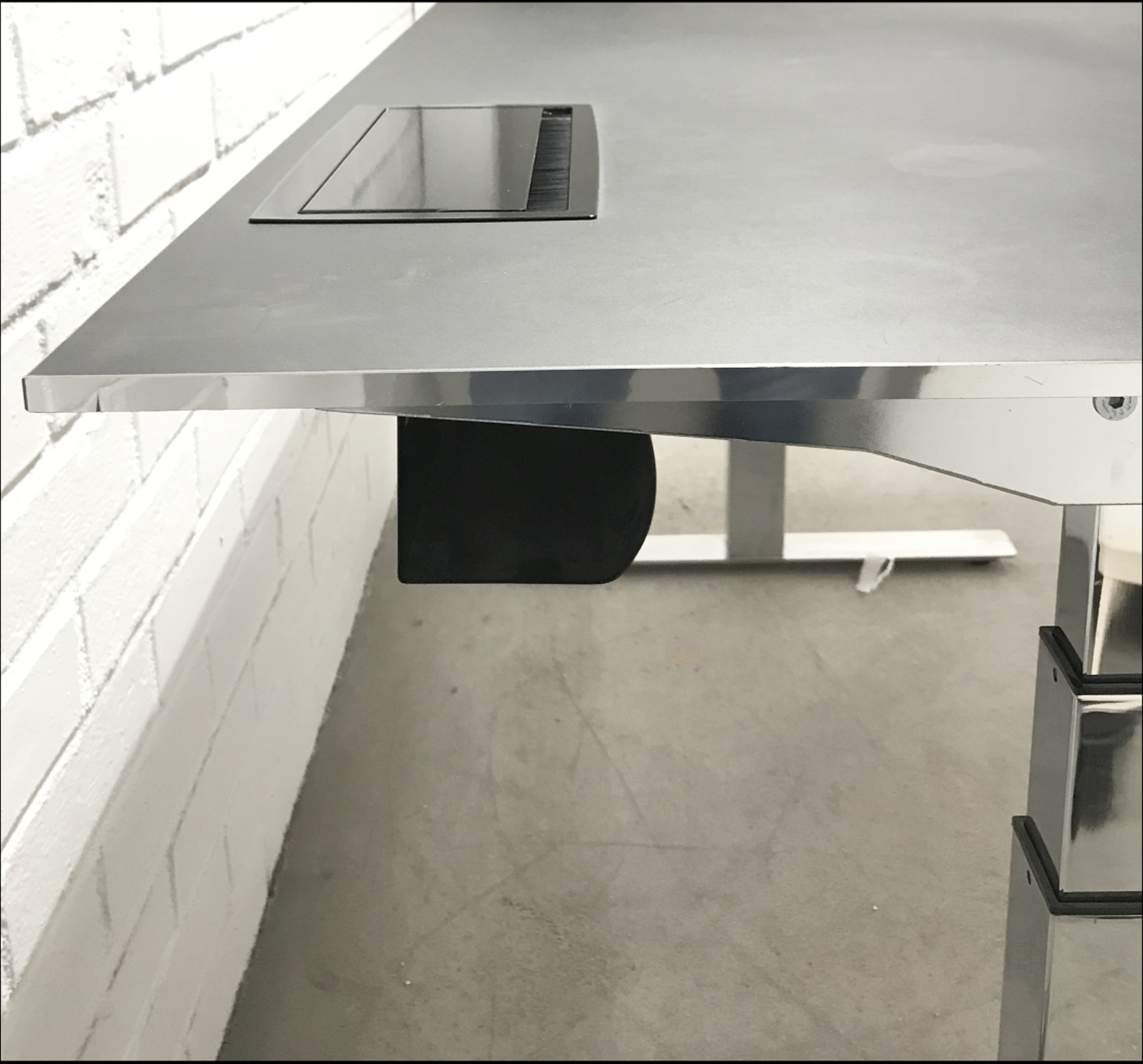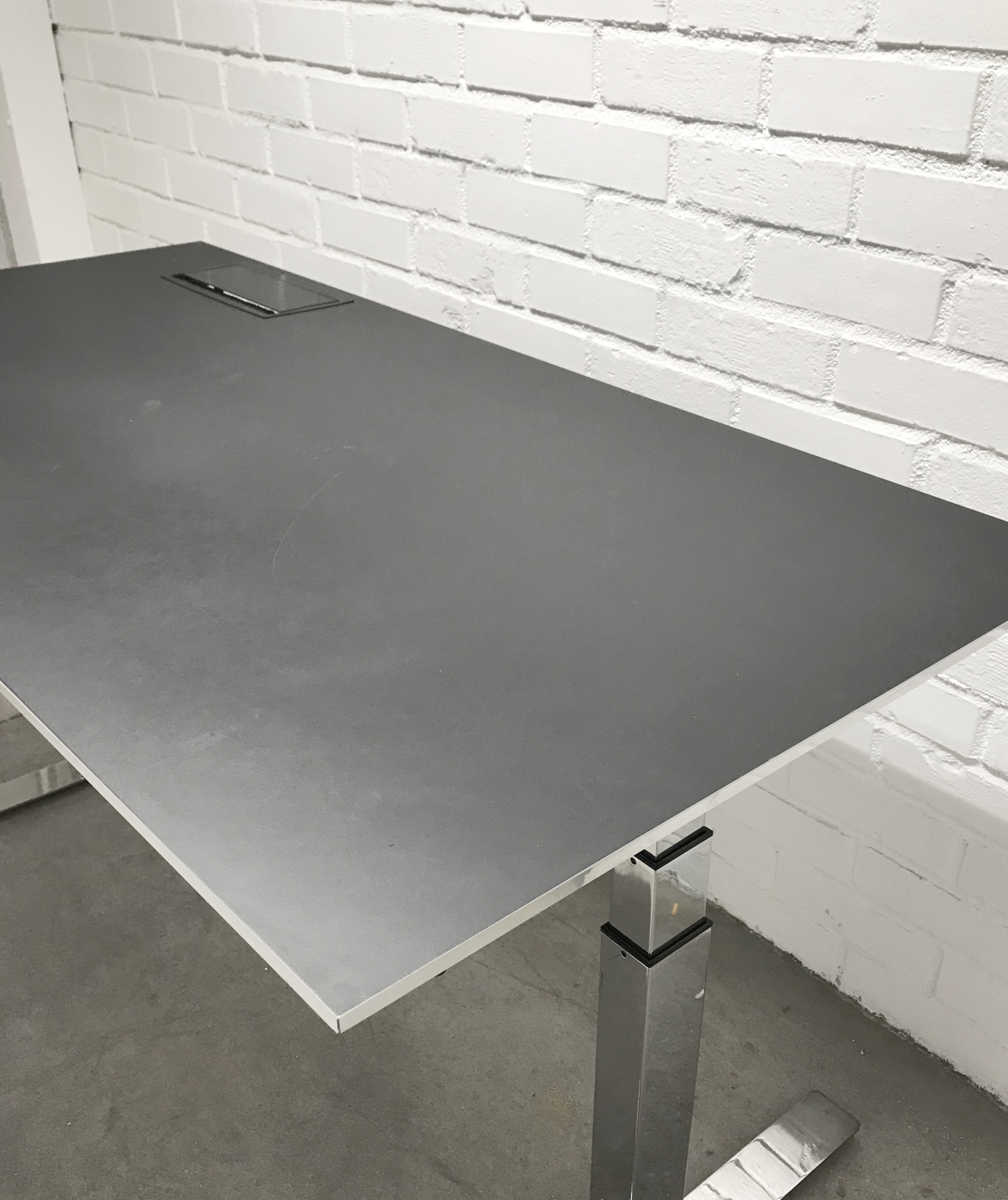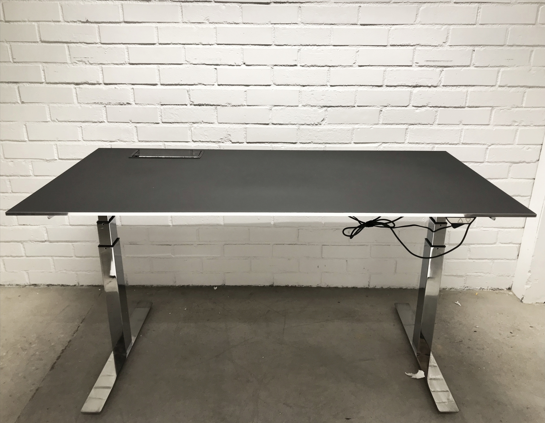 Bordplate i linoleum (svart). Understell i metall (krom). Høydejusterbart.