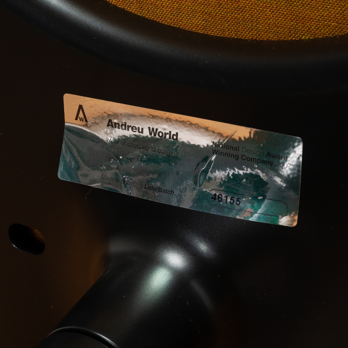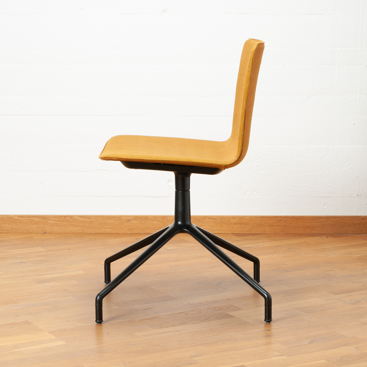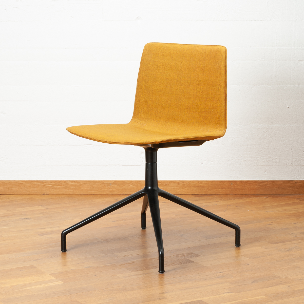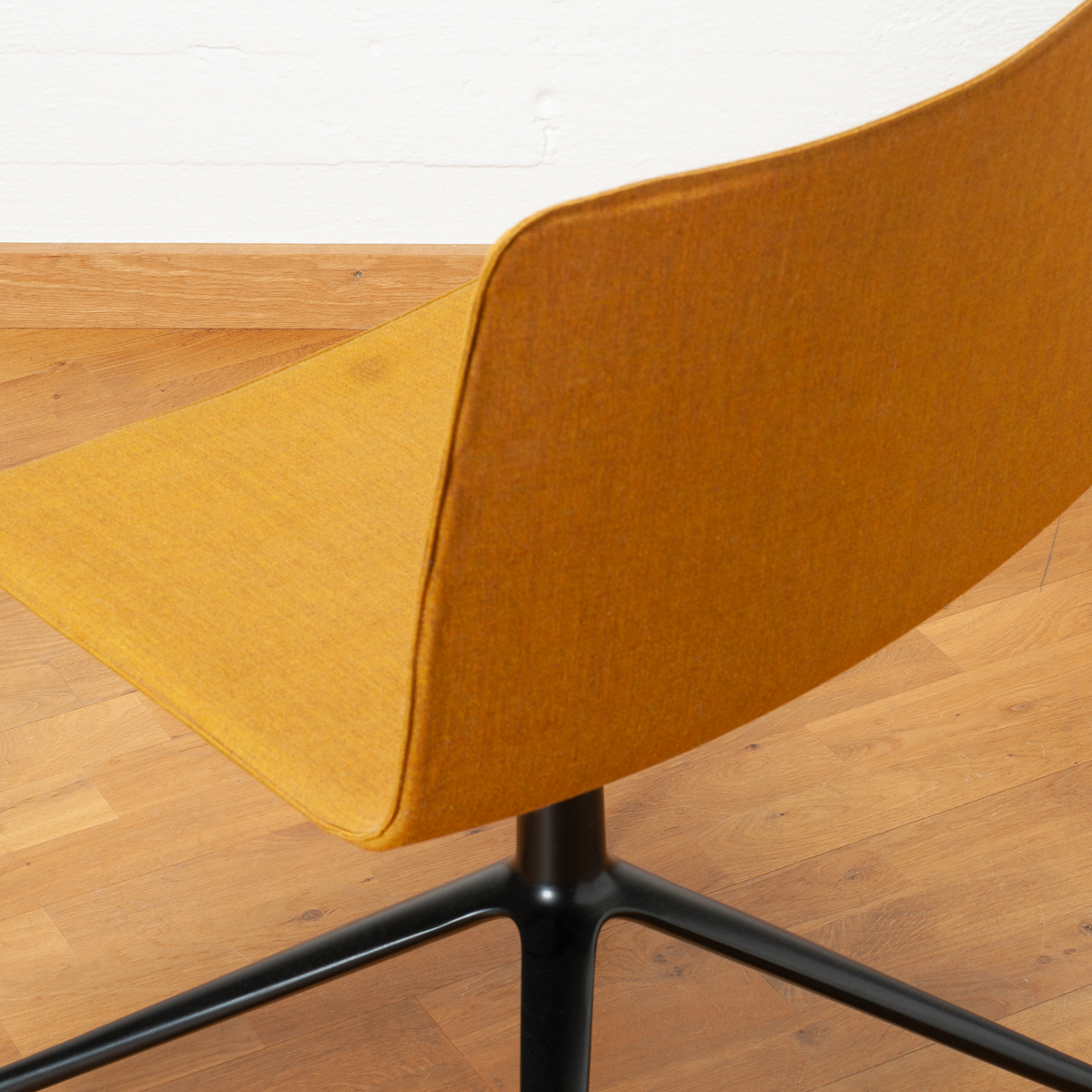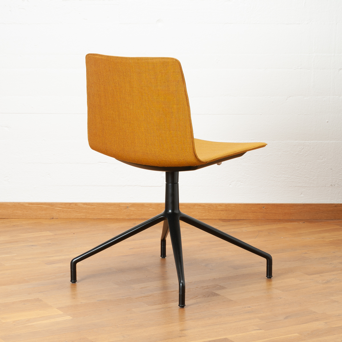 Sete og rygg i stoff (oransje). Kryssfot i metall (svart).